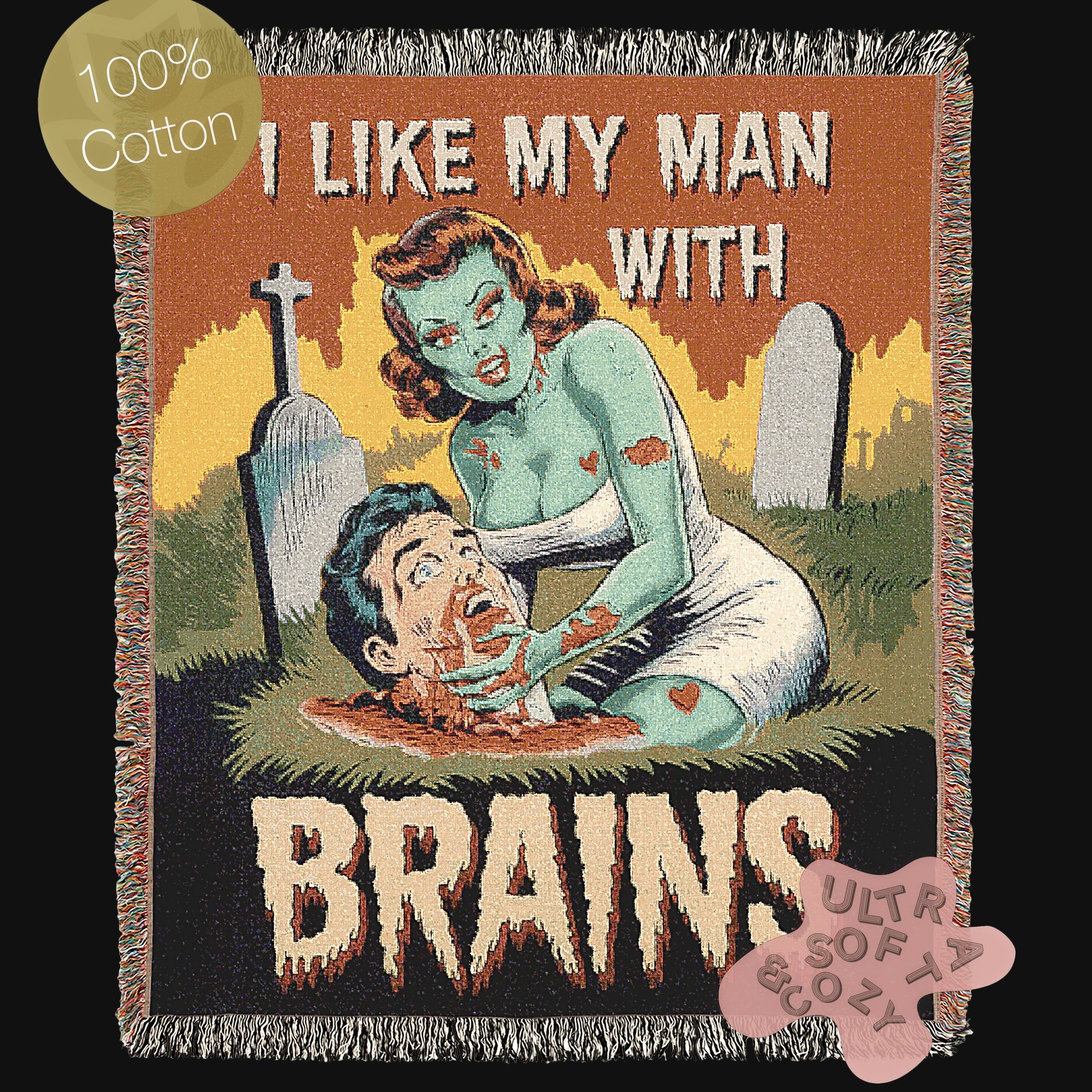 This funny zombie tapestry combines horror movie and 70s comic book vibes with gothic decor in a woven cotton throw. Featuring a playful zombie design perfect for Halloween lovers and horror fans, this large wall tapestry doubles as cozy grunge dorm decor or a standout piece for your horror-inspired space. A perfect unique horror gift for zombie lovers and collectors.