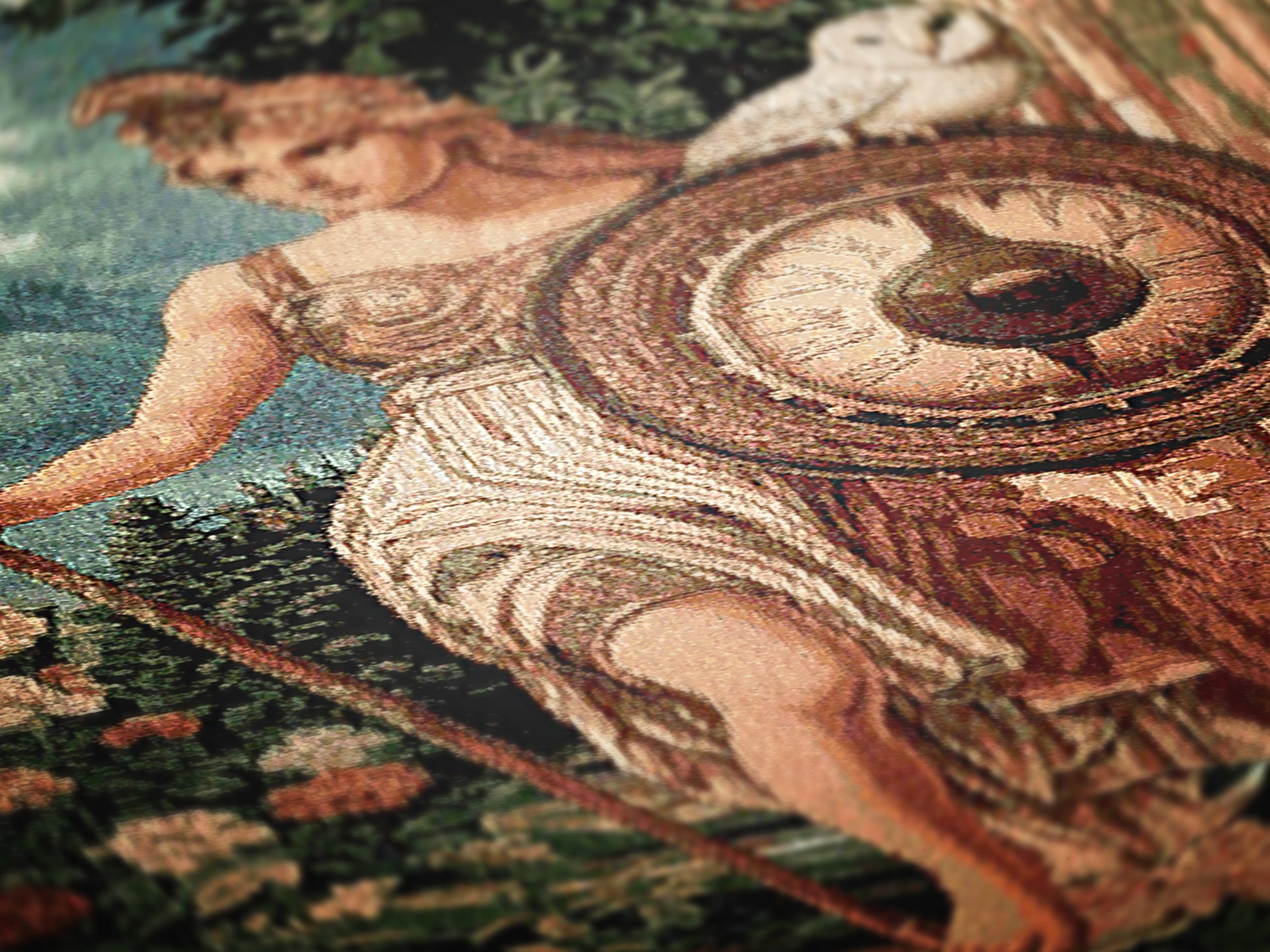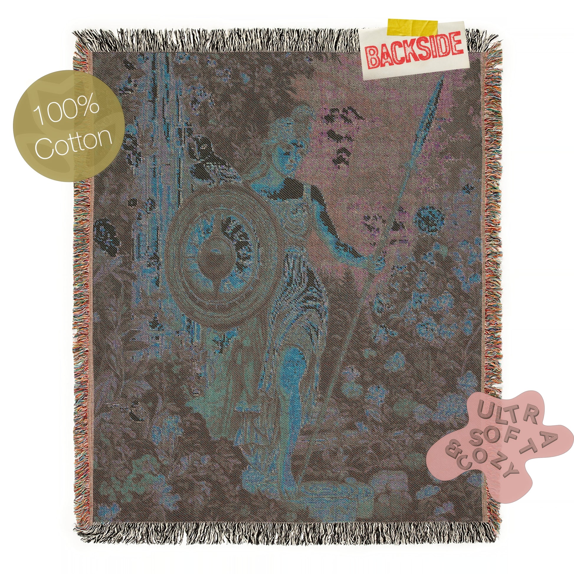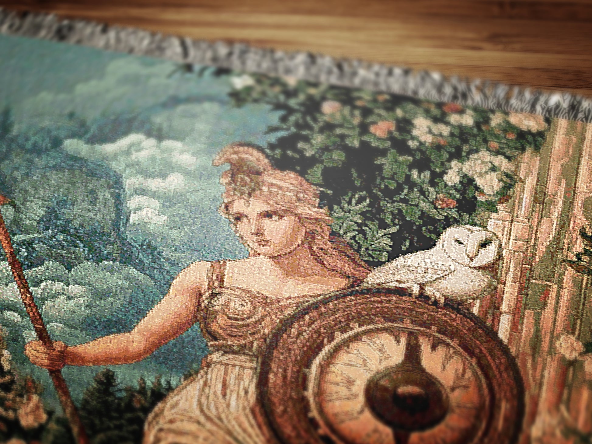 🛡️ Features Athena with owl, shield, and classical motifs in a rich woven design