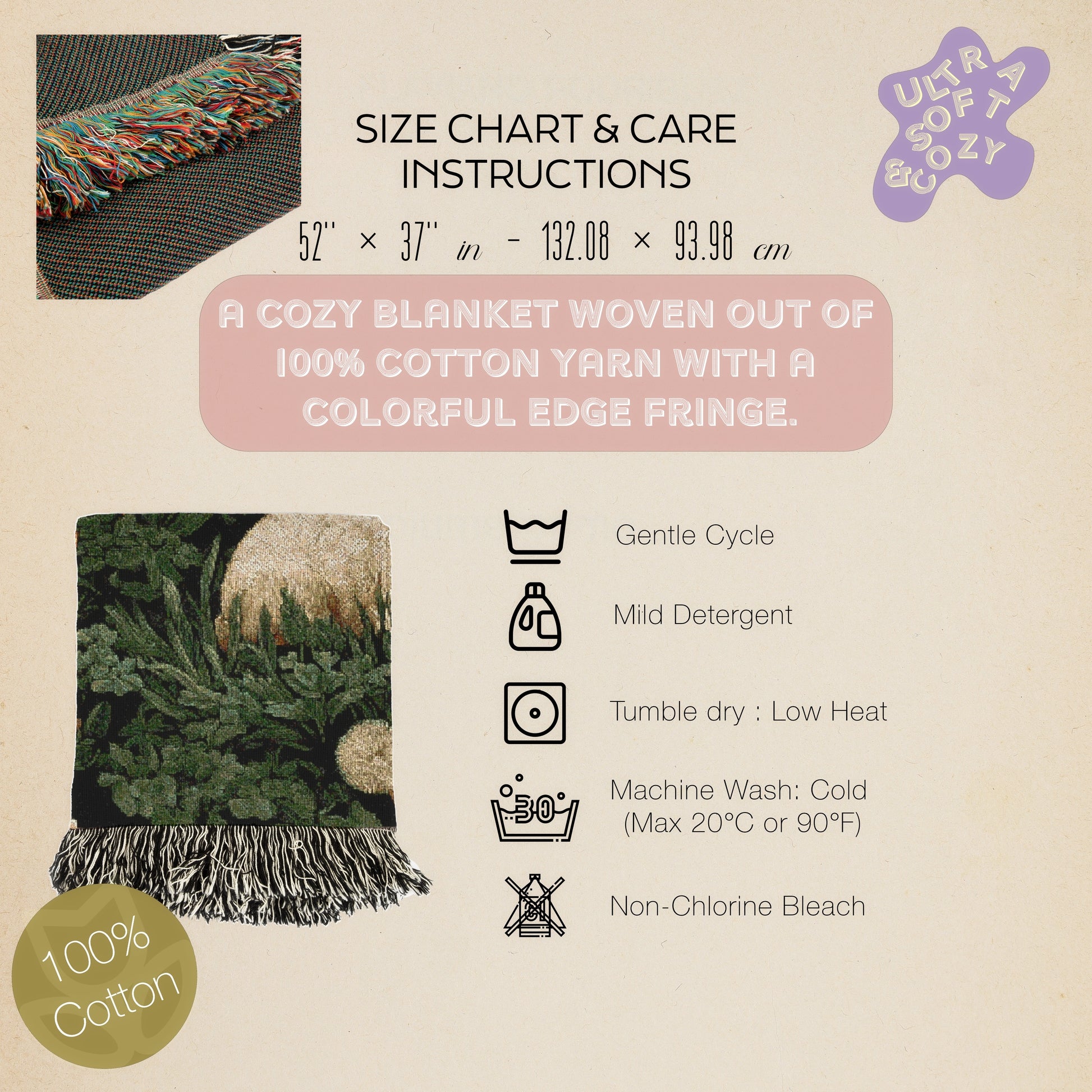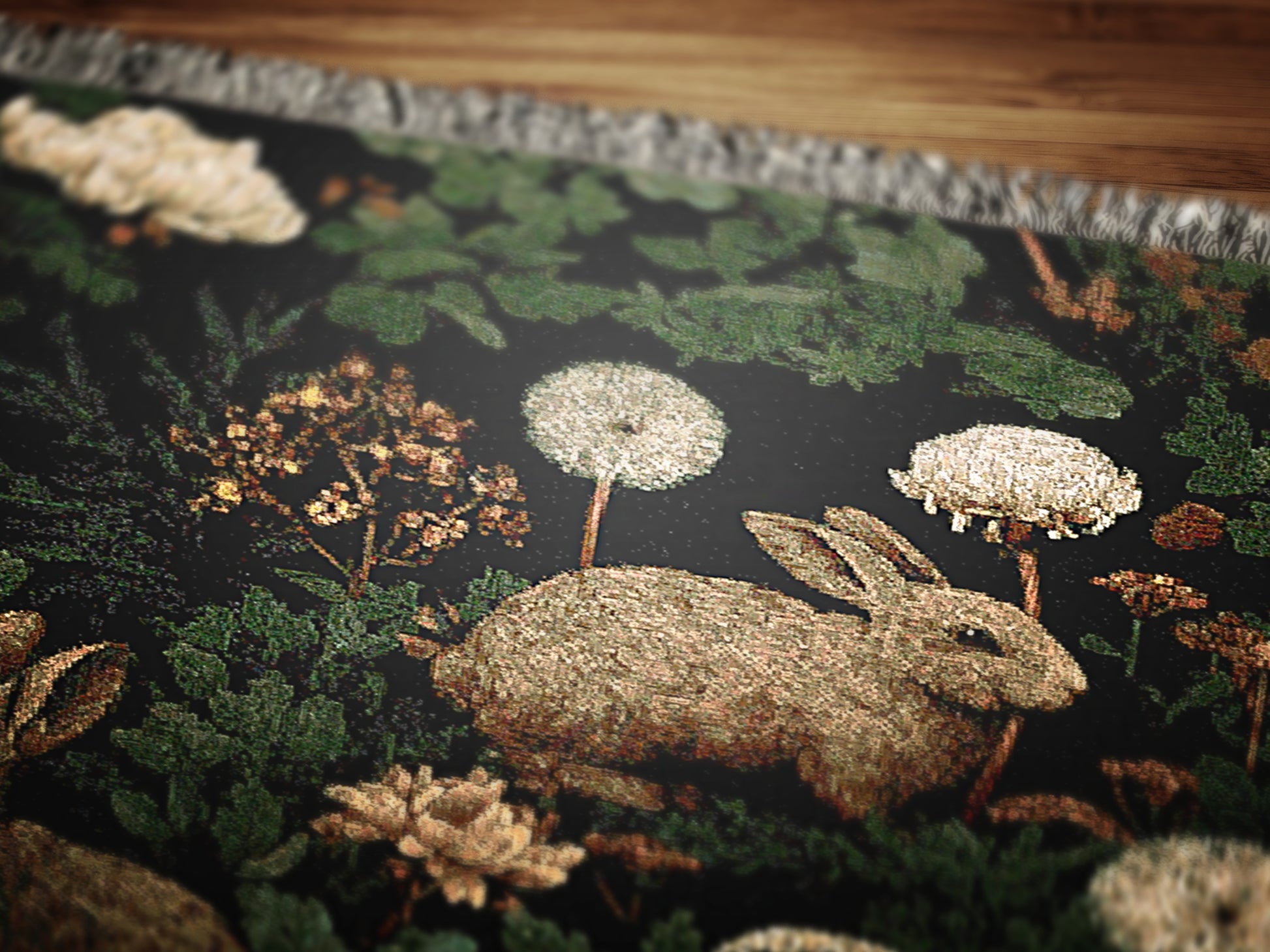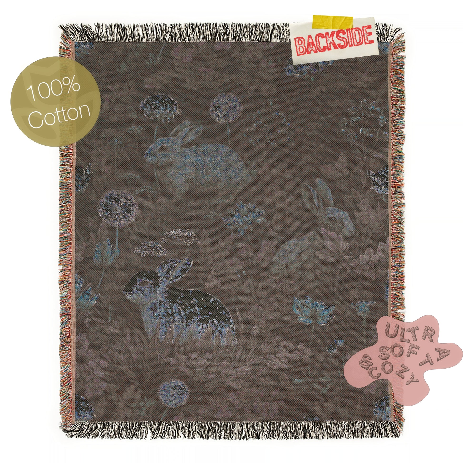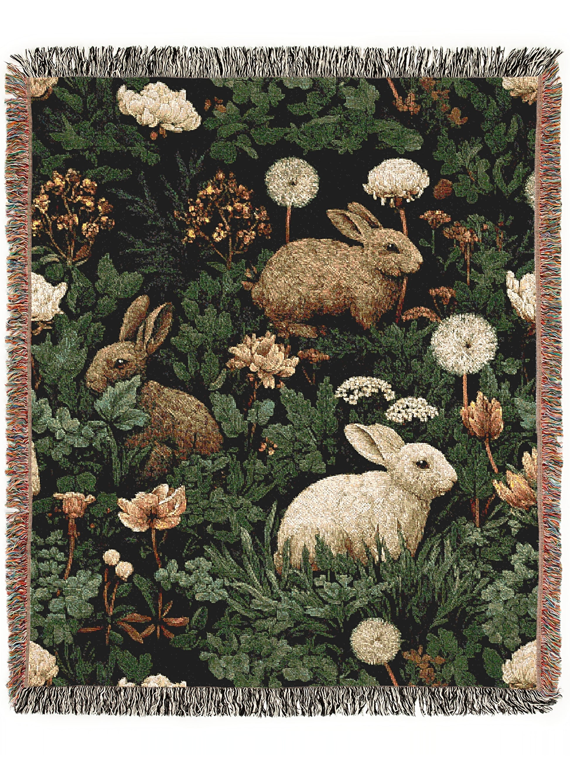 This enchanting rabbit throw blanket features a vintage-inspired design of woodland bunnies nestled among lush botanicals and dandelions. Crafted as a large wall tapestry or woven throw blanket, it brings the perfect touch of antique tapestry charm and forestcore coziness to any space. Whether styled on a bed, draped on a couch, or displayed as woven wall art, this piece infuses your home with whimsigoth decor and medieval forest magic.