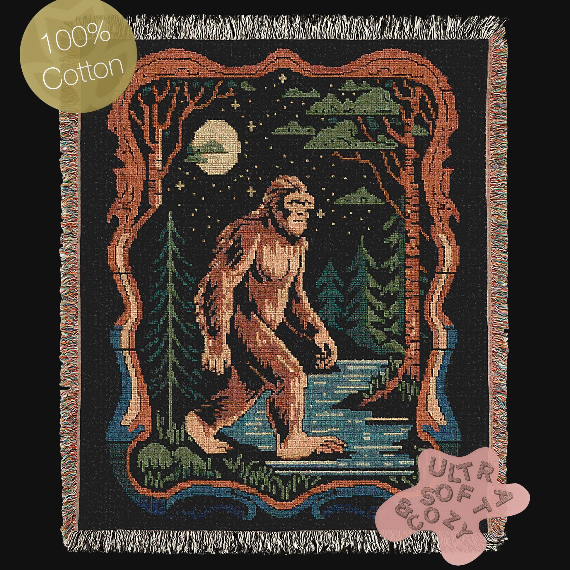 Bigfoot Jacquard Woven Blanket, Retro Cross Stitch Inspired Cryptid Throw Tapestry, Spooky Sasquatch Monster Decor, Cryptozoology Gift