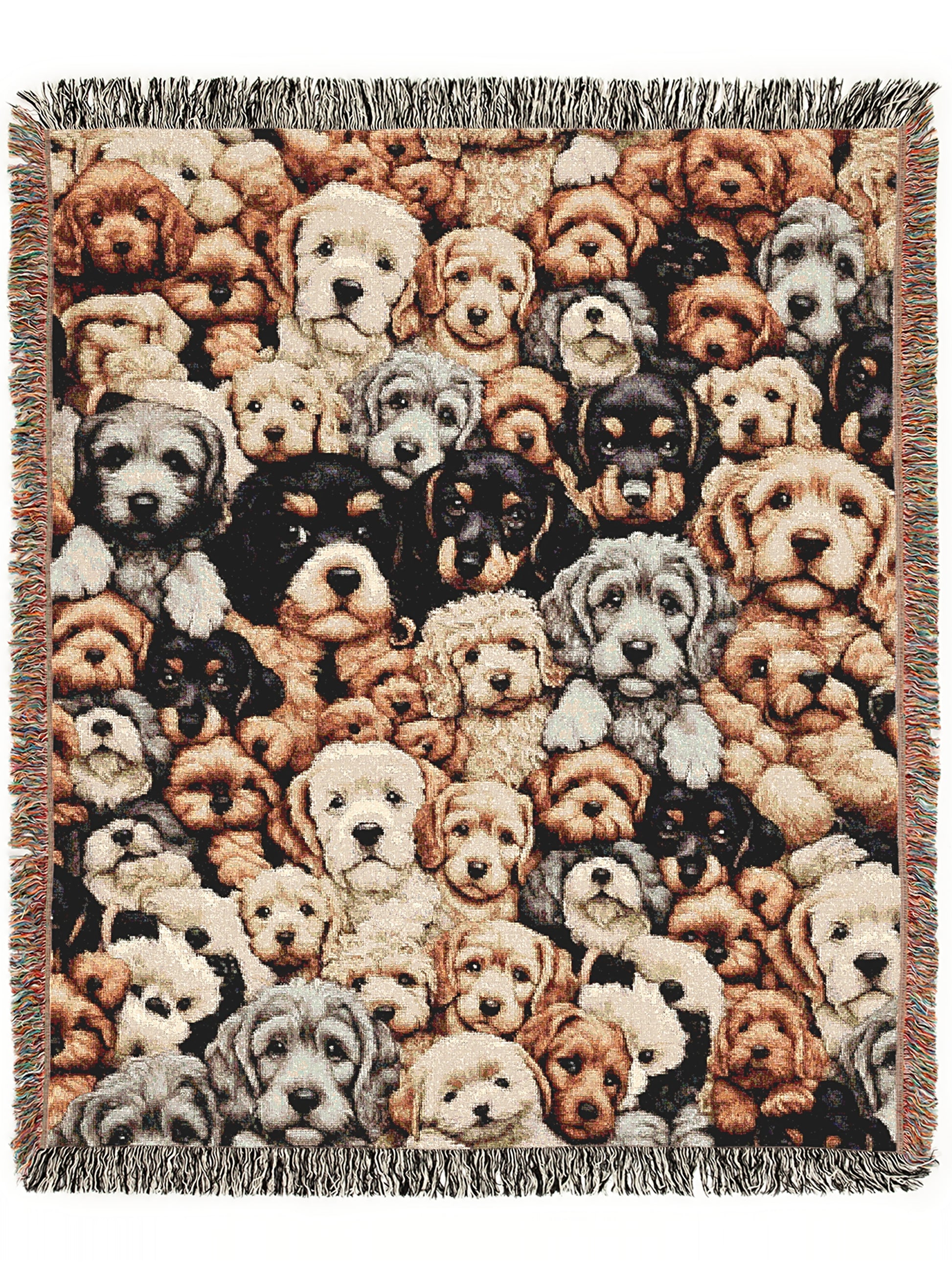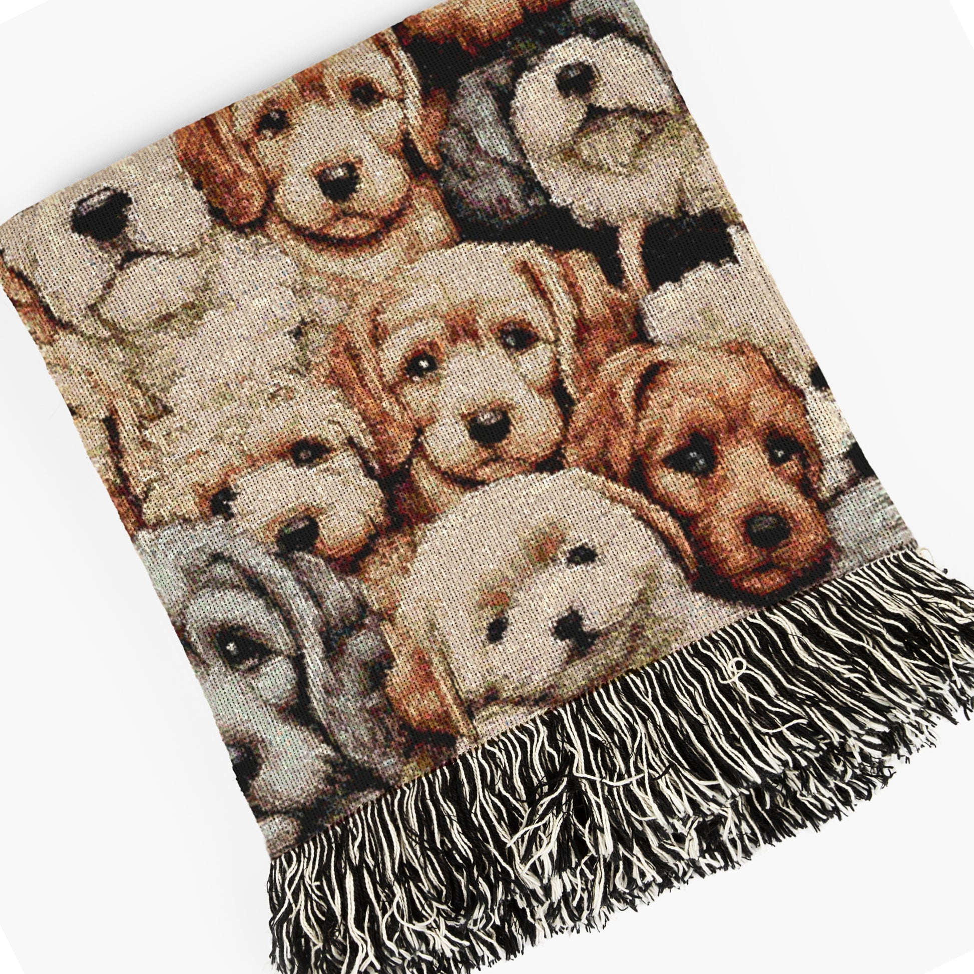 This large woven throw tapestry features a funny and themed design of adorable dogs and puppies. Crafted with durable jacquard fabric, it's perfect for the couch, bed, or wall. A cozy and decorative option for dog lovers and home dรฉcor enthusiasts ๐ถ.