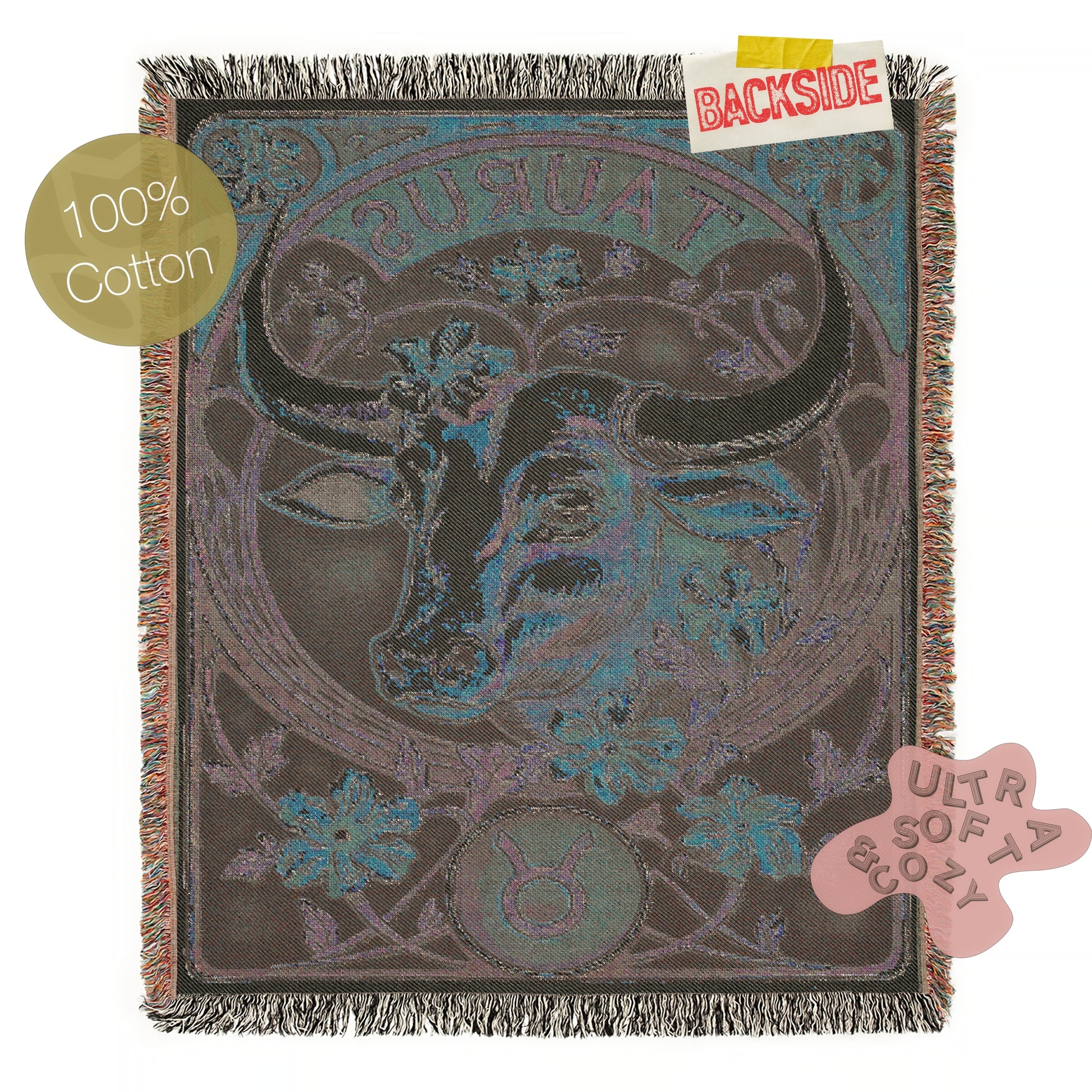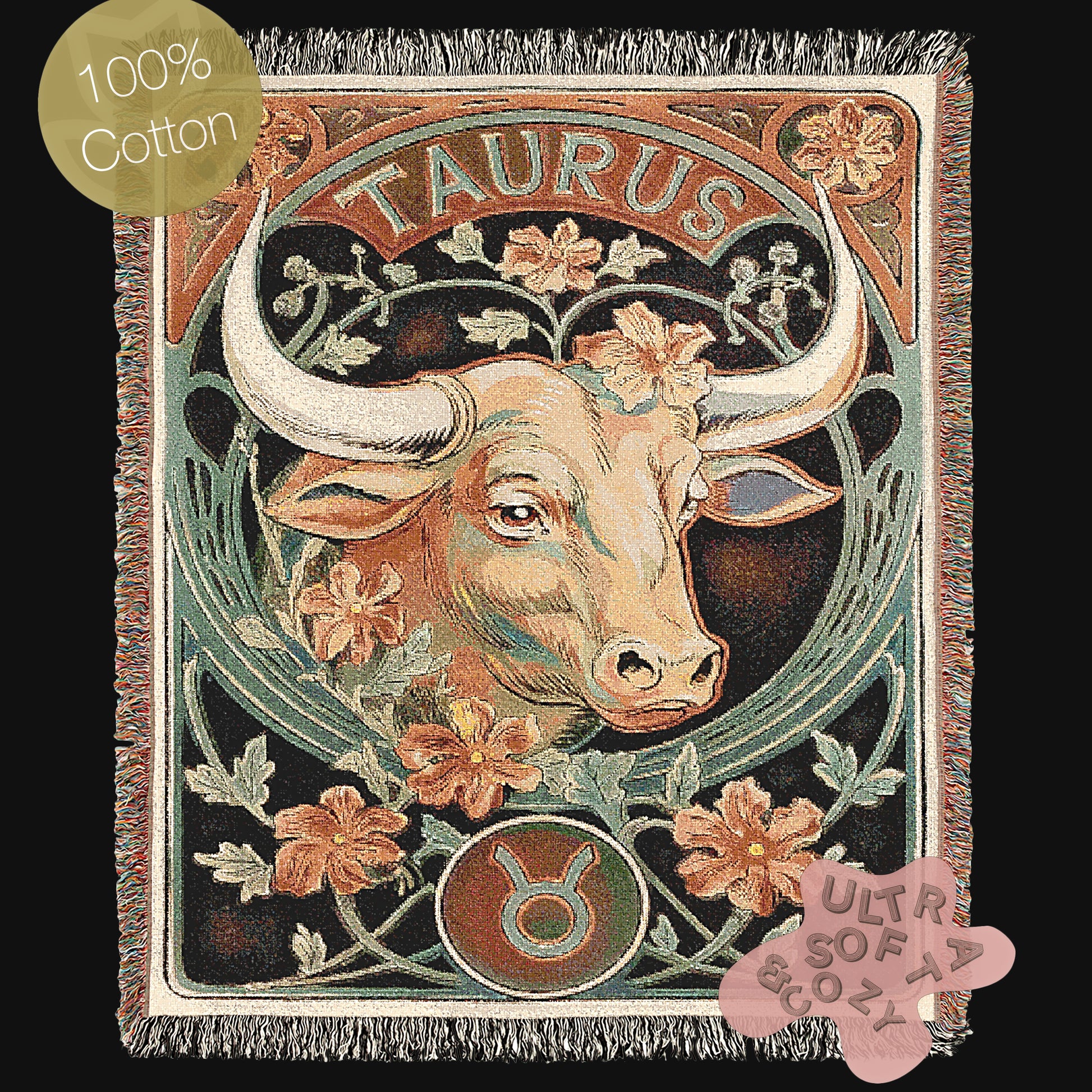 Art Nouveau Zodiac Woven Fringe Blanket, Taurus Tapestry, Zodiac Astro Signs Oversized Blanket, Woven Fringe Throw, Taurus Gift