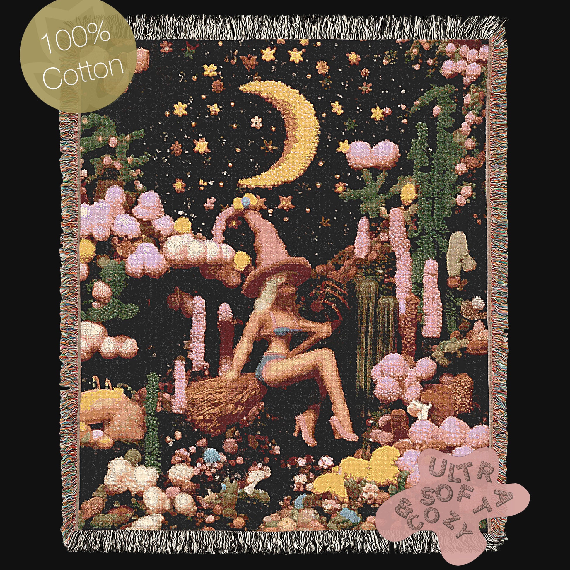 This surrealist woven throw blanket features a dreamy bohemian psychedelic witch lounging on her broomstick, surrounded by glowing mushrooms, celestial stars, and a golden crescent moon. A perfect mix of cottagecore, witchy, and whimsical fantasy decor, this vibrant witch tapestry brings a magical, surreal aesthetic to any space. Whether used as a cozy sofa throw, bedspread, or wall hanging, this artwork is ideal for mystics, moon lovers, and fans of otherworldly designs. A thoughtful witch gift for those who embrace nature, lunar energy, and the wonders of the unseen realm.
