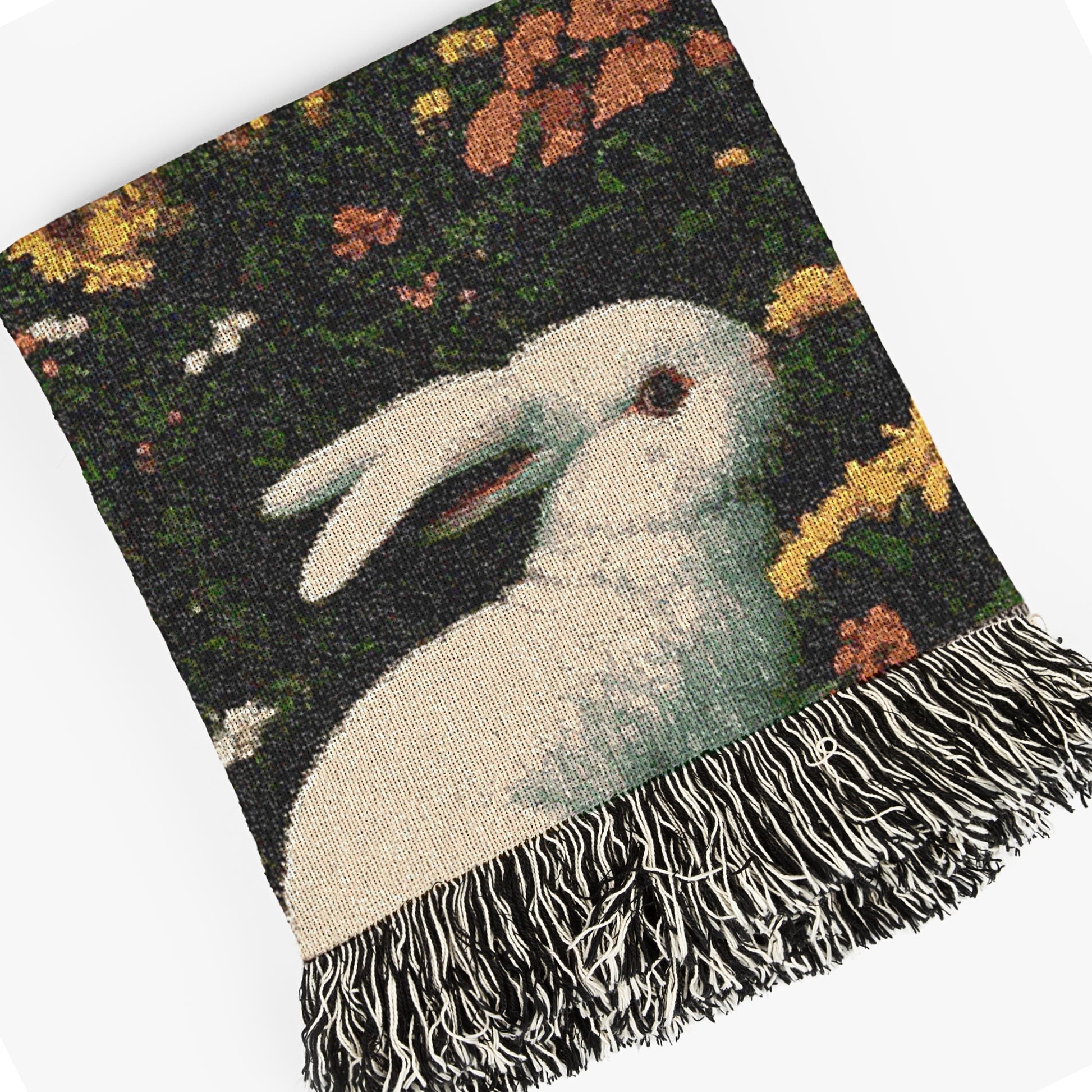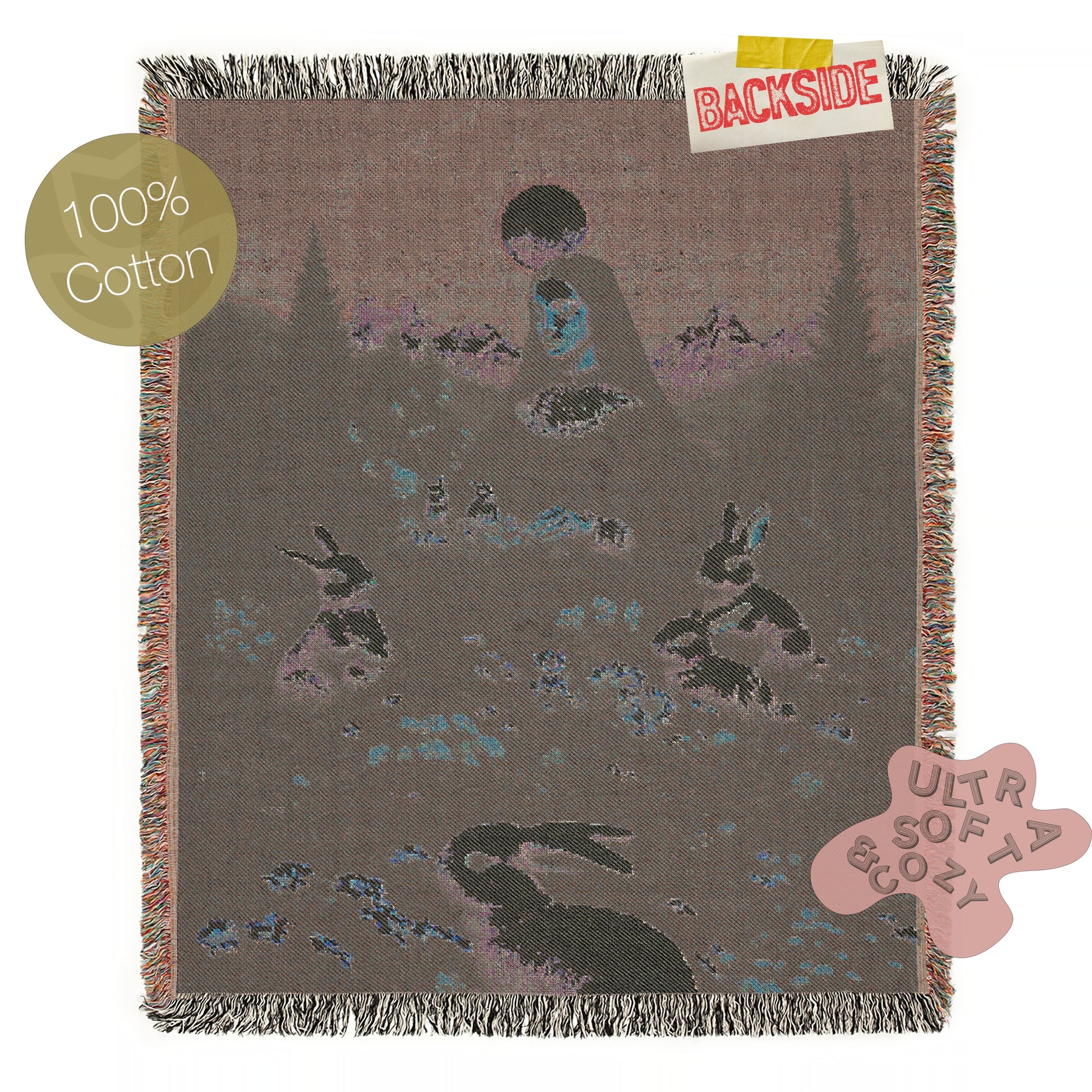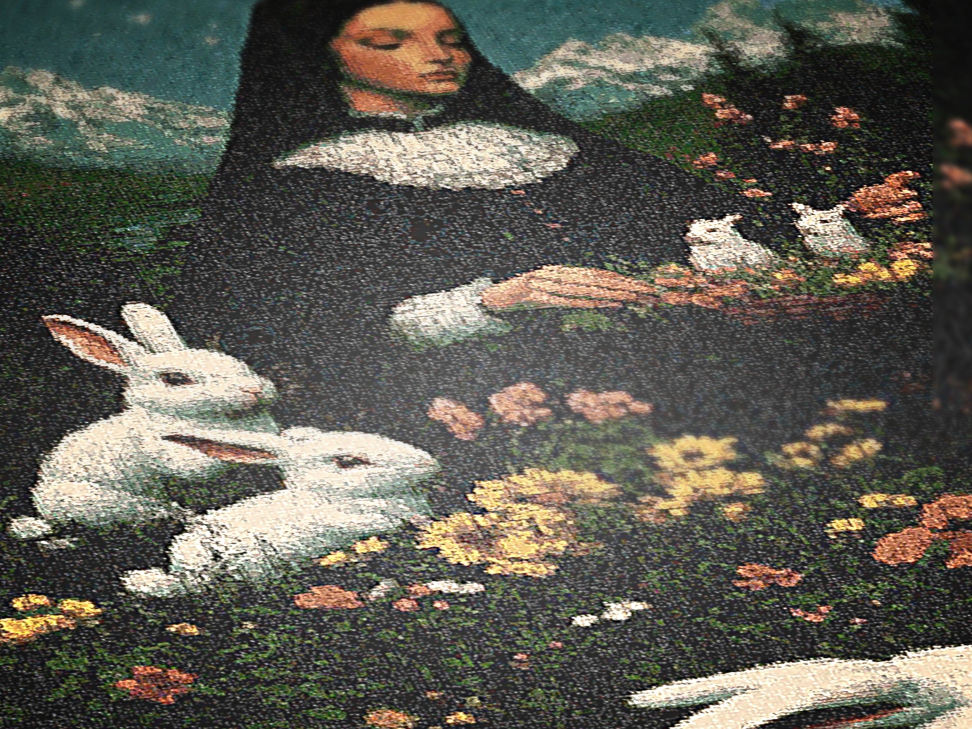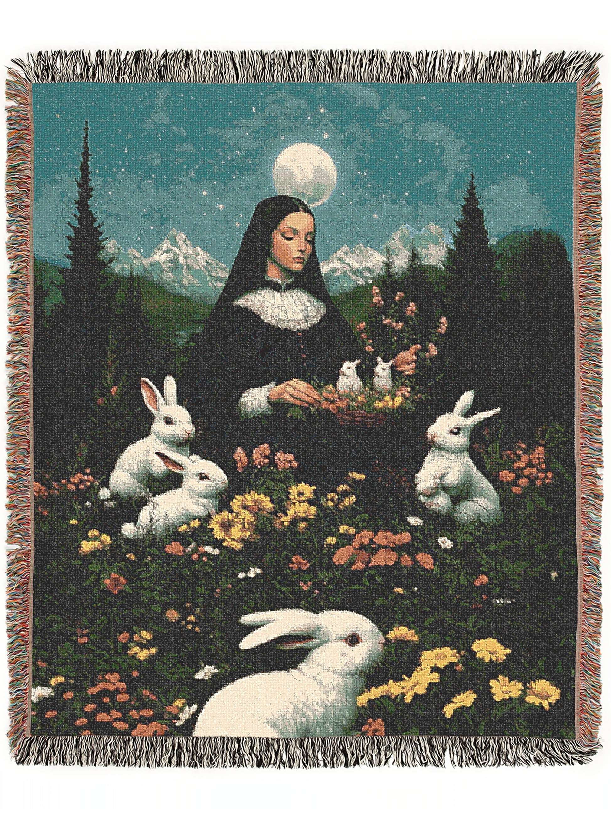 🌙 Mystical woven blanket featuring a nun, rabbits, and a moonlit pastoral scene