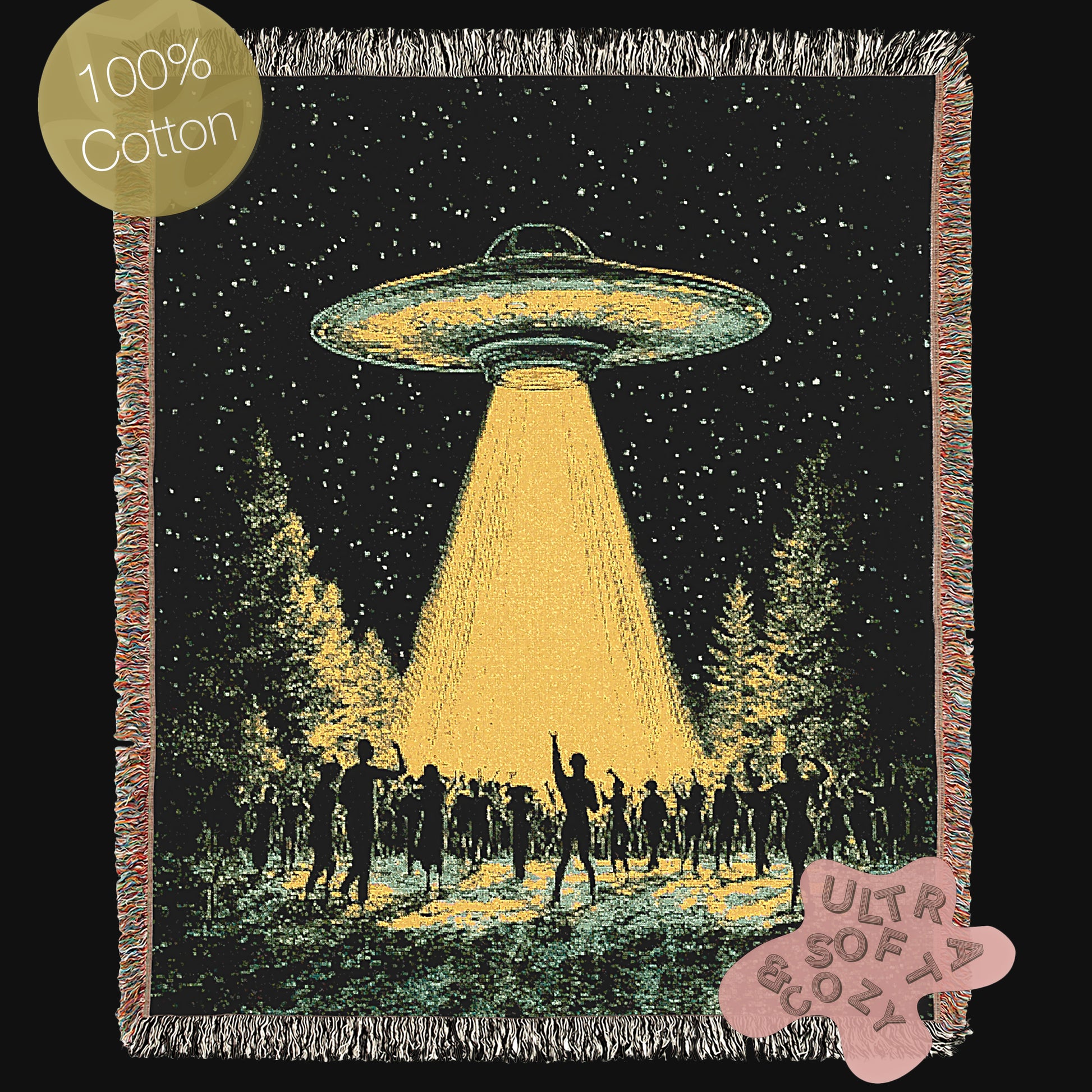 UFO Abduction At Music Festival Woven Blanket, Cotton Woven Couch Throw, Sci-Fi Home Decor, Weirdcore Funny Tapestry Alien Room Art Gifts,