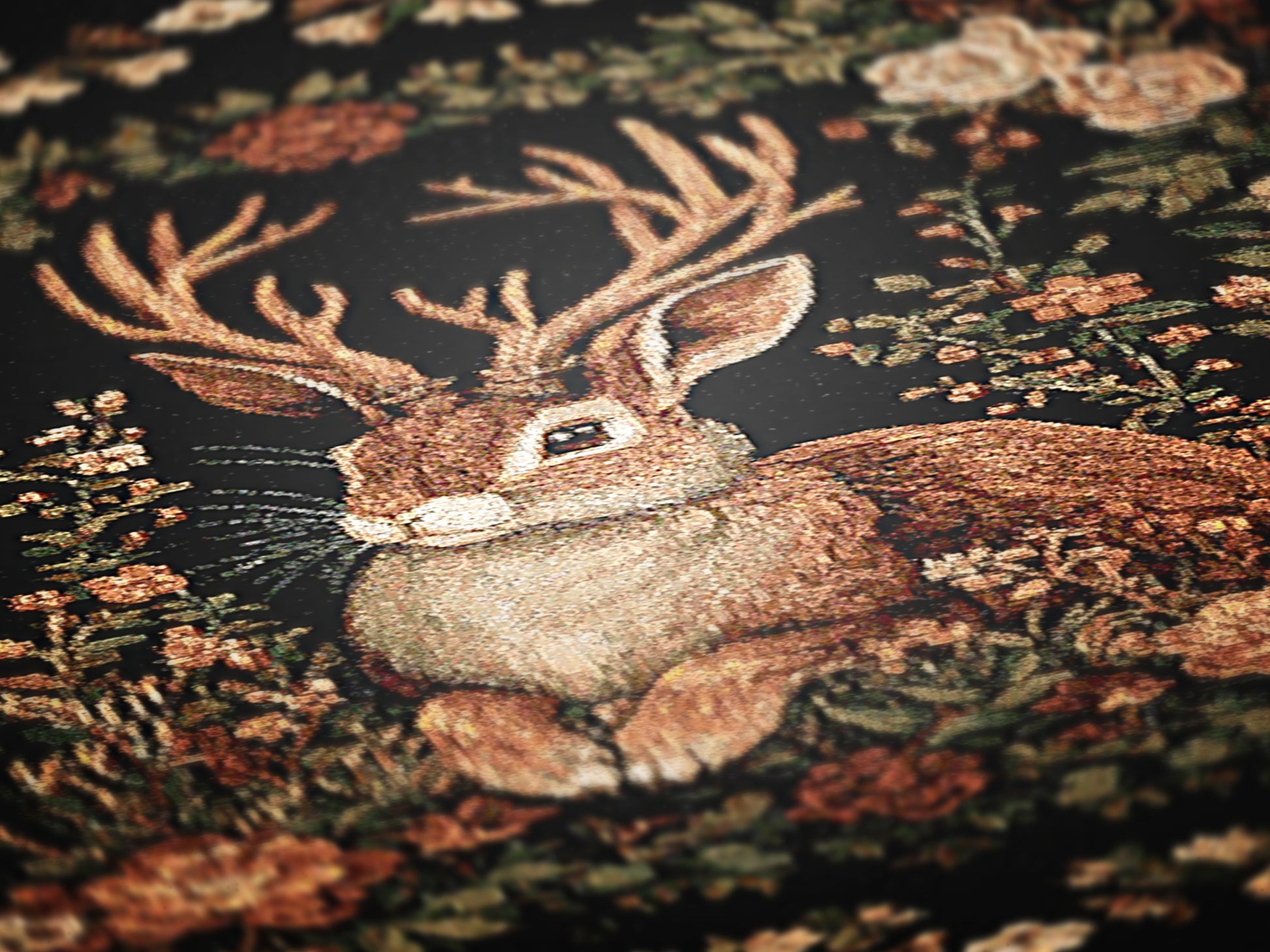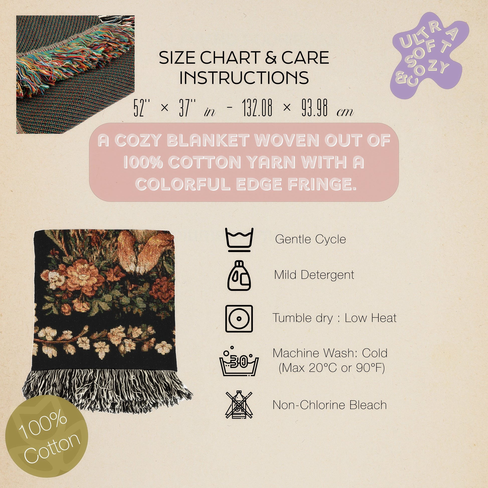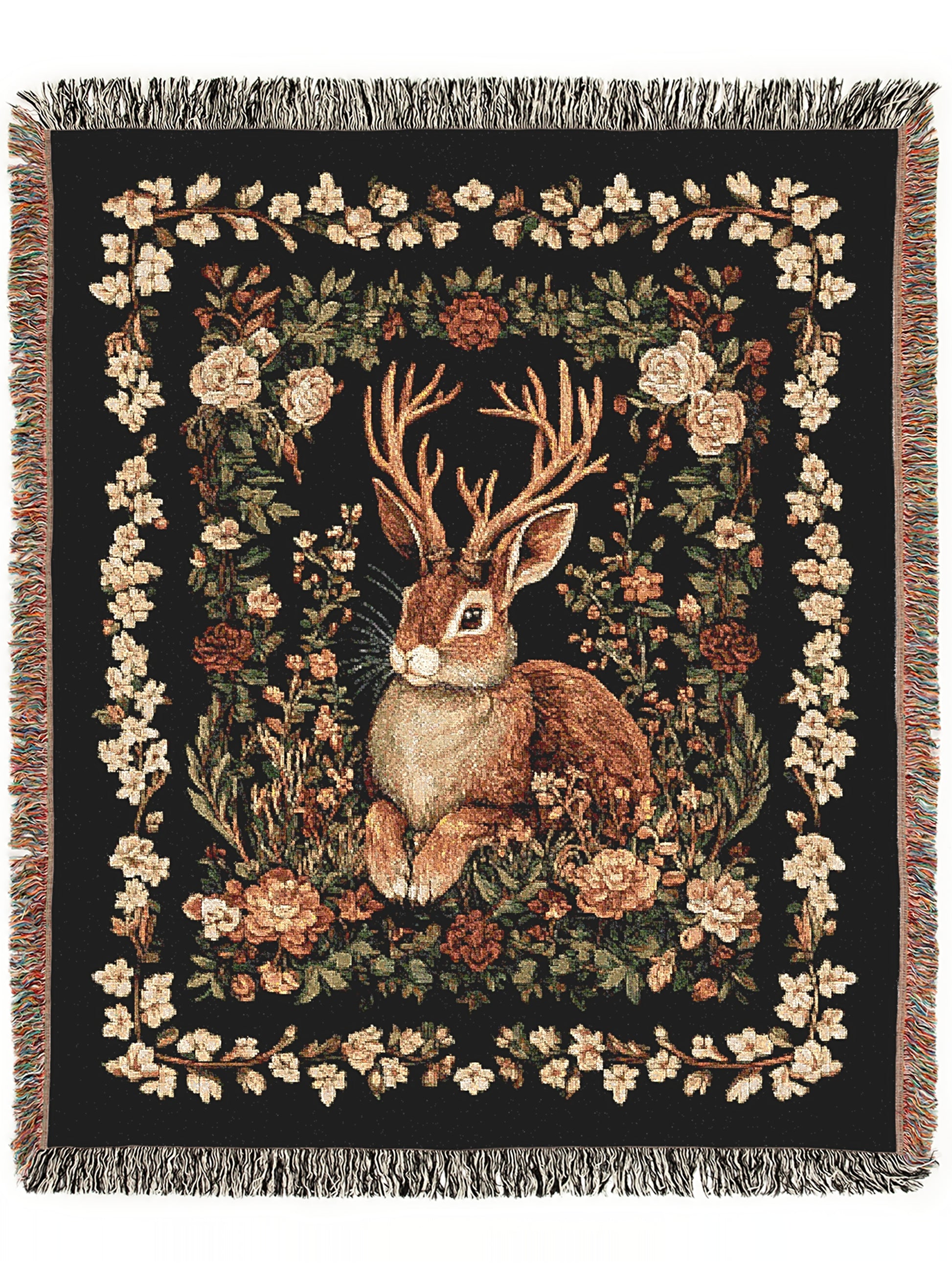 This enchanting woven blanket features a majestic jackalope, a mythical creature with the body of a rabbit and the antlers of a deer, nestled among blooming wildflowers and surrounded by an ornate floral border. With gothic vintage tones and folk art charm, this large tapestry throw brings a medieval whimsigoth touch of the wild to any space. Perfect for nature and forest lovers, cryptid collectors, and cottagecore dreamers 🌿🐇🦌