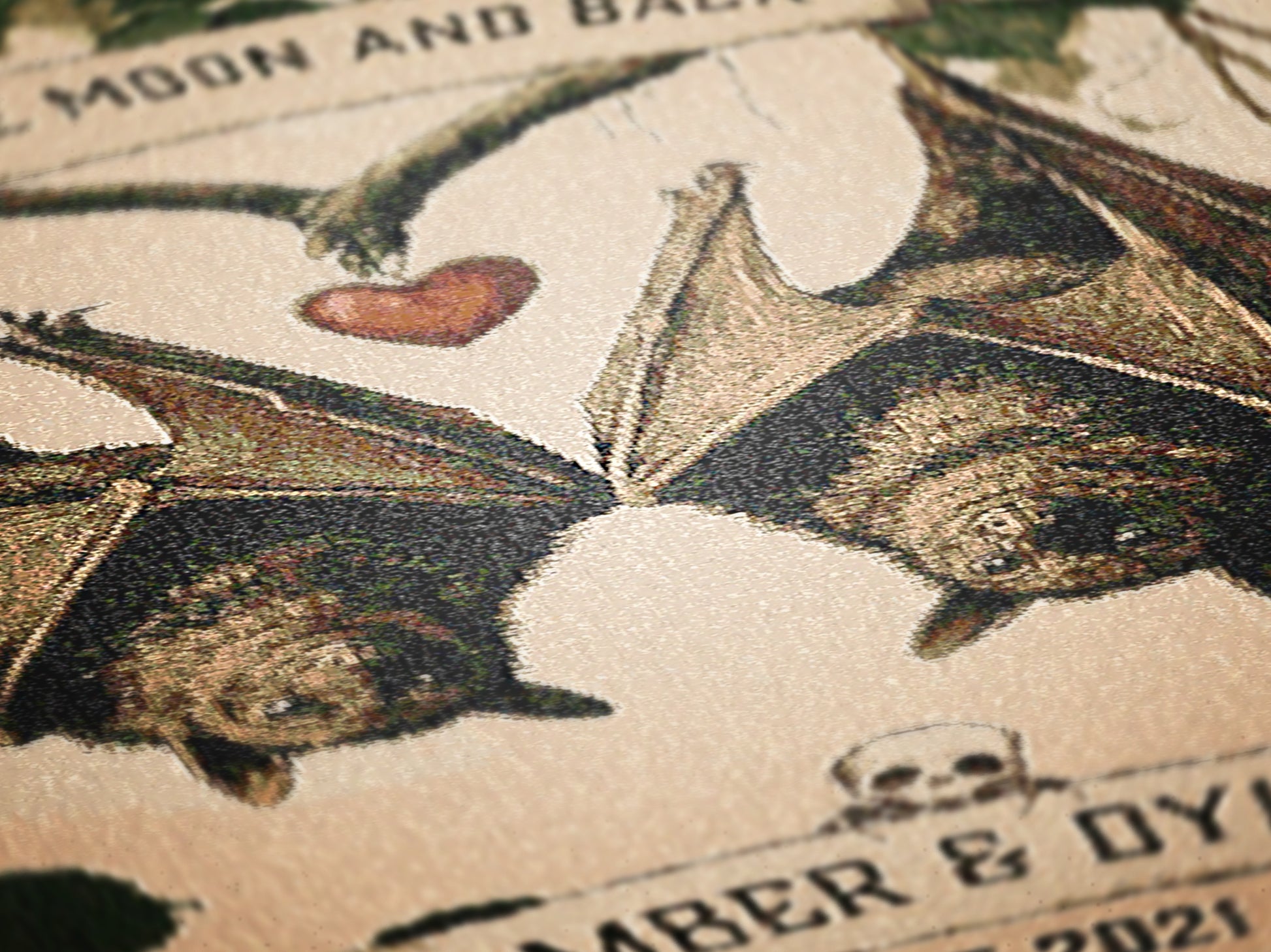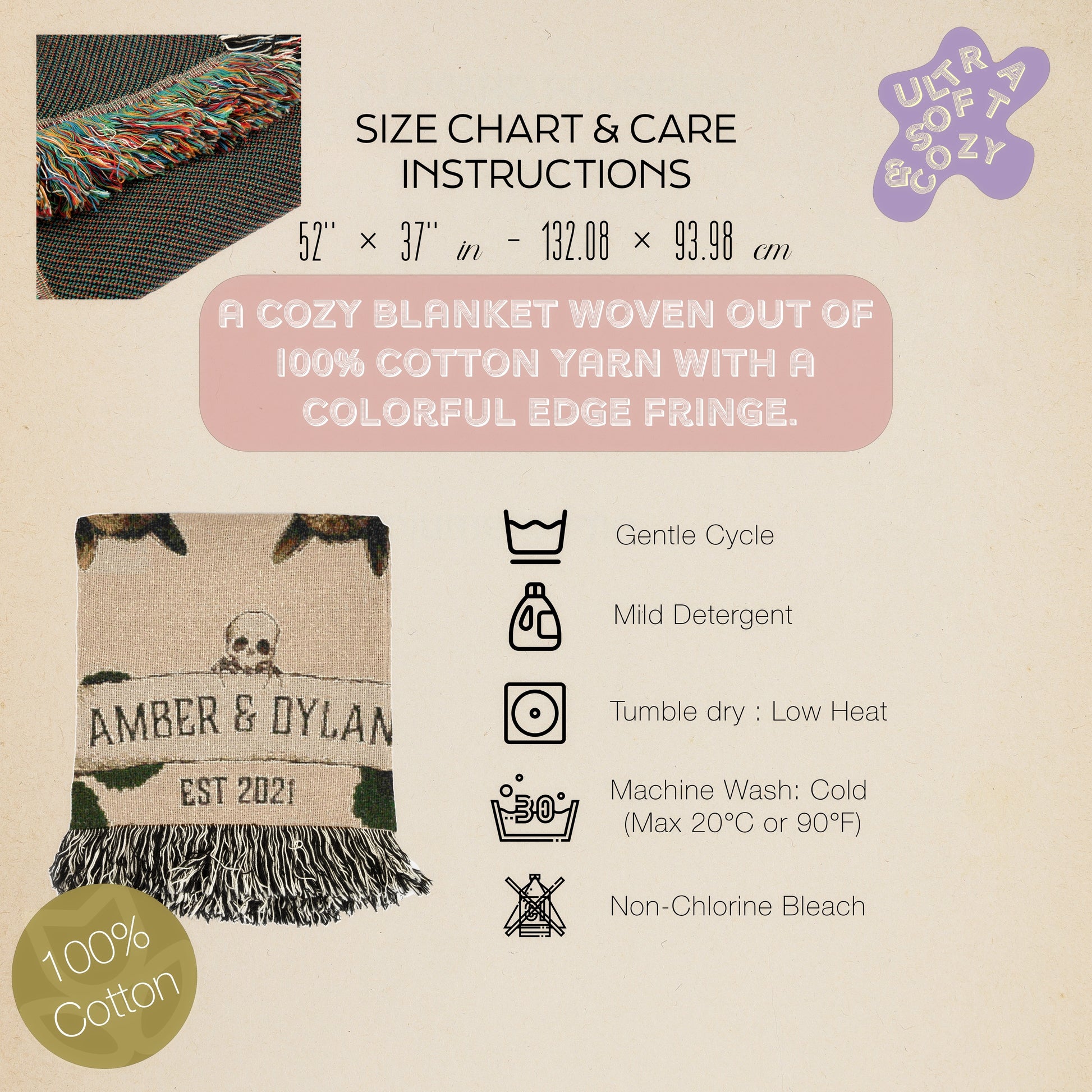 Celebrate eternal love with this adorable gothic woven blanket featuring two bats hanging upside-down from a tree branch, joined by a heart and a personalized name banner. Surrounded by lush green leaves and a subtle skull motif, this cozy tapestry perfectly balances creepy and cute ๐ฆโค๏ธ๐ Whether used as a throw blanket, wall hanging, or romantic anniversary gift, itโs ideal for couples who adore spooky charm and whimsigoth aesthetics.
