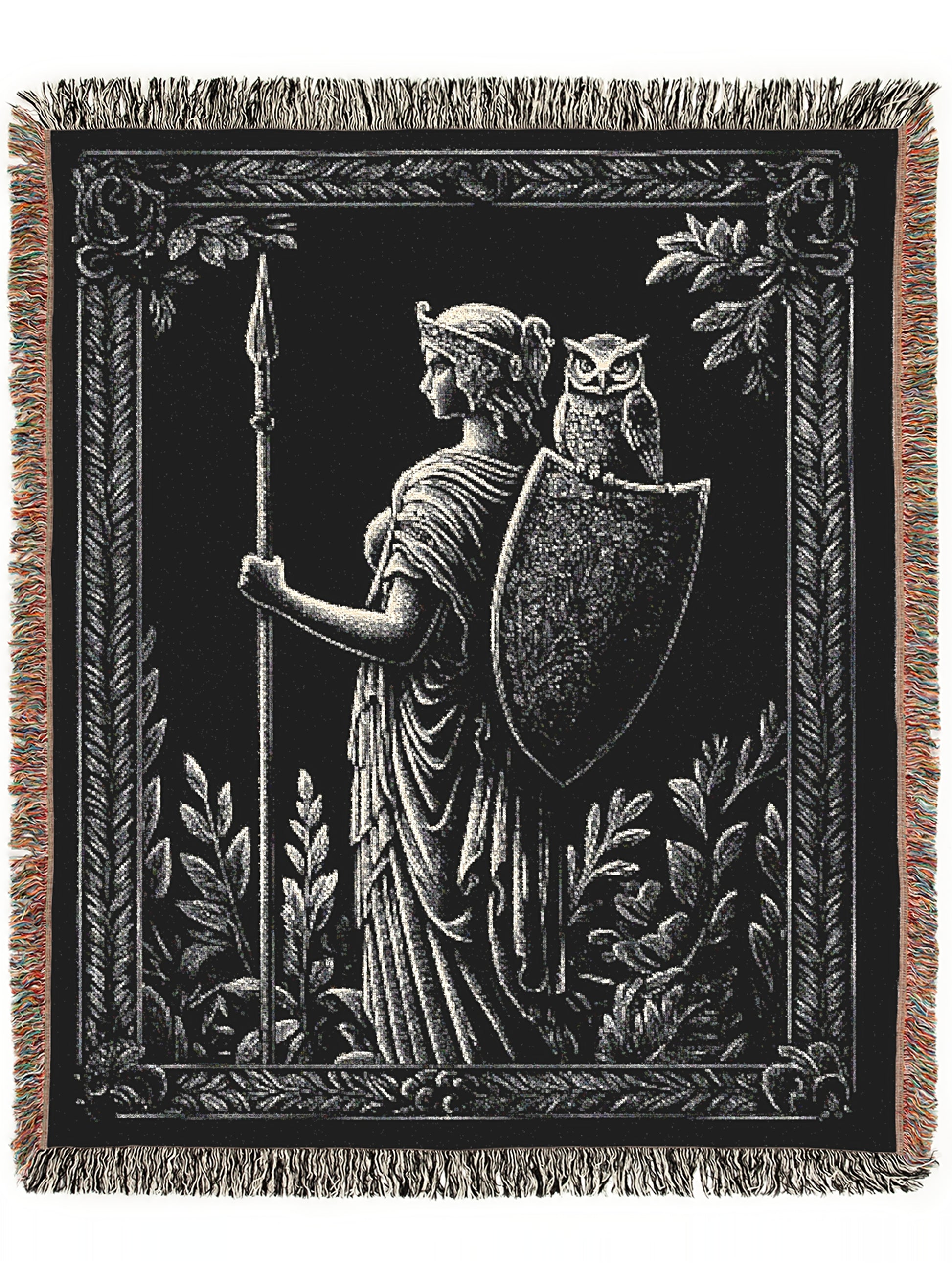 This powerful large woven tapestry honors Athena, the ancient Greek deity of wisdom, strategy, and war, depicted with her iconic spear, shield, and watchful owl companion. Surrounded by flourishing olive branches, the design exudes strength, clarity, and protection. Perfect for mythology enthusiasts, book lovers, and sacred spaces, this blanket doubles as a wall hanging or cozy throw imbued with divine intellect and grace 🦉⚔️🌿