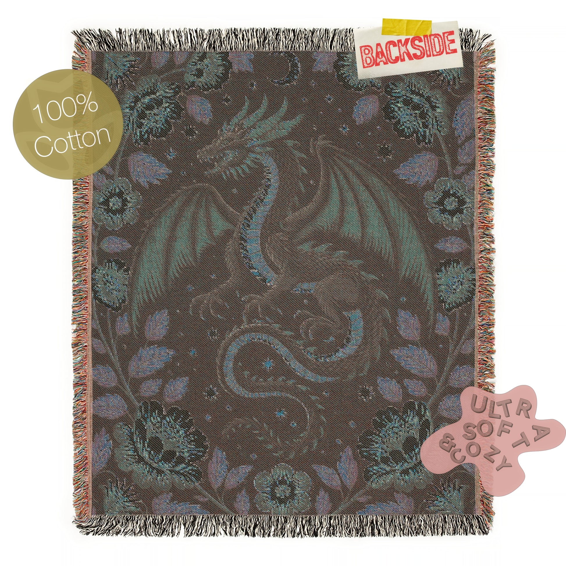 This enchanting large woven blanket features a majestic dragon curled in flight, surrounded by lush botanical forest florals and a crescent moon. Styled like medieval embroidery with a rich fantasy twist, this tapestry merges fiery myth and delicate elegance. Perfect for lovers of folklore, dark cottagecore, or fairytale interiors, this textile makes a magical statement on any bed, wall, or couch 🐉🌙🌸