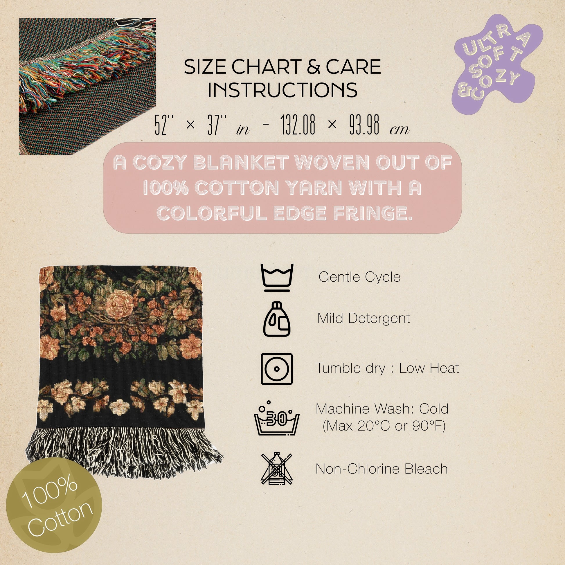 🧵 Made from 100% cotton with a textured woven feel and classic fringe edging