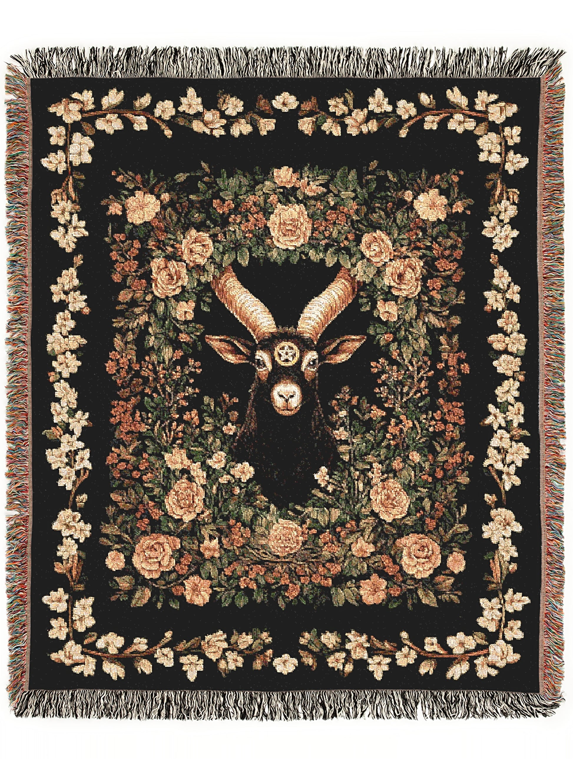 This bold and mystical large woven tapestry blanket features a black phillip baphomet with a pentacle symbol on its forehead, surrounded by lush roses and vines in an ornate floral frame. Inspired by witchcore, dark cottagecore, and antique occult iconography, this piece adds powerful symbolism and botanical elegance to your home. Whether used as a throw blanket or statement wall art, it's perfect for witchy altars, gothic dens, or forest fantasy lovers 🌹🐐🔮