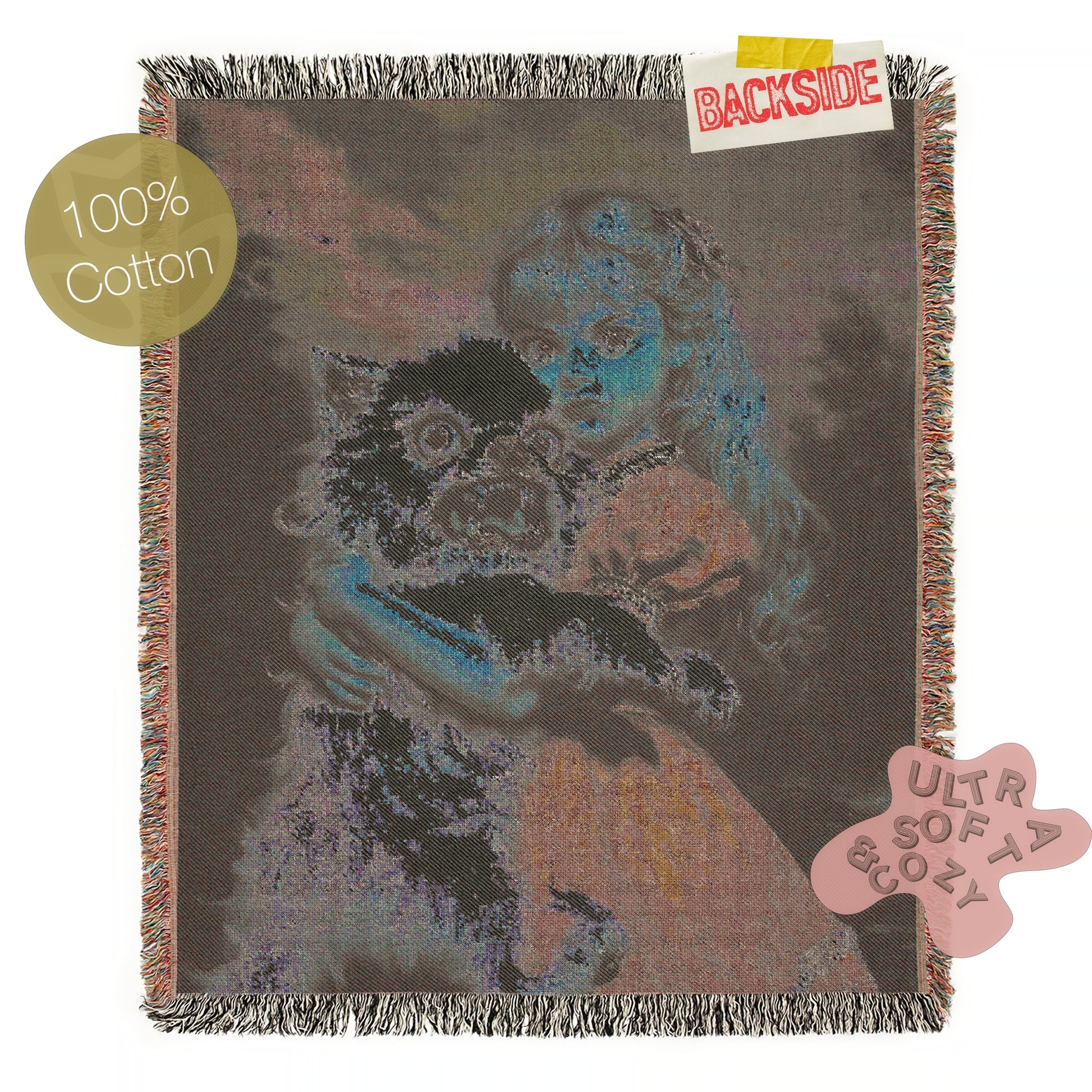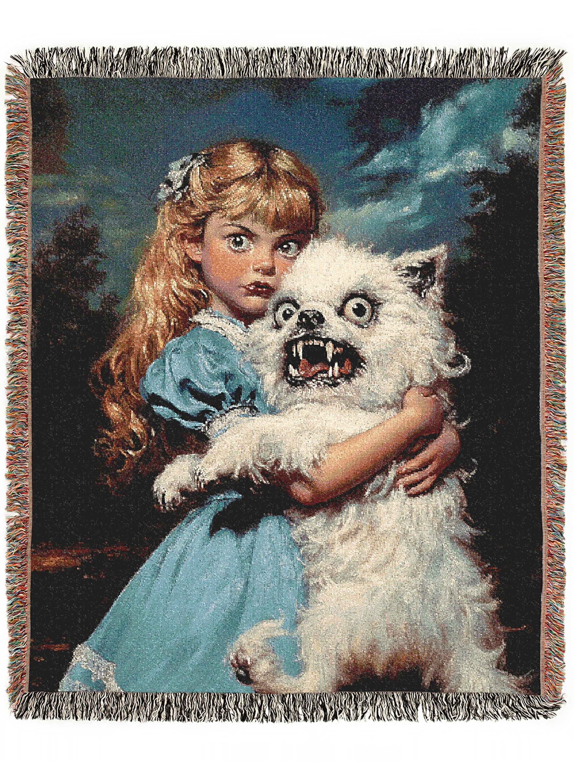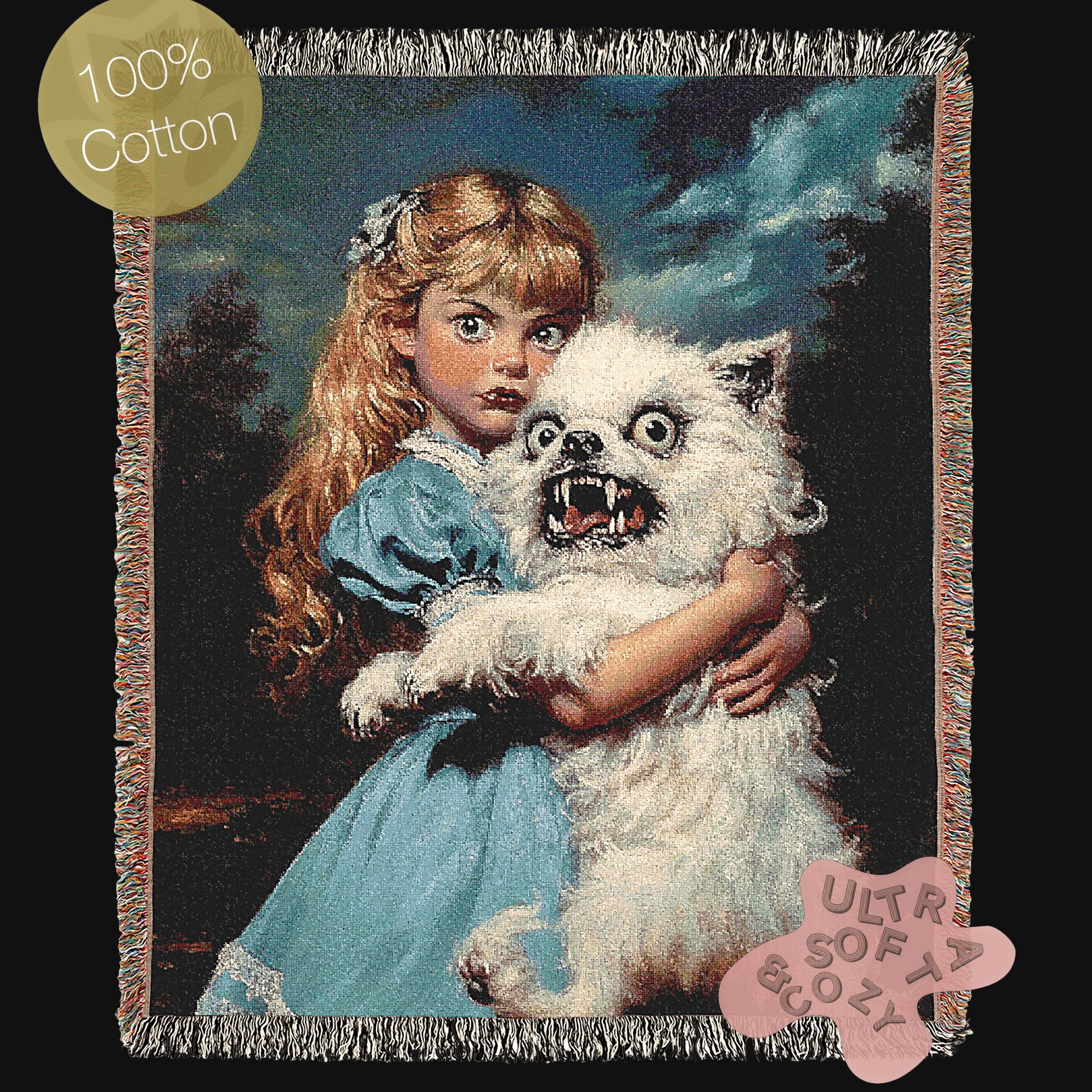 This disturbingly quirky yet delightful large chunky woven knit blanket features a wide-eyed Victorian-style girl clutching her unhinged, feral-looking fluffball of a demon dog ๐ณ๐ถ๐. Blending kitschy classical portrait aesthetics with absurd horror and humor, this design is pure nightmare fuel and we mean that lovingly. A perfect statement for fans of creepy cute, campy horror, or cursed vintage energy.