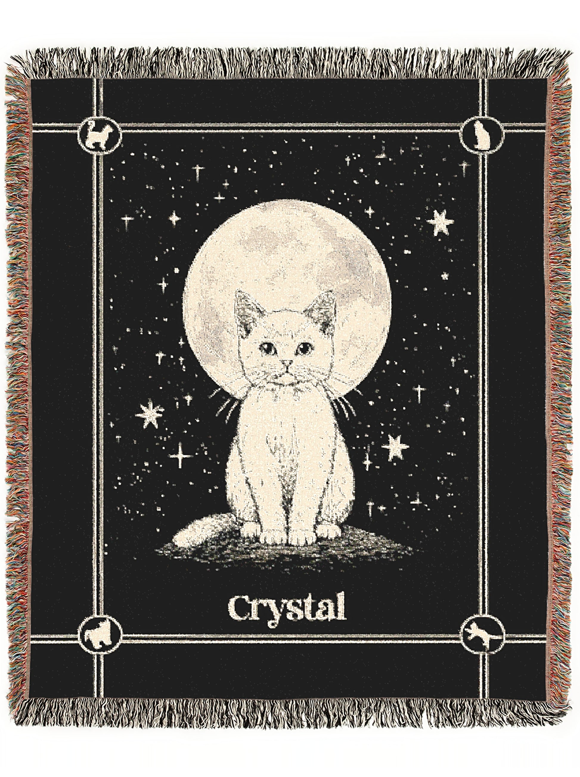 This dreamy personalized woven tapestry blanket features a magical white cat sitting proudly under a glowing full moon, surrounded by stars in a whimsical night sky. Customized with your chosen name, it brings a perfect blend of celestial magic, antique charm, gothic fantasy, and cozy vintage cottagecore style ๐๐พ๐ค Ideal as a meaningful pet remembrance keepsake for cat lovers or a loving memory tribute.
