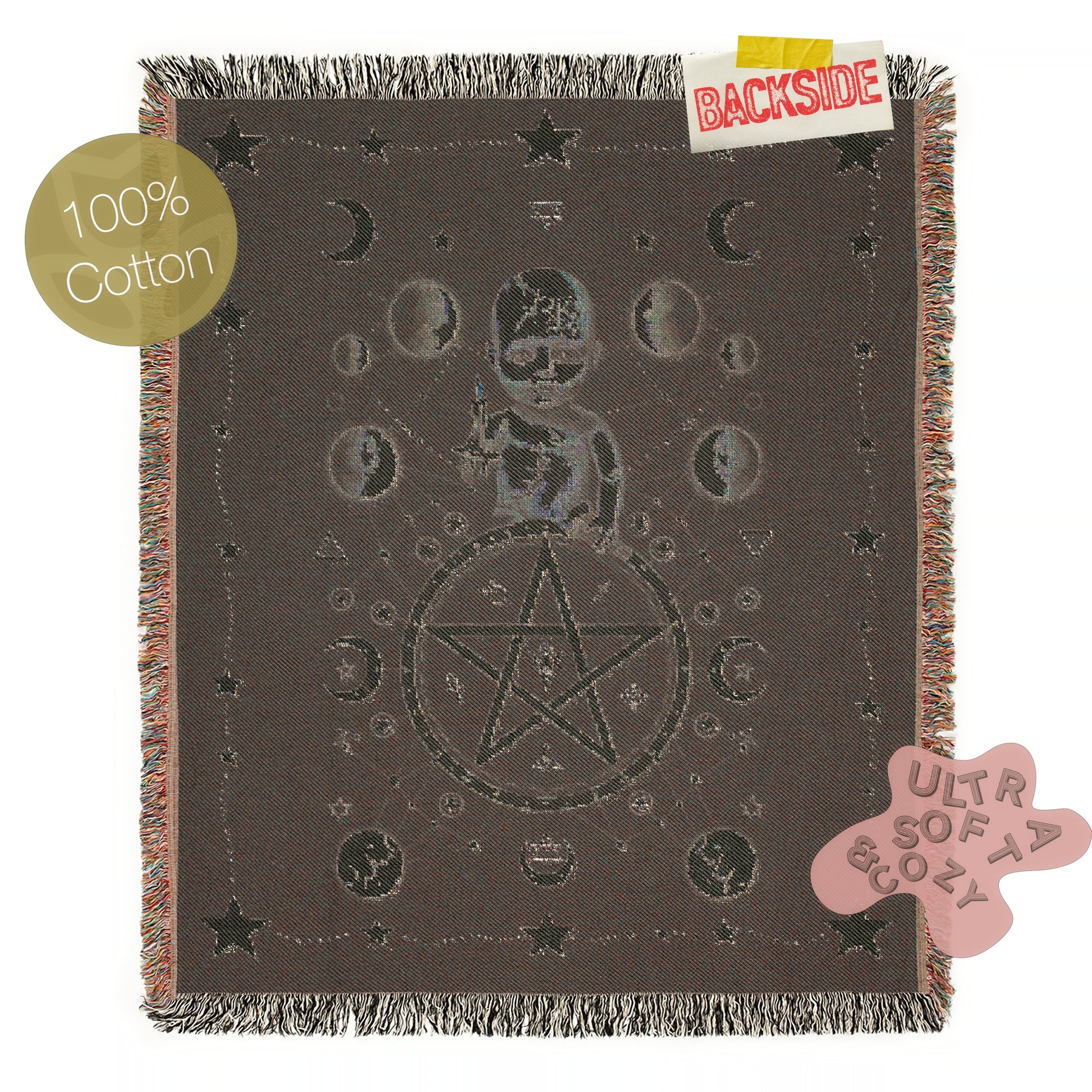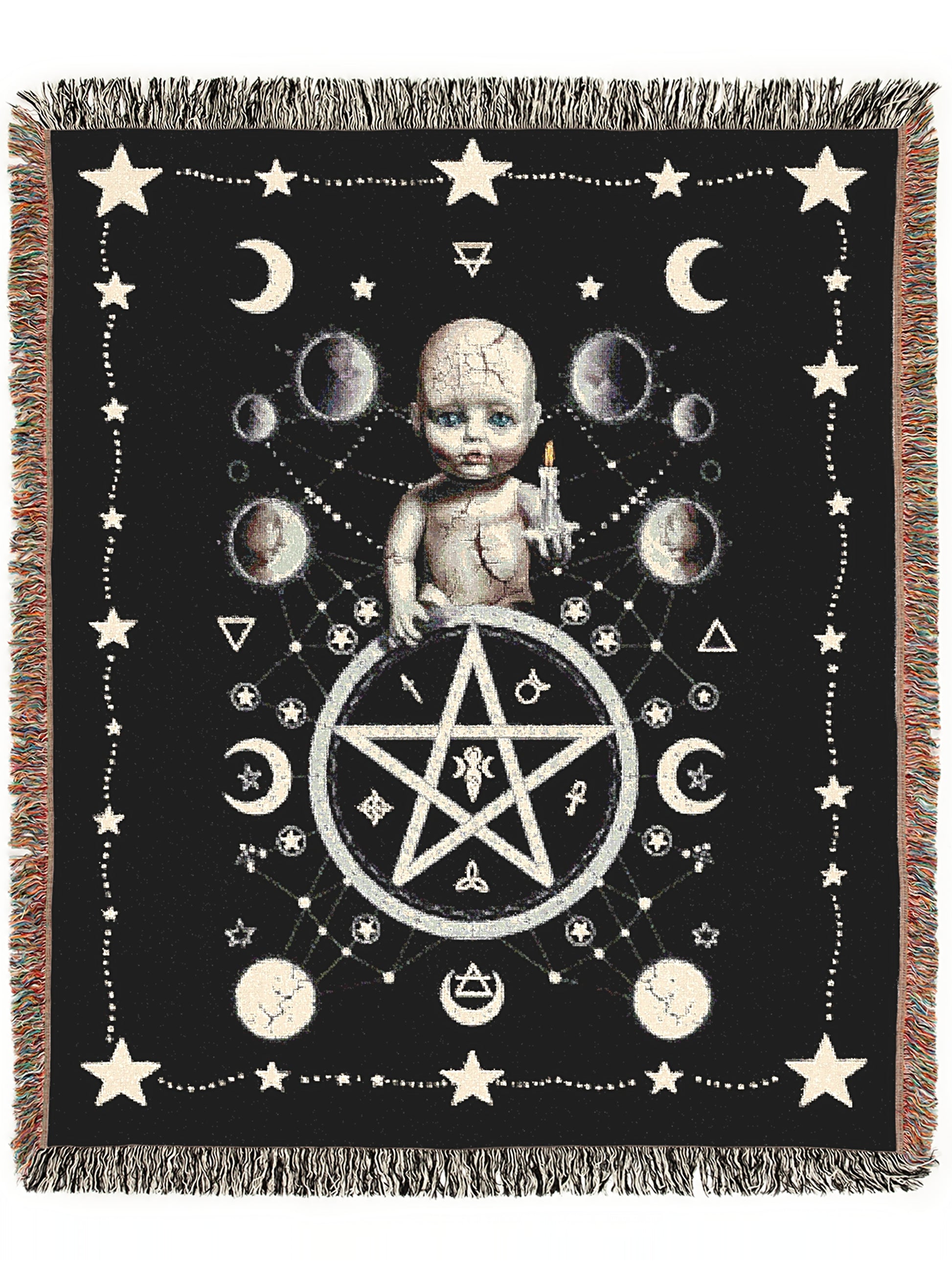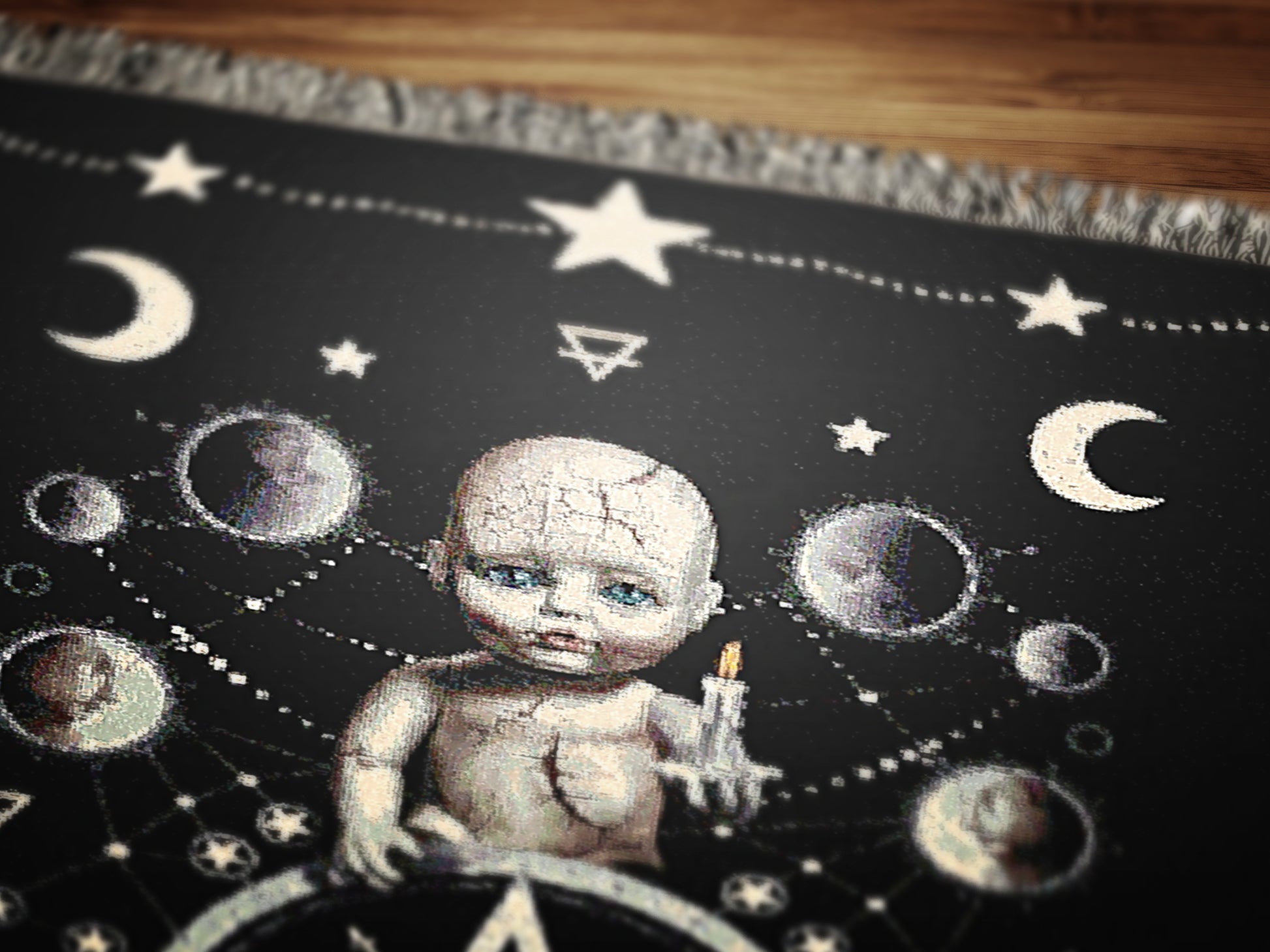 A haunting woven large tapestry blanket featuring a cracked baby doll holding a candle, surrounded by a pentagram, moon phases, and occult symbols ๐๐ฏ๏ธโจ. Use it as a throw blanket, wall tapestry, or altar cloth to add dark charm to gothic, pastel goth, or Halloween-inspired spaces.
