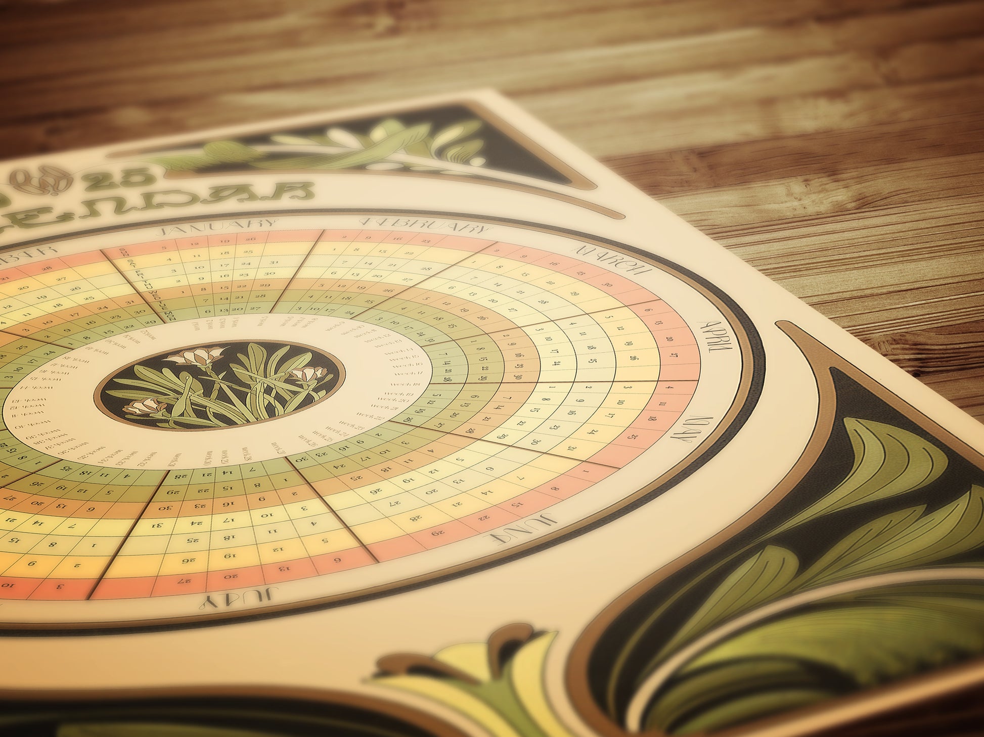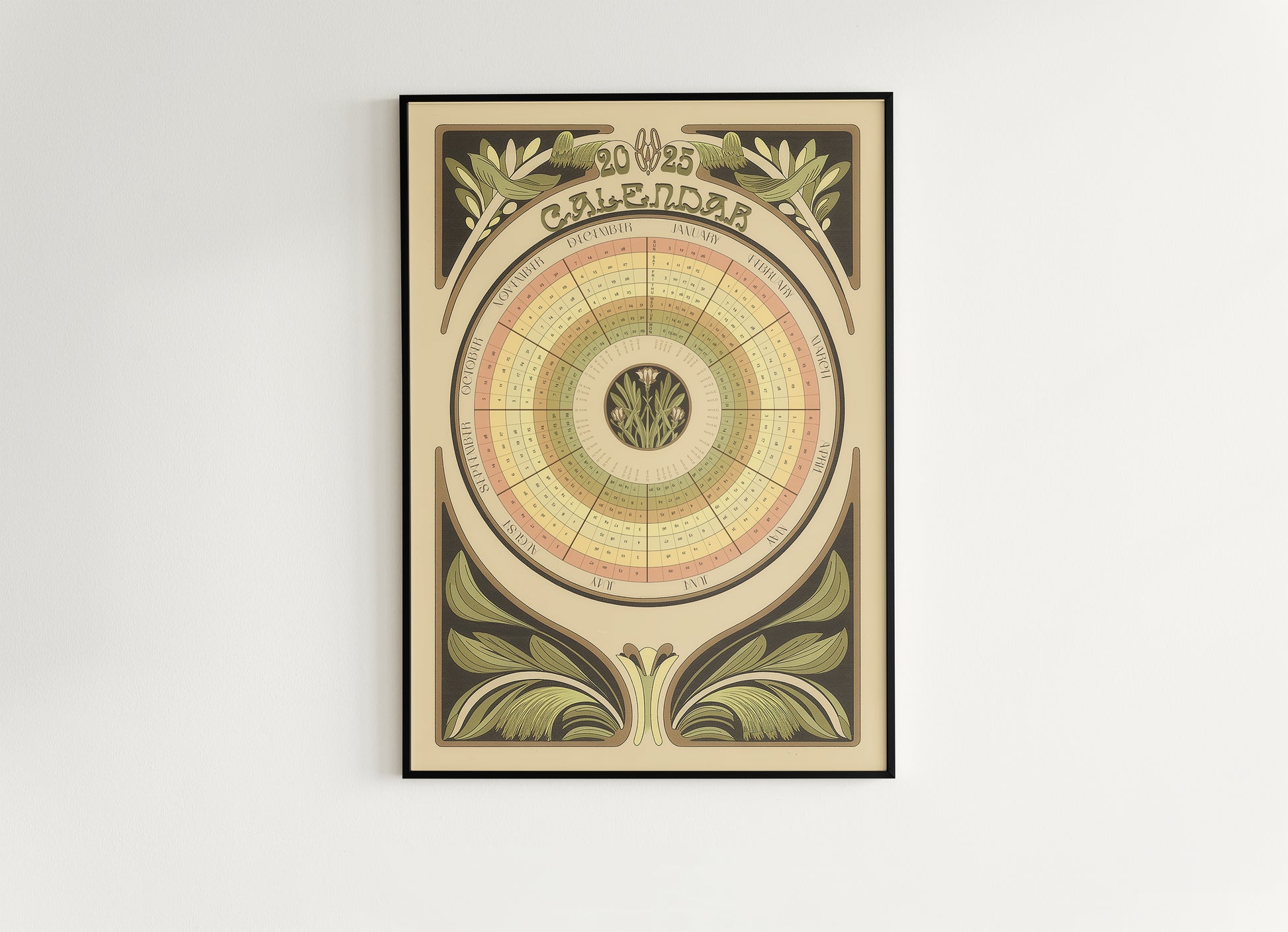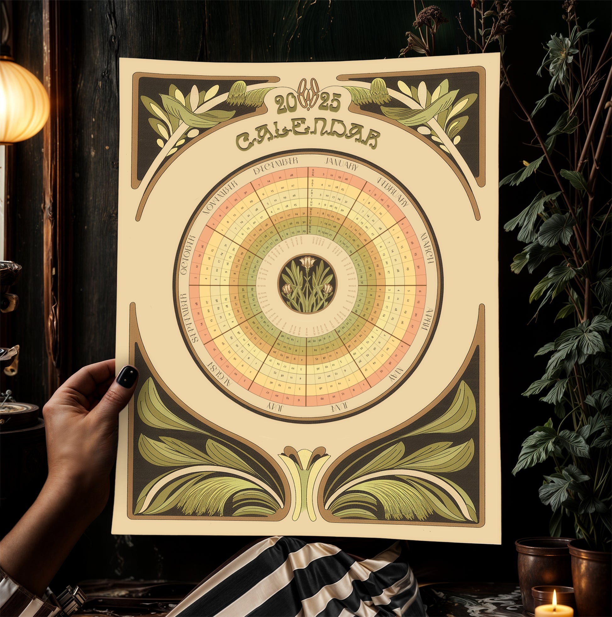Discover this new year, 2025 yearly Art Nouveau Calendar, featuring a stunning circular design with vintage botanical illustrations, this monthly planner is broken down in a circular way. Perfect for home decor, calendar wall poster or as a thoughtful vintage aesthetic calendar gift idea, this unique calendar blends functionality with artistic beauty and dark academia