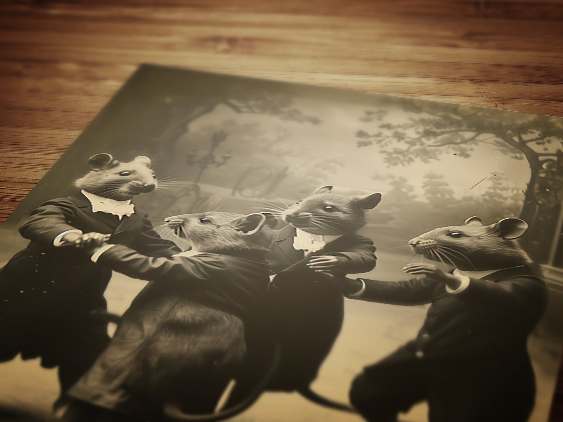 This haunting yet humorous Victorian-style rat portrait captures four mice mid-waltz in a surreal forest tableau. A perfect blend of dark academia, occult oddity, and goblincore whimsy, this vintage animal artwork brings character and curiosity to any space ππ―οΈ