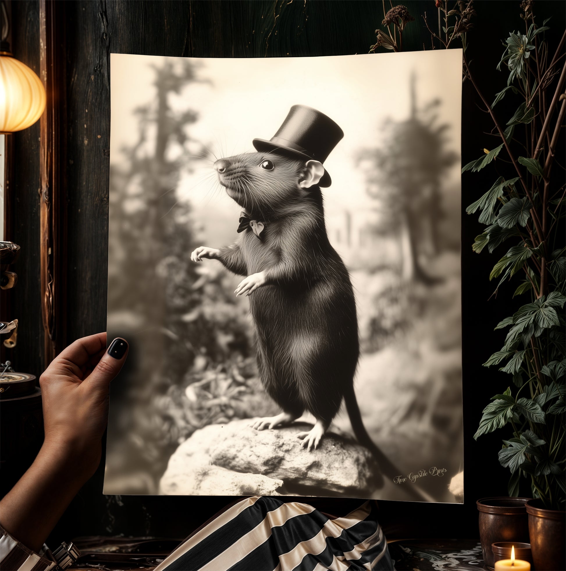 This charming rat in a top hat photograph brings a delightful dose of vintage oddity to your space! A perfect gift for rat lovers, goblincore enthusiasts, or anyone who appreciates antique-style whimsy and weird animal art ππ©πΏ