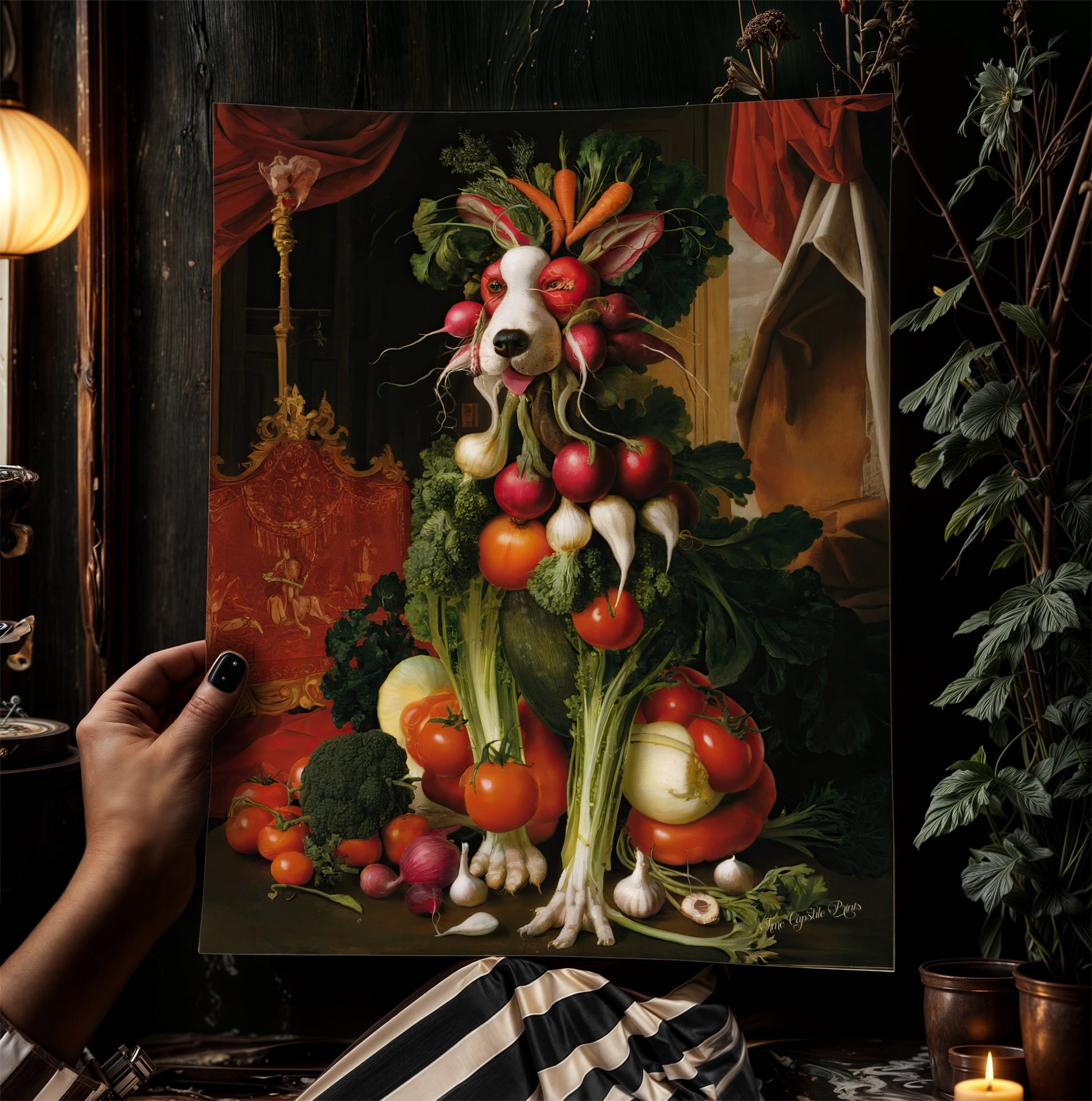 This funny playful and artistic poster painting will bring a humourous dopamine charged twist to your decor with this eccentric whimsical vegetable fruit dog art print. Inspired by Renaissance and Baroque still life paintings and Giuseppe Arcimboldo grotesque style, this surreal composition transforms fresh produce into a regal canine portrait. The intricate details, rich colors, and classical background make it an eye-catching statement piece for kitchens, dining rooms, or eclectic gallery walls. Would be a perfect and unique gift for chefs, weirdcore lover, a house warming present, Perfect Gift for Food and cooking enthusiasts, Dog lovers who appreciate unique art, Fans of Renaissance and Baroque paintings and Anyone who enjoys whimsical and surreal decor