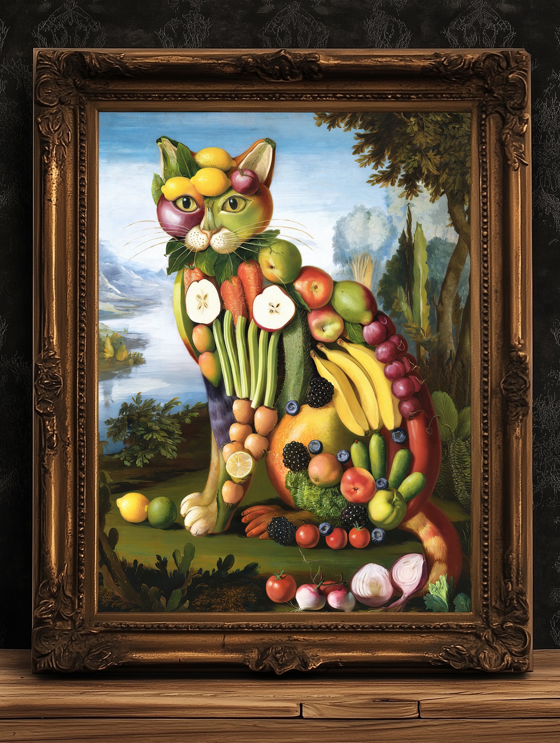This funny playful and artistic painting will bring a humourous dopamine charged twist to your decor with this eccentric whimsical vegetable fruit cat painting. Inspired by Renaissance and Baroque still life paintings and Giuseppe Arcimboldo grotesque style, this surreal composition transforms fresh produce into a regal canine portrait. The intricate details, rich colors, and classical background make it an eye-catching statement piece for kitchens, dining rooms, or eclectic gallery walls. Would be a perfect and unique gift for chefs, weirdcore lover, a house warming present, Perfect Gift for Food and cooking enthusiasts, cat lovers who appreciate unique art, Fans of Renaissance and Baroque paintings and Anyone who enjoys whimsical and surreal decor