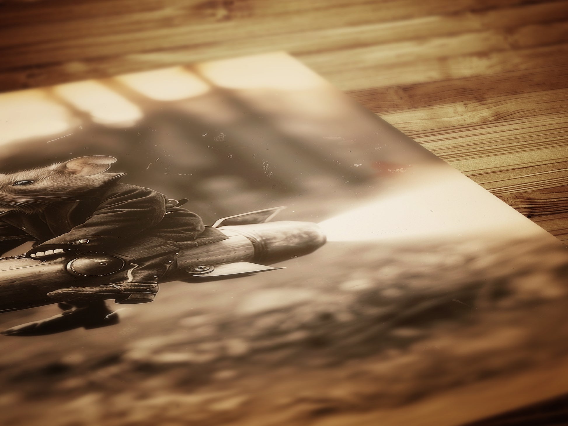 π Features an adorable mouse dressed in vintage attire, riding a rocket in sepia tones