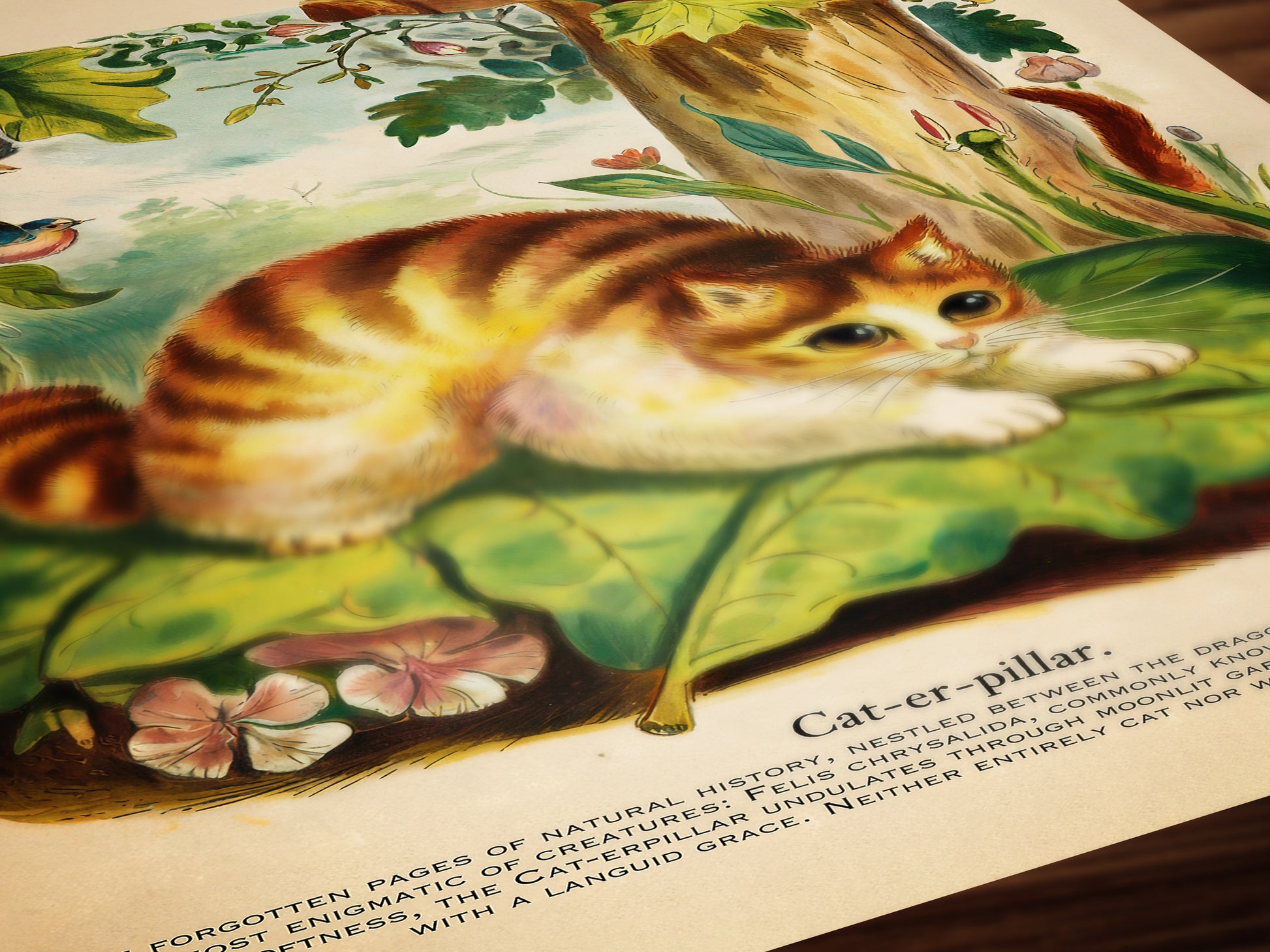 This vintage inspired Cat-er-pillar print is a whimsical fusion of fantasy, nature and antique biology books aesthetic, bringing a quirky and surreal touch to your space. Perfect for animal lovers, fantasy enthusiasts, and those who adore unique wall art, this botanical-style illustration is both charming and unexpected.