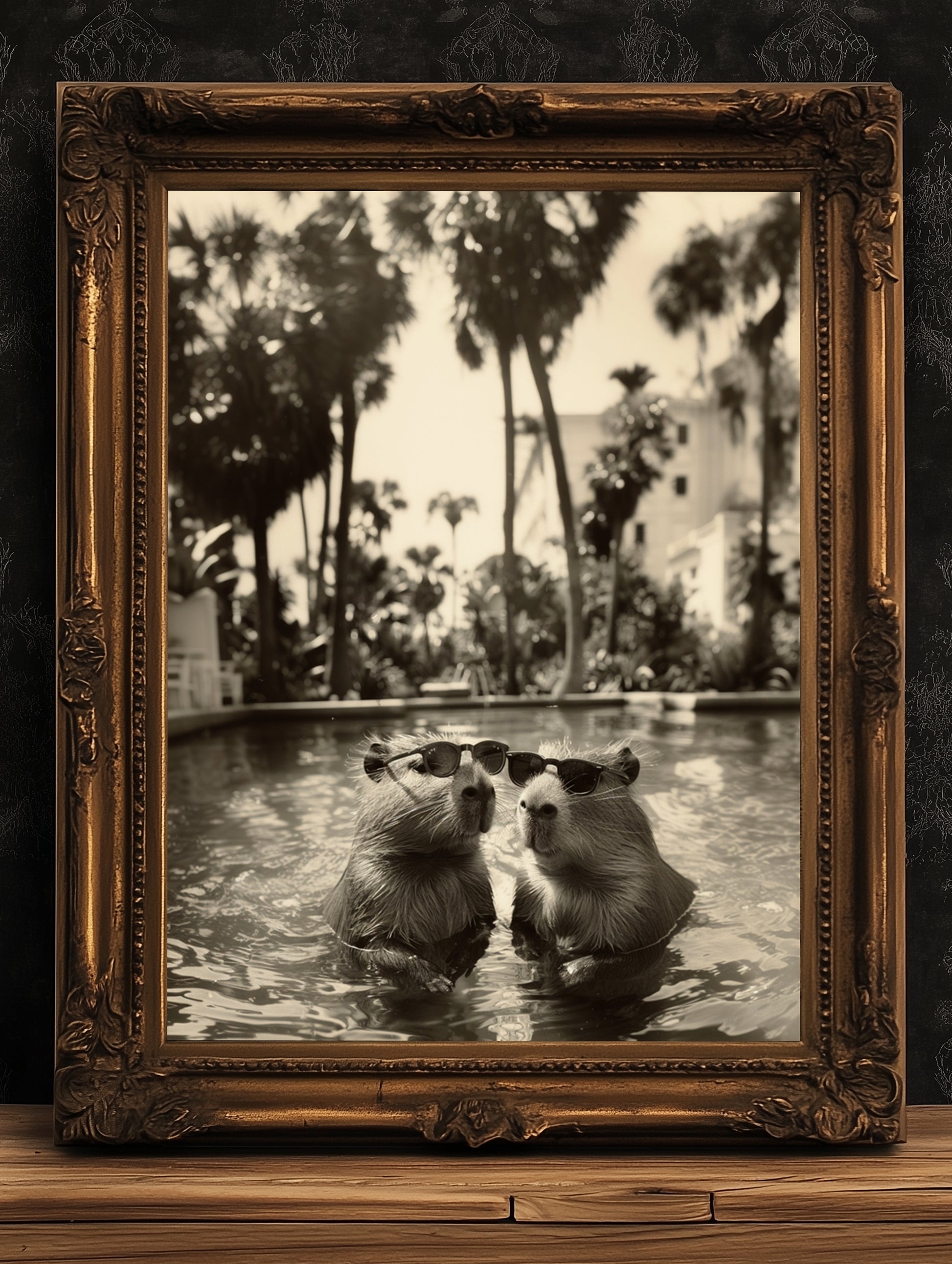 Capybara's Holiday, Capybara In A Pool, Gothic Vintage photograph, Occult Poster. Whimsy Animal Art, Dark Academia Decor