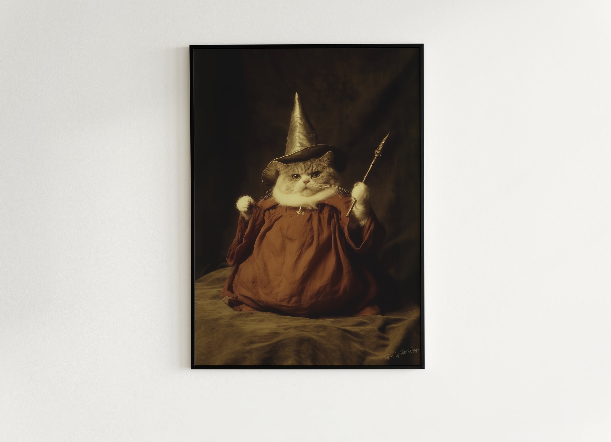 This hilarious digital artwork features a grumpy, fluffy cat dressed as a wizard—complete with robes, a pointed hat, and a wand. Styled like a dramatic Renaissance portrait, this whimsical and eccentric piece blends fantasy charm with gag gift humor. It's the perfect wall decor for cat lovers, pet enthusiasts, and magic fans alike. With strong witchcore and spellcaster vibes, it’s also a fun choice for collectors of oddities, novelty art, and anyone who appreciates a touch of magical mischief.🐱🧙♂️