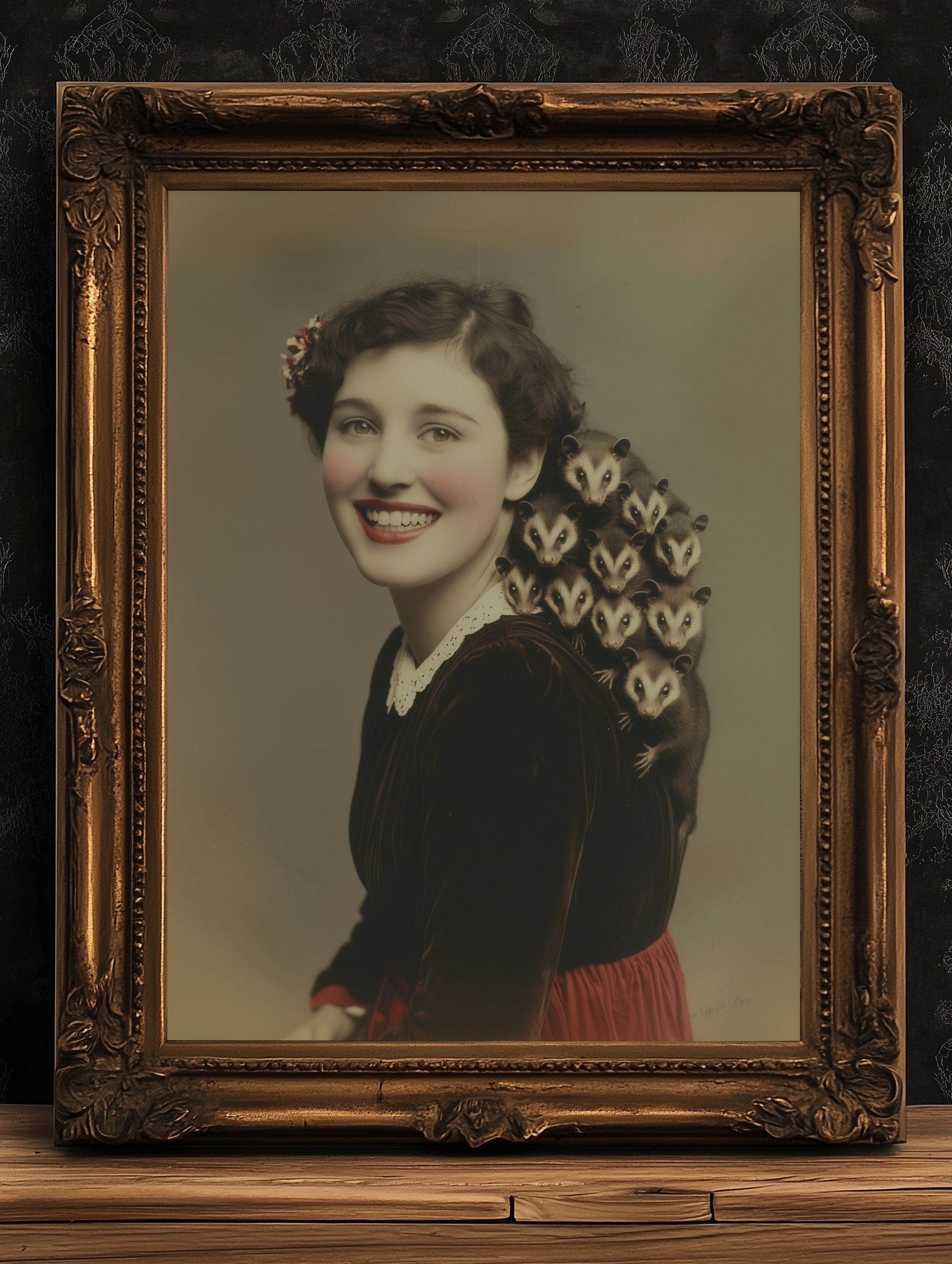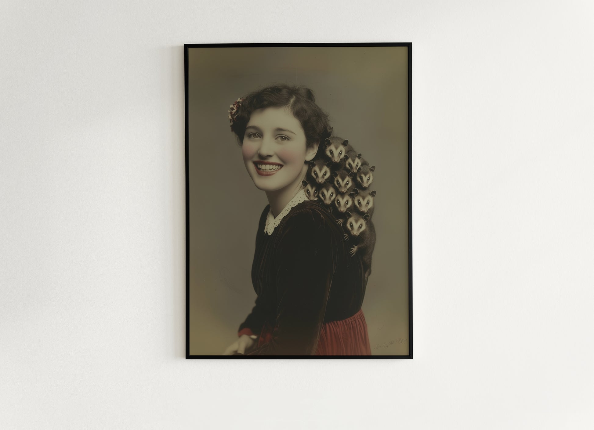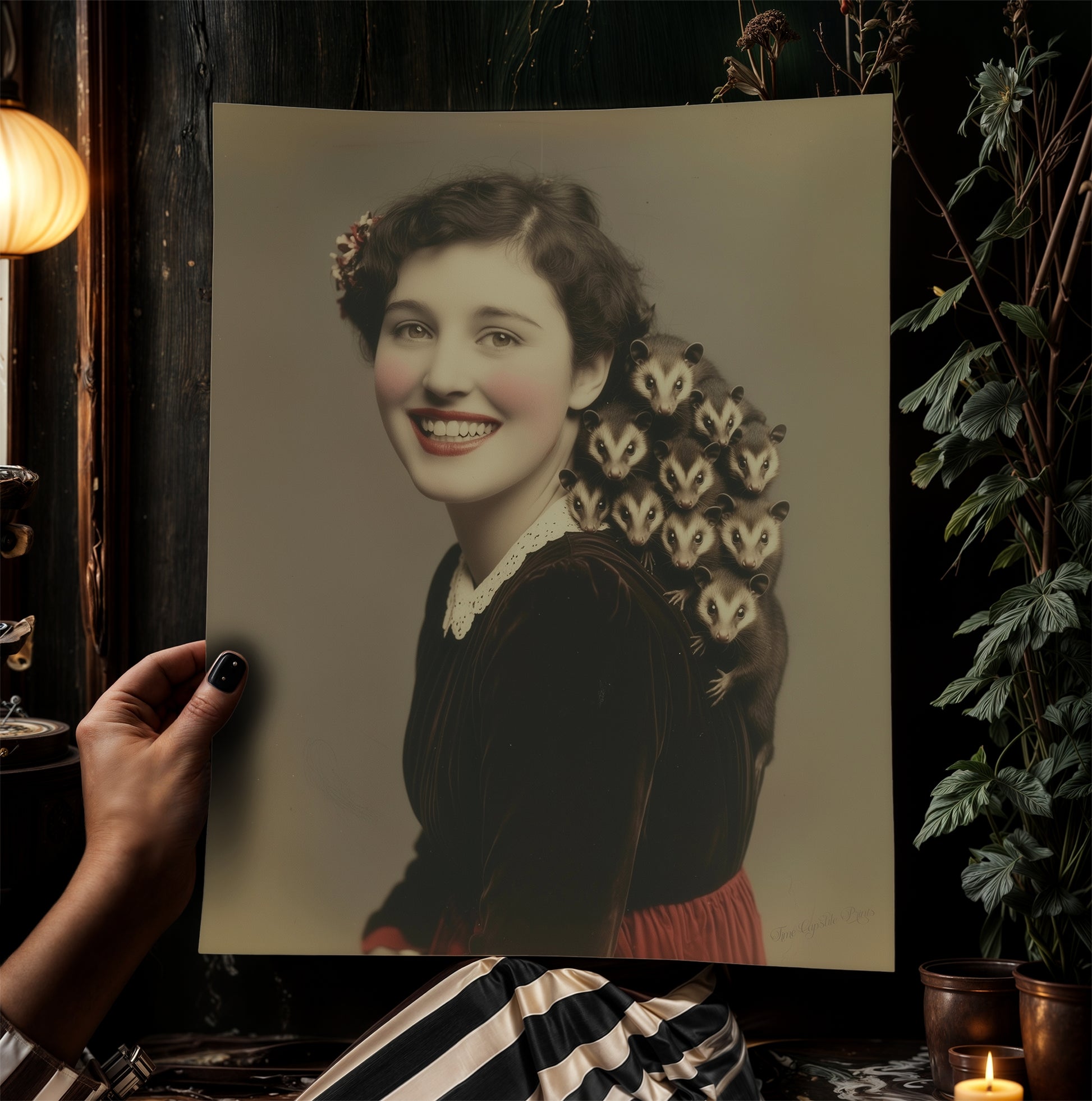 This delightfully strange and hilarious vintage-style artwork features a smiling woman in a classic portrait pose but with a twist: a handfull of baby possums on her back, carrying a full litter of adorable, wide-eyed joeys. Styled to resemble an old photograph with painterly softness and sepia tones, this piece playfully blends elegance and absurdity. Perfect for lovers of the unusual, the humorous, and the whimsigoth aesthetic 🐀📸🖤