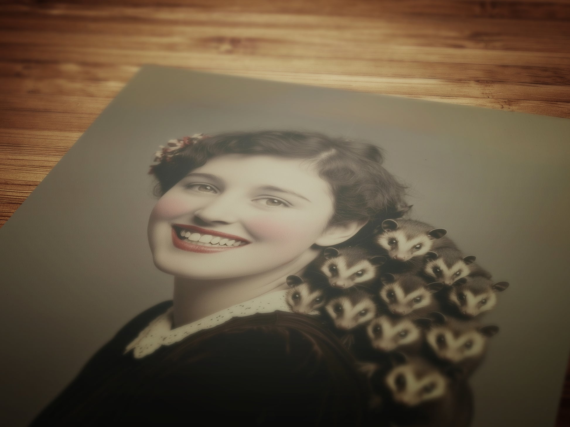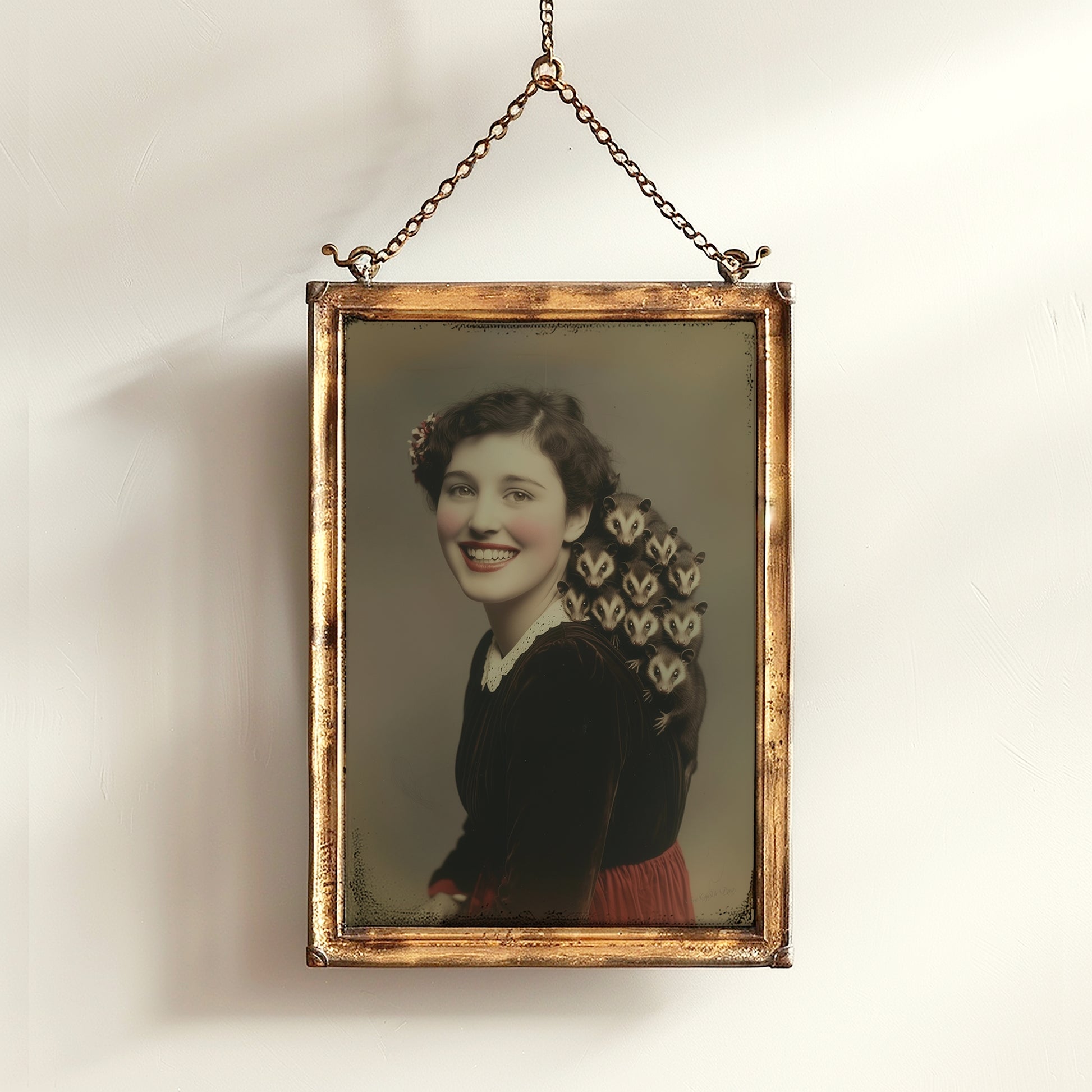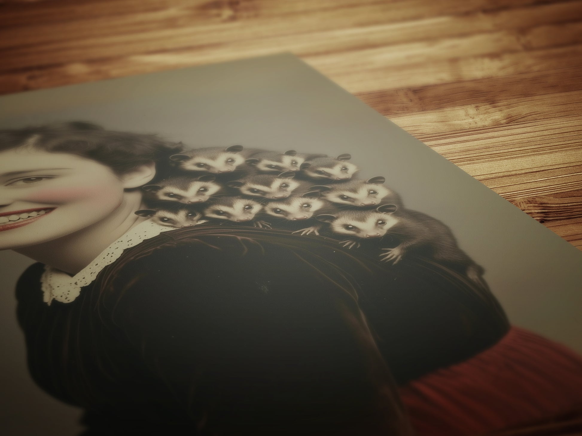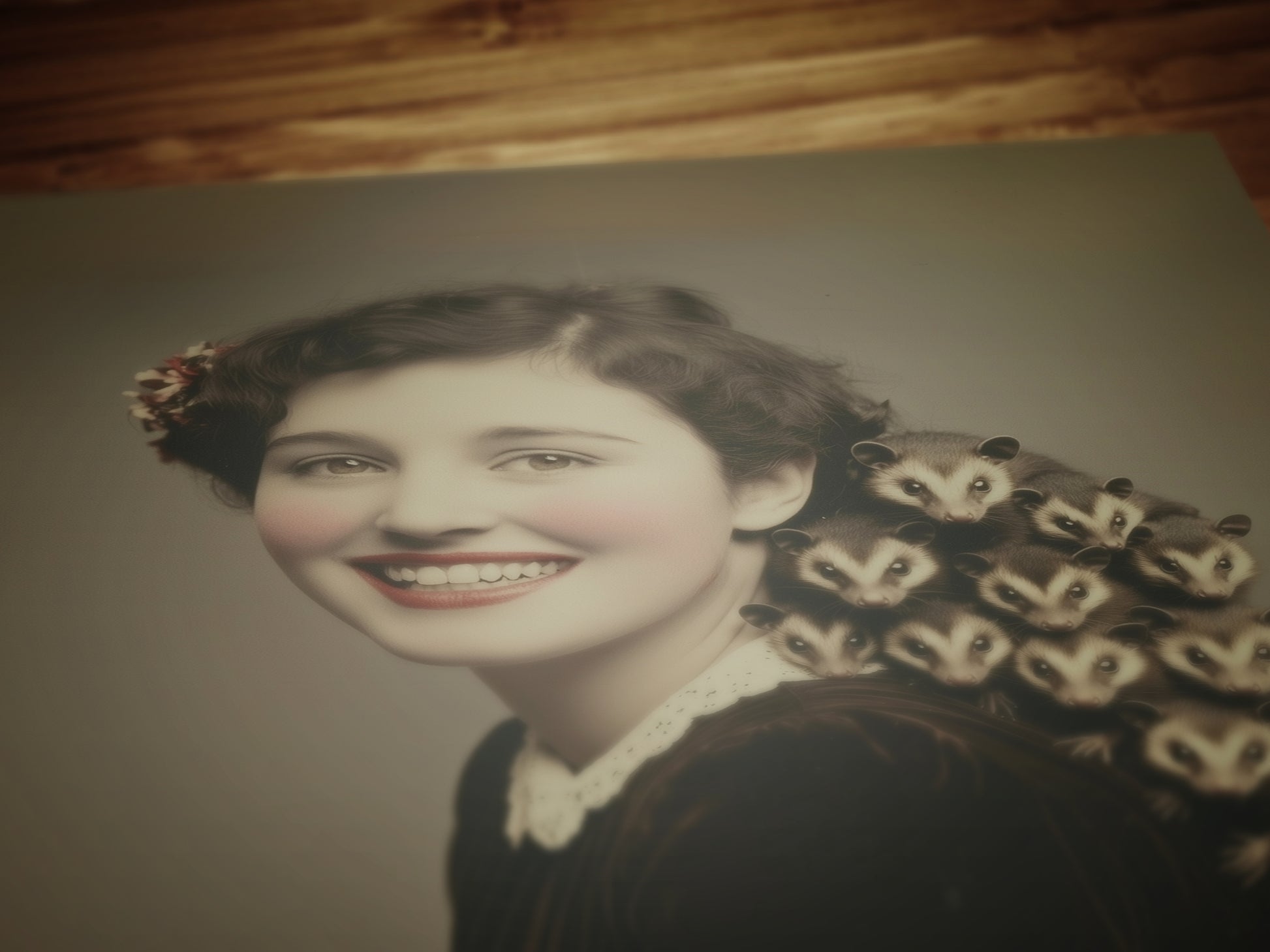 This delightfully strange and hilarious vintage-style artwork features a smiling woman in a classic portrait pose but with a twist: a handfull of baby possums on her back, carrying a full litter of adorable, wide-eyed joeys. Styled to resemble an old photograph with painterly softness and sepia tones, this piece playfully blends elegance and absurdity. Perfect for lovers of the unusual, the humorous, and the whimsigoth aesthetic 🐀📸🖤