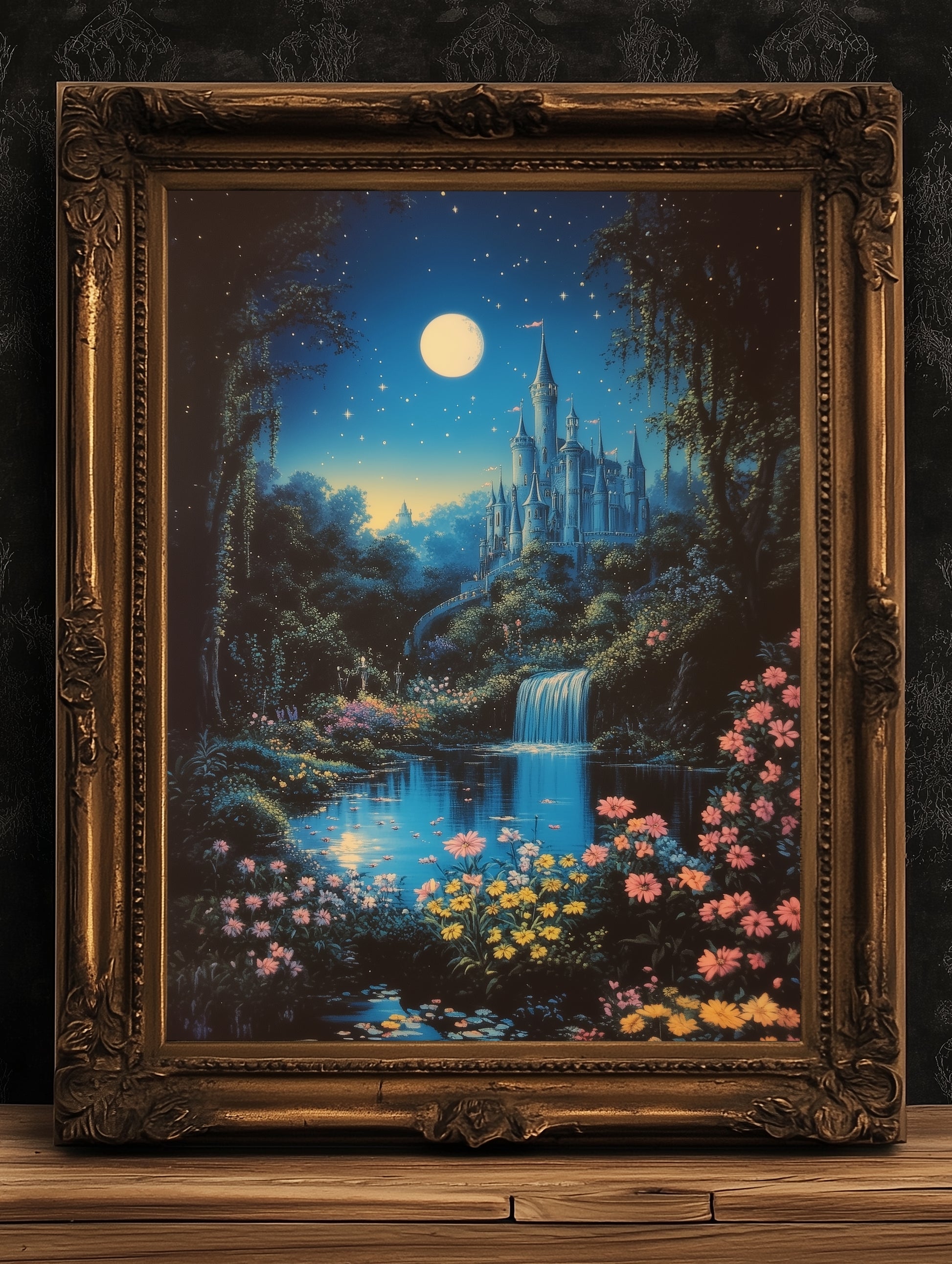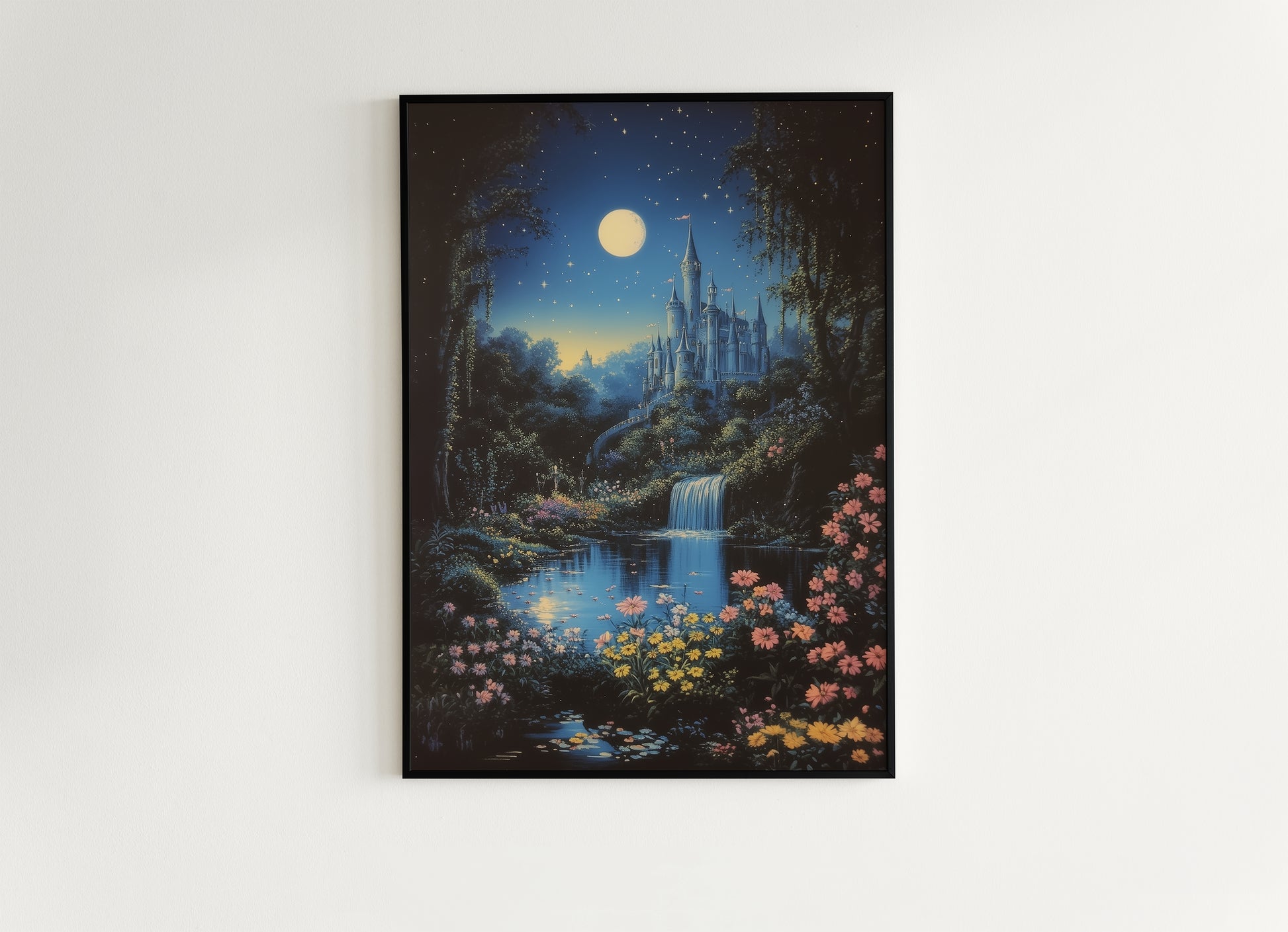 This dreamy and enchanted fantasy poster features a glowing moonlit medieval castle nestled deep in a magical forest. A gentle waterfall cascades into a shimmering pool, surrounded by colorful florals and twinkling stars above. With gothic fairytale charm and painterly elegance, this piece brings a touch of wonder and escapism to any room decor 🌙🏰🌸
