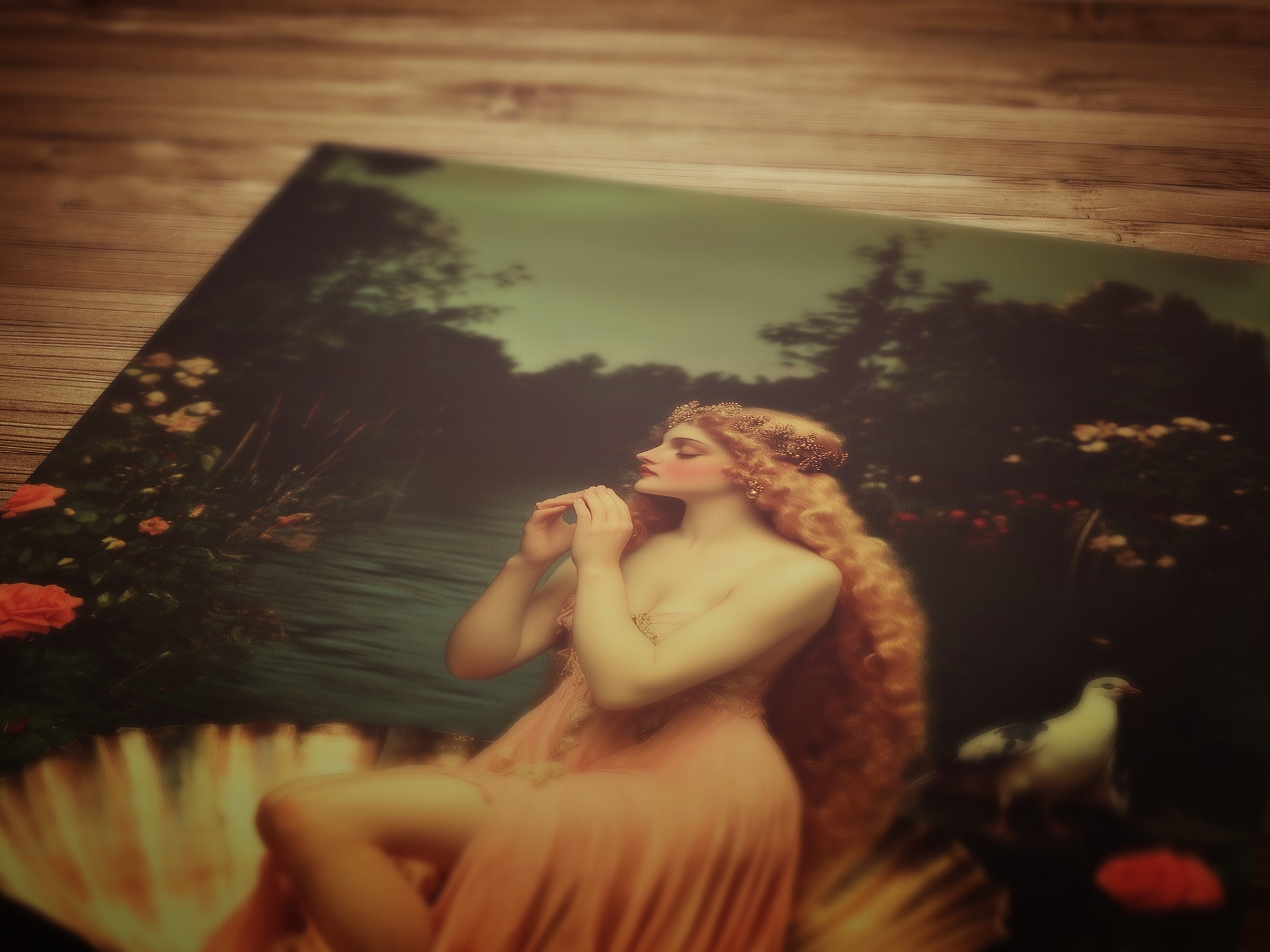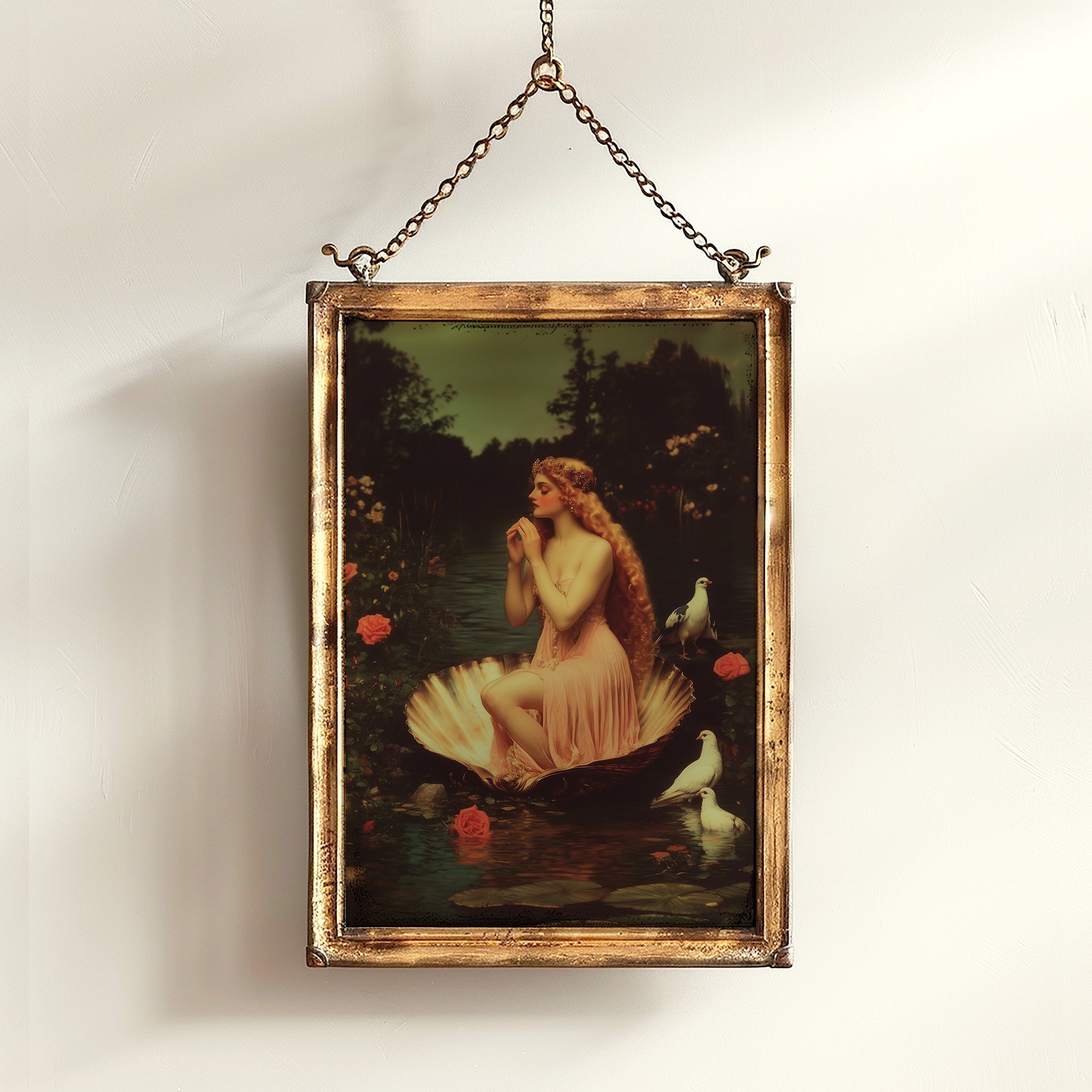 This breathtaking painting features a goddess-like figure reminiscent of Venus or Aphrodite, delicately posed in an open shell surrounded by roses, doves, and serene waters. With glowing skin, flowing hair, and a soft pink dress, she radiates beauty, femininity, and divine elegance. Blending classical mythology with romantic floral elements, this piece captures the dreamy feminine spirit of fantasy and ancient symbolism. A perfect print for those who love goddess lore, fairycore charm, or romantic old-world aesthetics 🌸🕊️✨