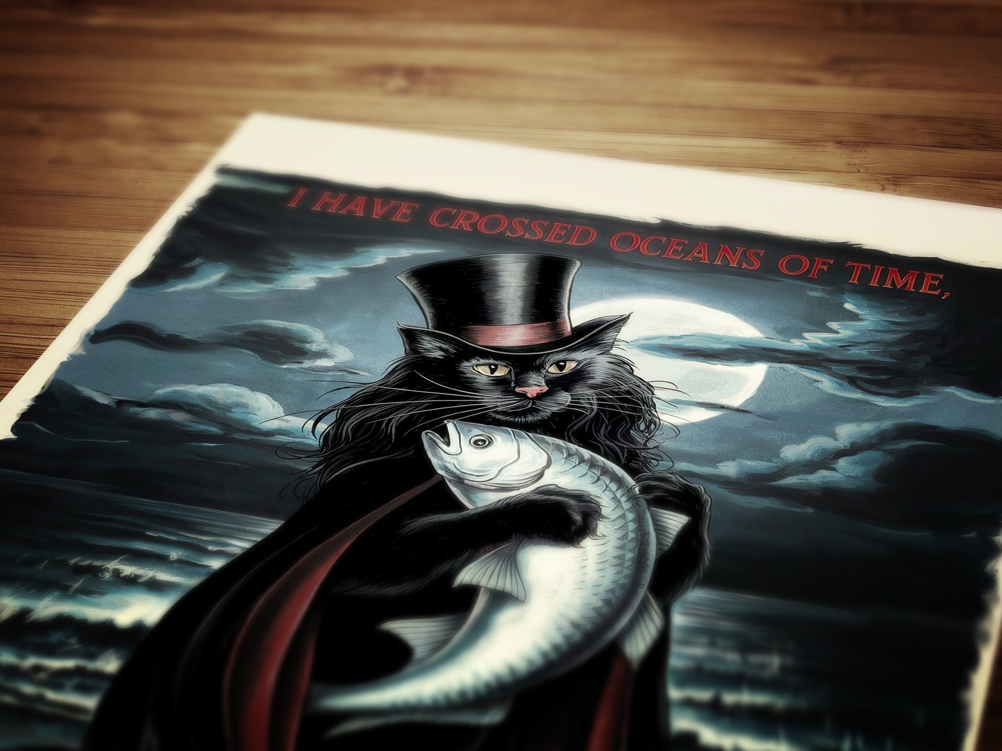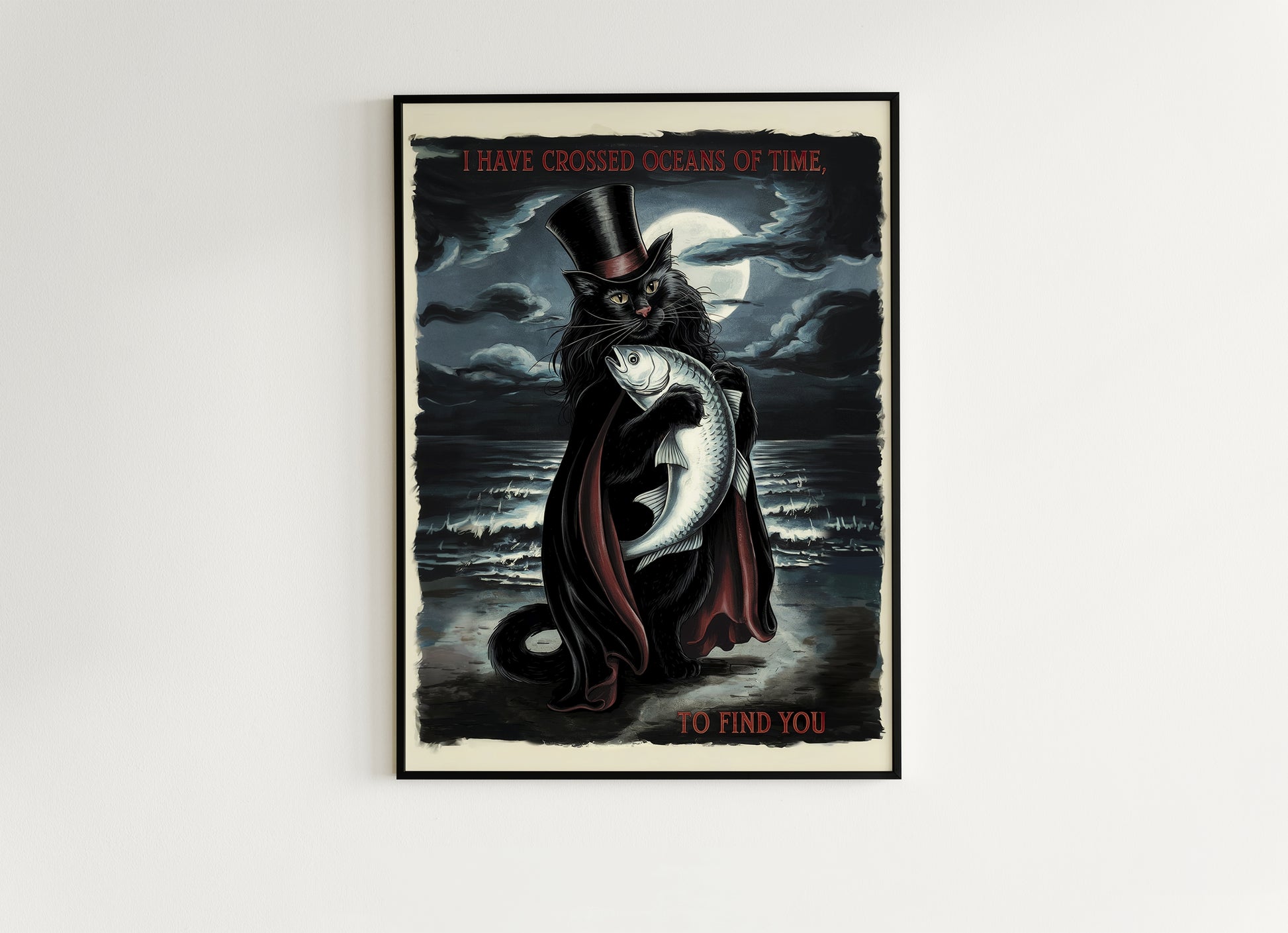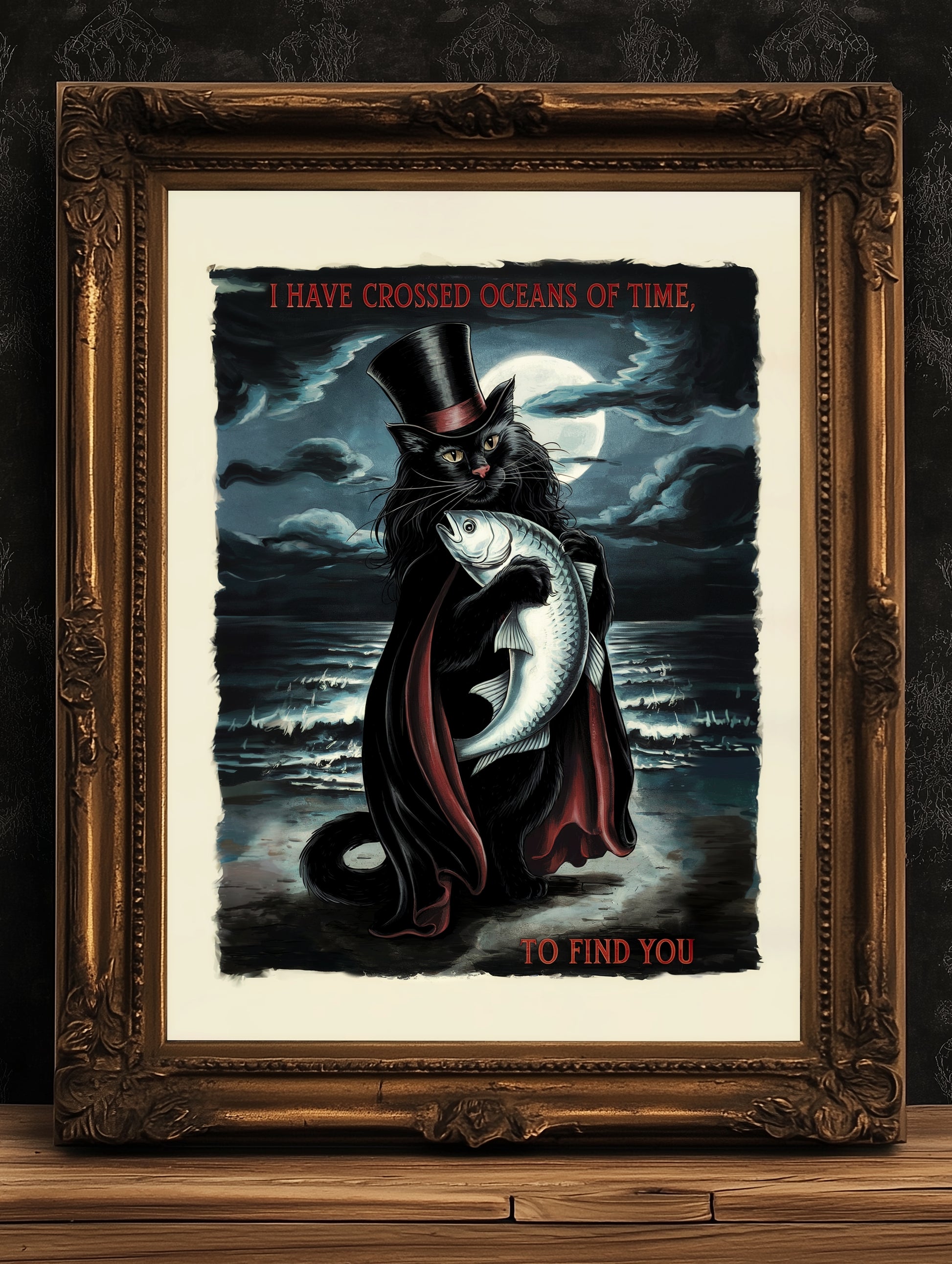 A mysterious cat in a cape holds a fish under a full moon, quoting, “I have crossed oceans of time to find you.” This whimsigoth decor piece fuses dark academia, gothic romance, and absurd feline charm—perfect for anyone who loves moody interiors with a surreal twist. Whether you're building a vampy reading nook, decorating a dark cottagecore space, or gifting a fellow weird item collector, this “Vampurr” is the statement piece you didn’t know you needed 🦇🐾.
