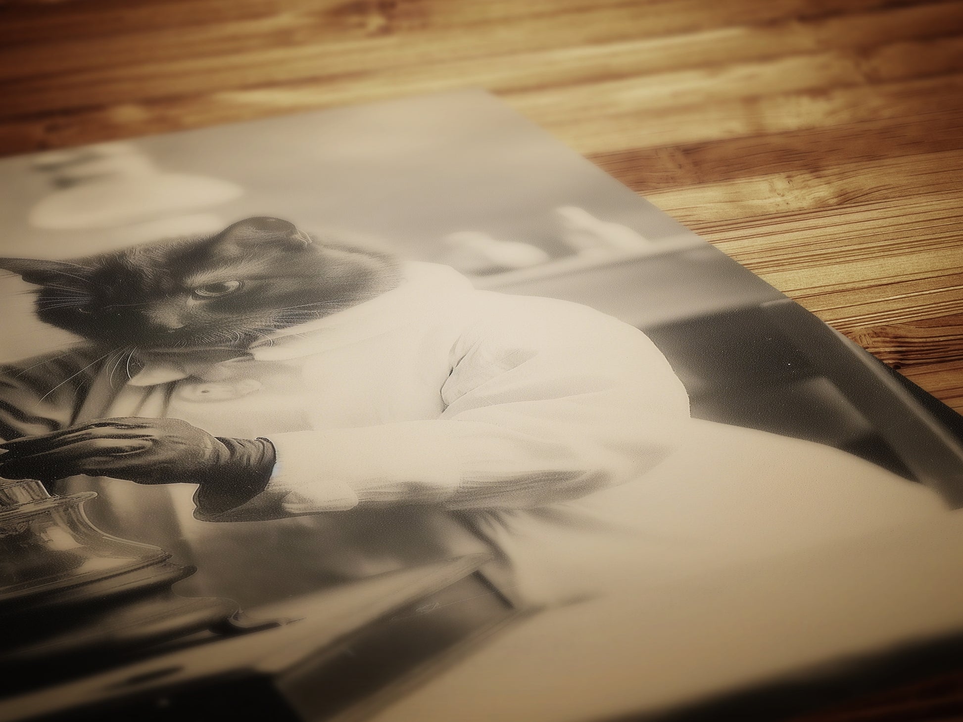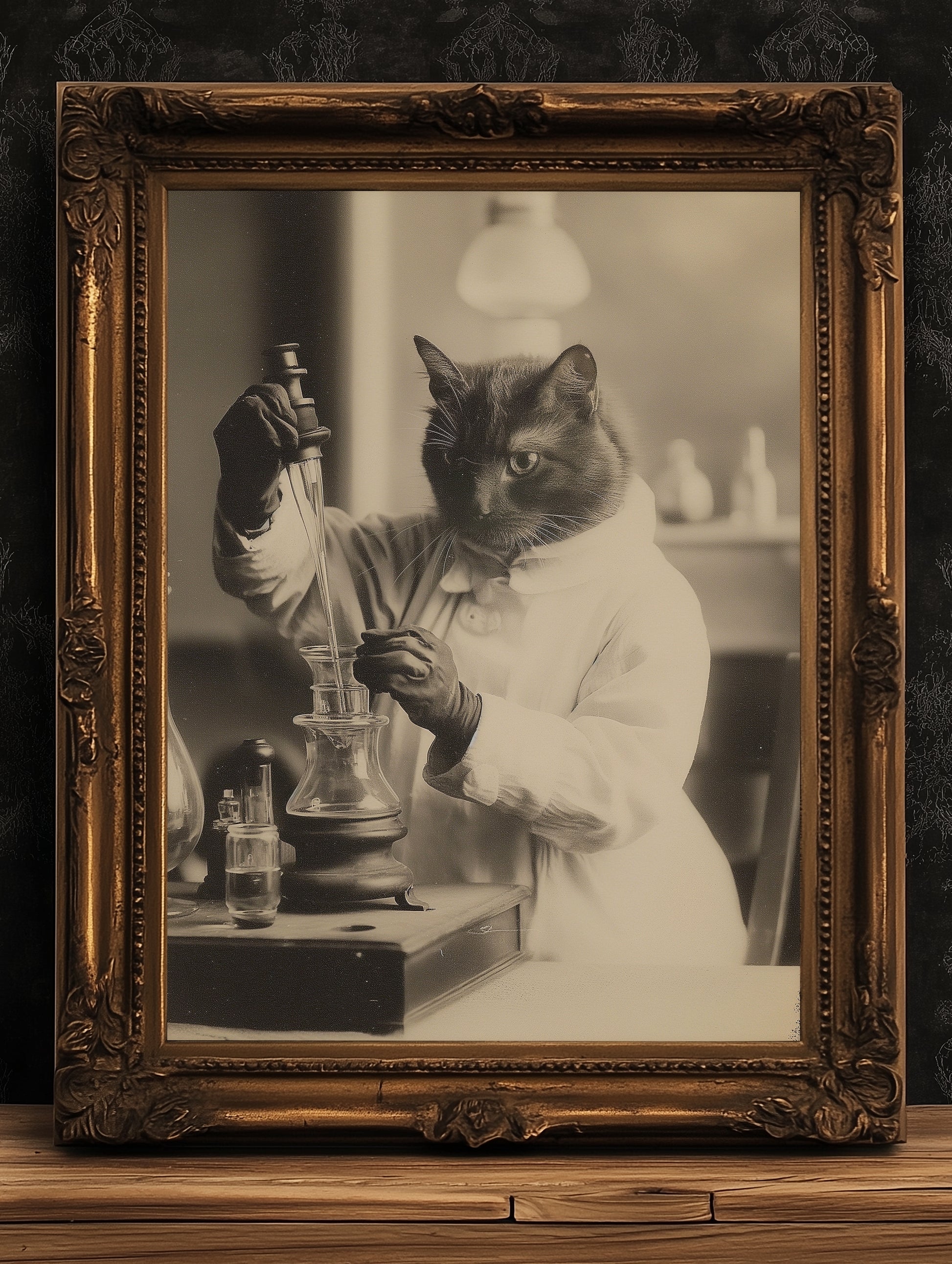 Behold, Minette, our beloved feline pet, captured in a Victorian photograph, embodying the spirit of Marie Curie with a whimsical twist. This unusual and unique print presents Minette as the scientist of the arcane, a nod to vulture culture and occult artistry. A perfect addition to eclectic posters and bizarre art prints, this piece blends obscur art with Victorian dark decor, ideal for cat lovers seeking spooky decor or a special animal lover present. An exceptional husband and wife gift, this enchanting portrayal adds a touch of vintage elegance and scientific mystique to any home.