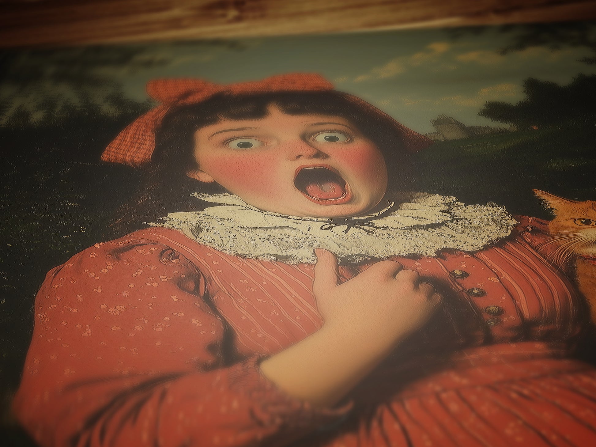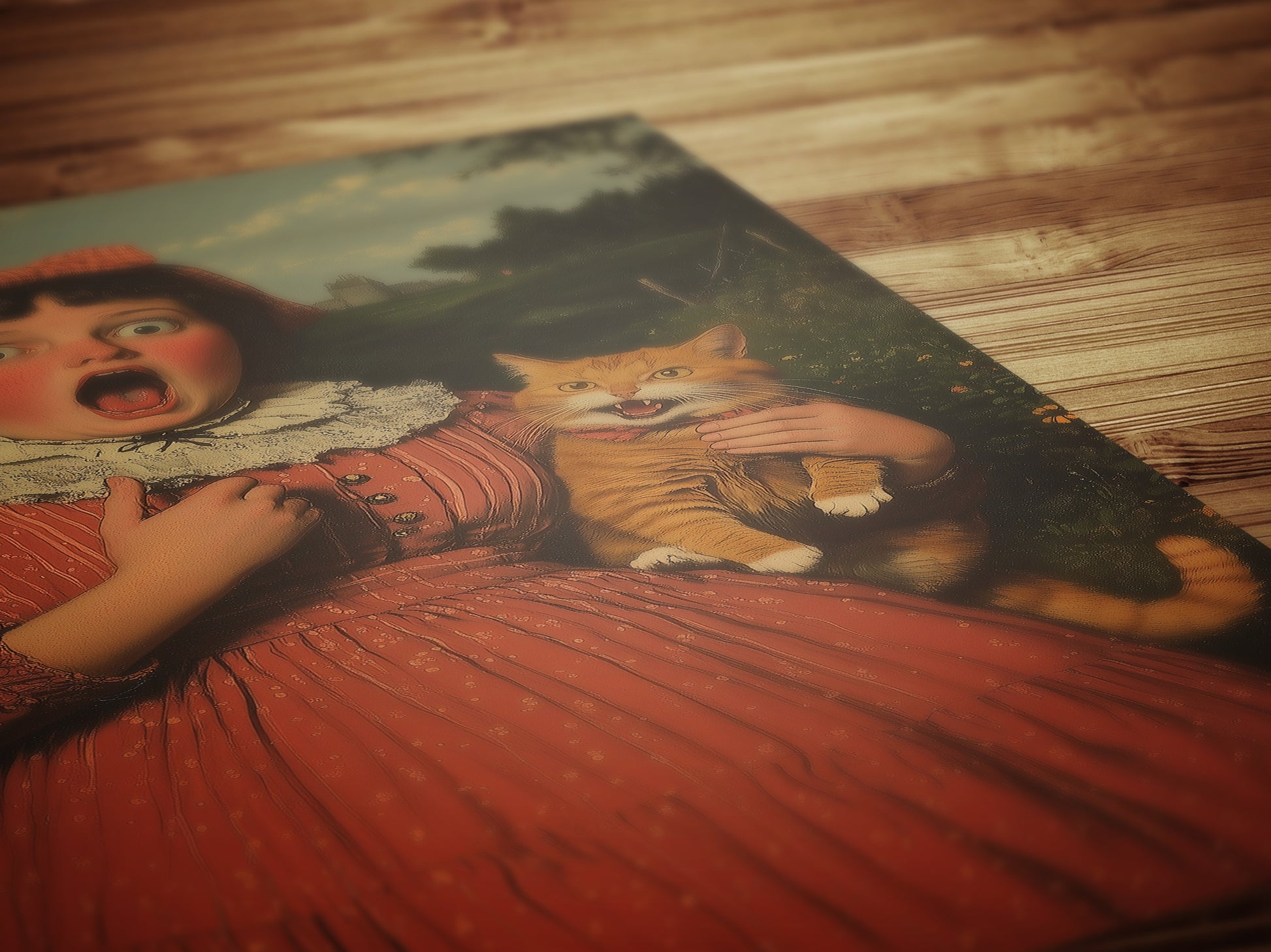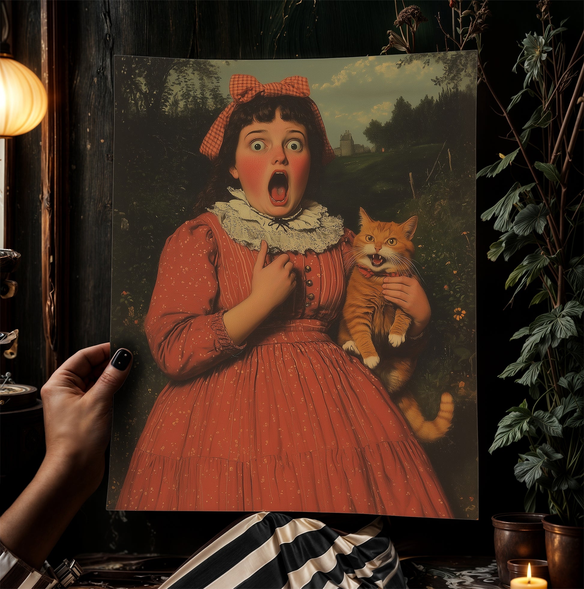 This hilarious vintage-style cat wall art features a shocked little girl clutching an equally surprised orange tabby making it the perfect blend of weird, whimsical, and wonderful. Ideal for cat lovers with a sense of humor, this quirky cat print adds personality to any gallery wall, bathroom, or eclectic space. A fantastic choice for fans of funny altered art, weirdcore design, and unexpected decor moments!
