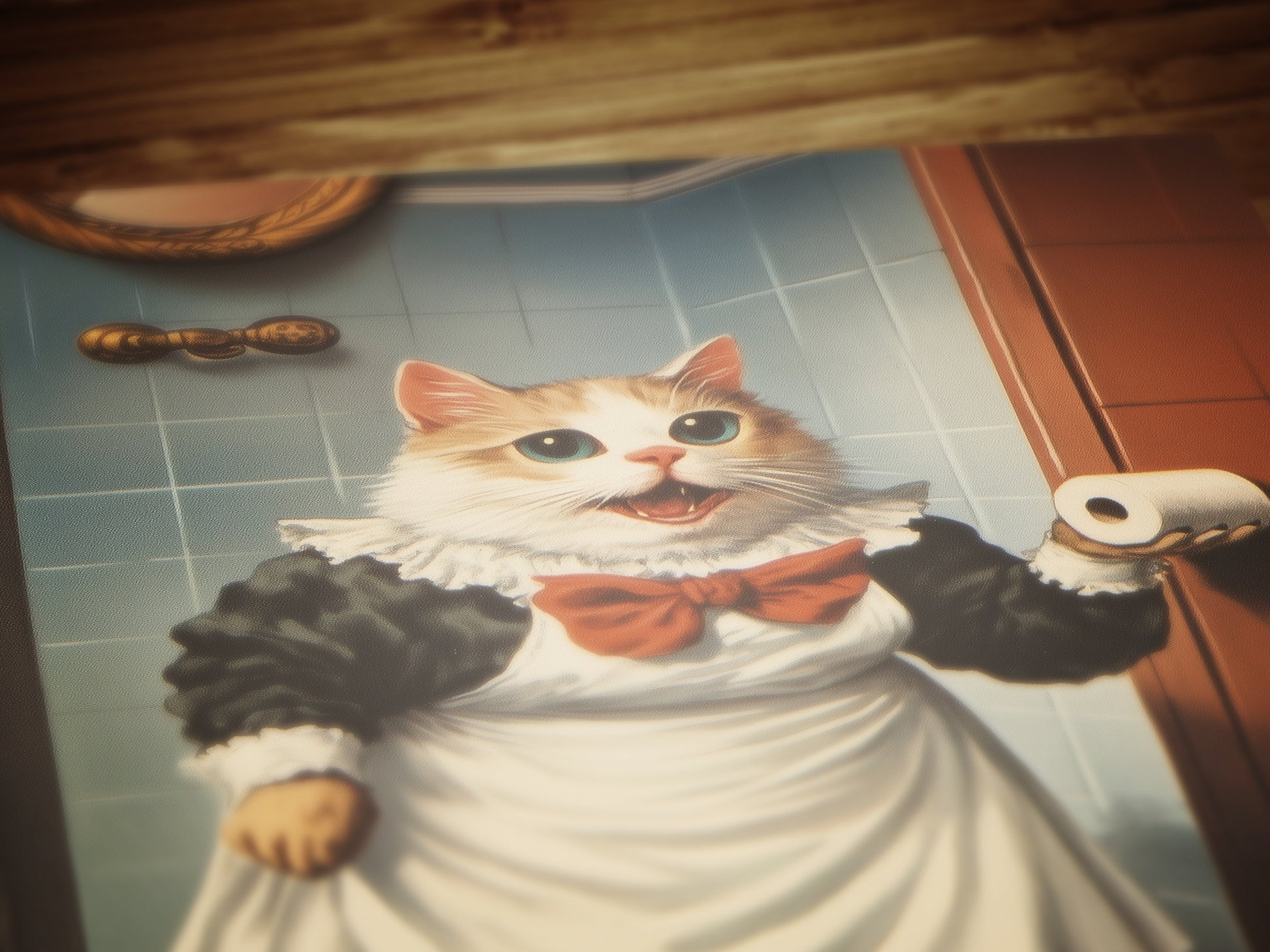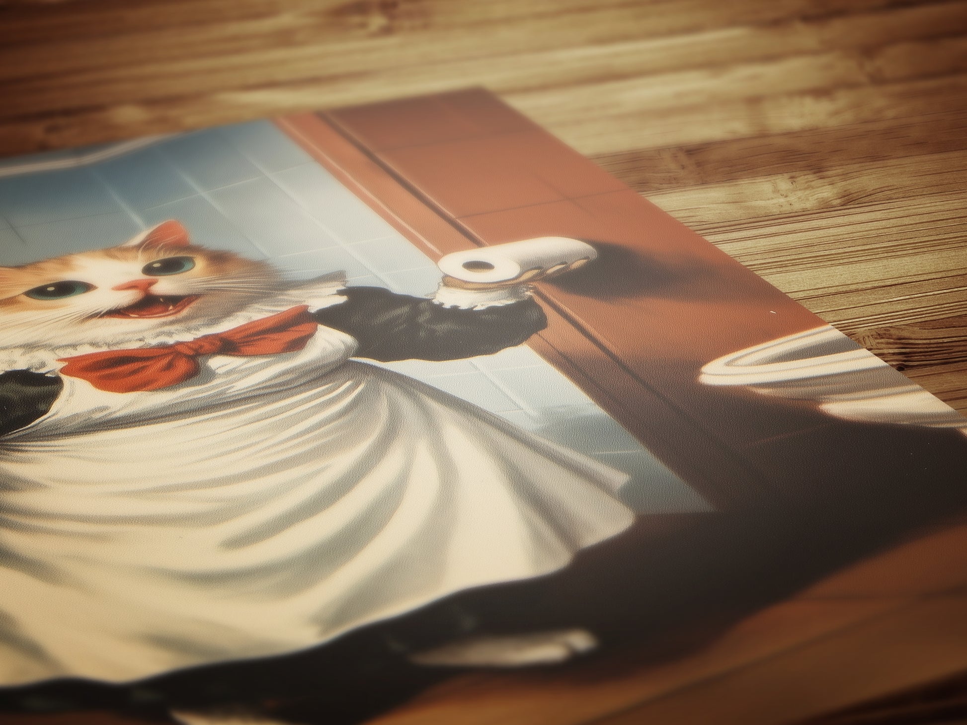 🐱 Funny Cat Art: Features a cute, well-dressed orange cat in a maid outfit holding toilet paper