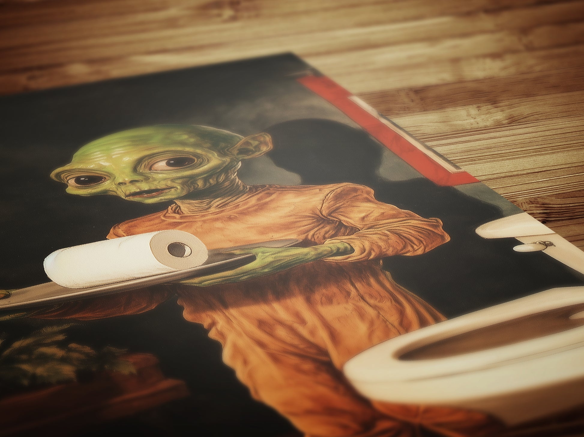 This hilarious alien poster features a green extraterrestrial in a jumpsuit politely offering toilet paper—just what your quirky bathroom needs! A perfect blend of weird humor and charmingly bizarre style, this bathroom art print is a fun conversation starter and a great gift for anyone who loves the unexpected.