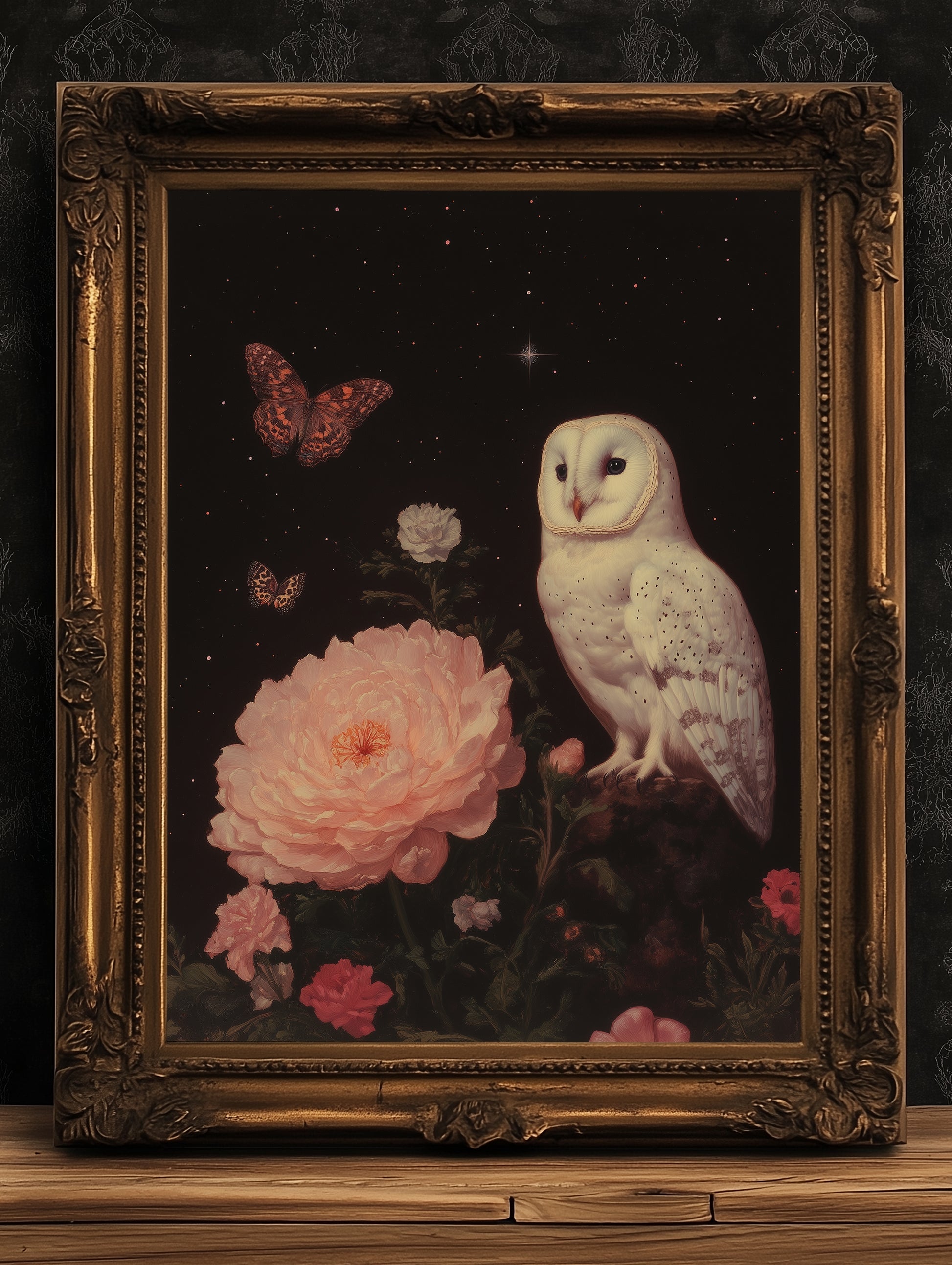This enchanting barn owl painting features a serene owl perched among blooming flowers beneath a starry sky, surrounded by butterflies and a quiet, eerie calm. Perfect for gothic cottagecore wall art lovers, dark academia enthusiasts, or anyone drawn to animals, and nature’s stillness and mystery, this piece blends elegance with quiet power.