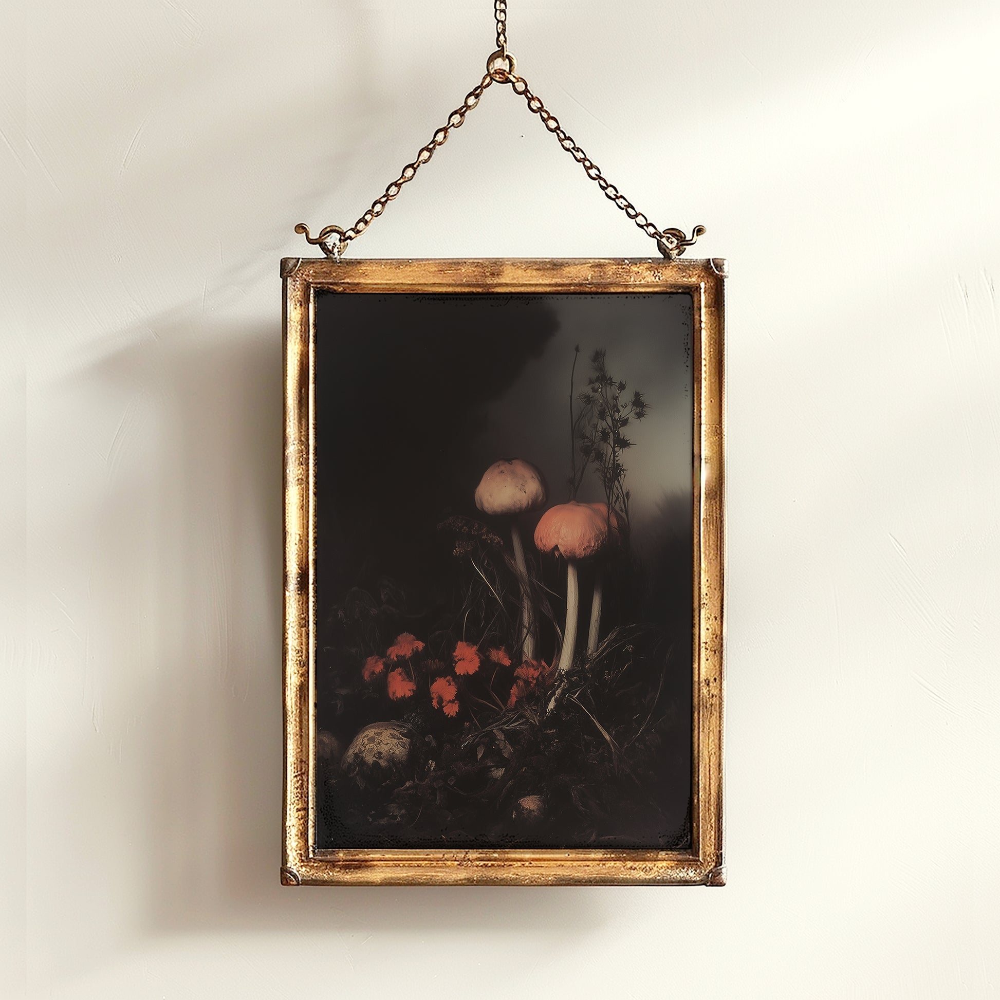 This hauntingly beautiful art print features a surreal composition of dark mushrooms and delicate red florals, perfect for lovers of gothic nature themes and moody decor. With deep shadows and rich earthy tones, itβs an ideal accent for witchy homes, whimsigoth interiors, or dark academia walls.