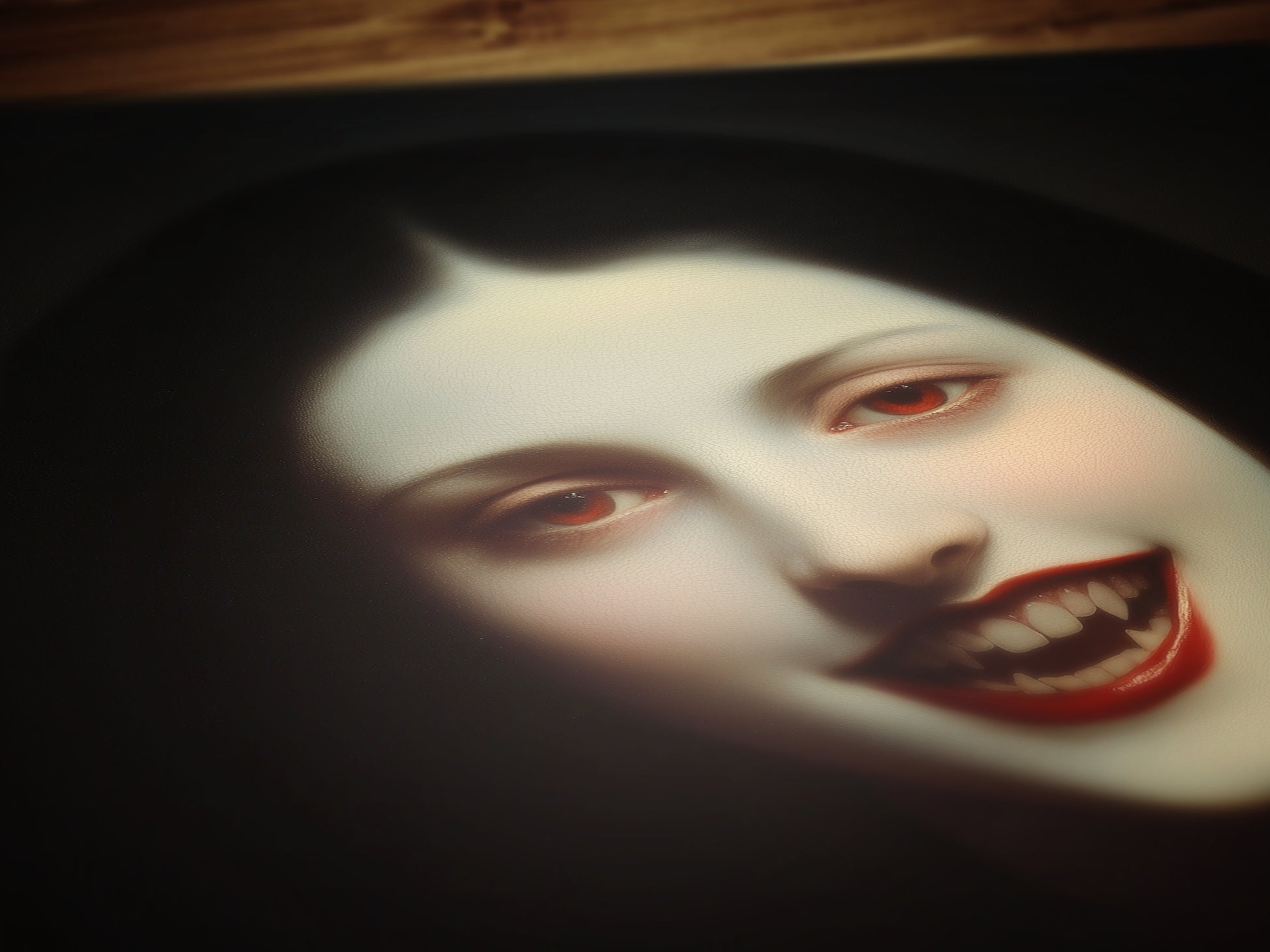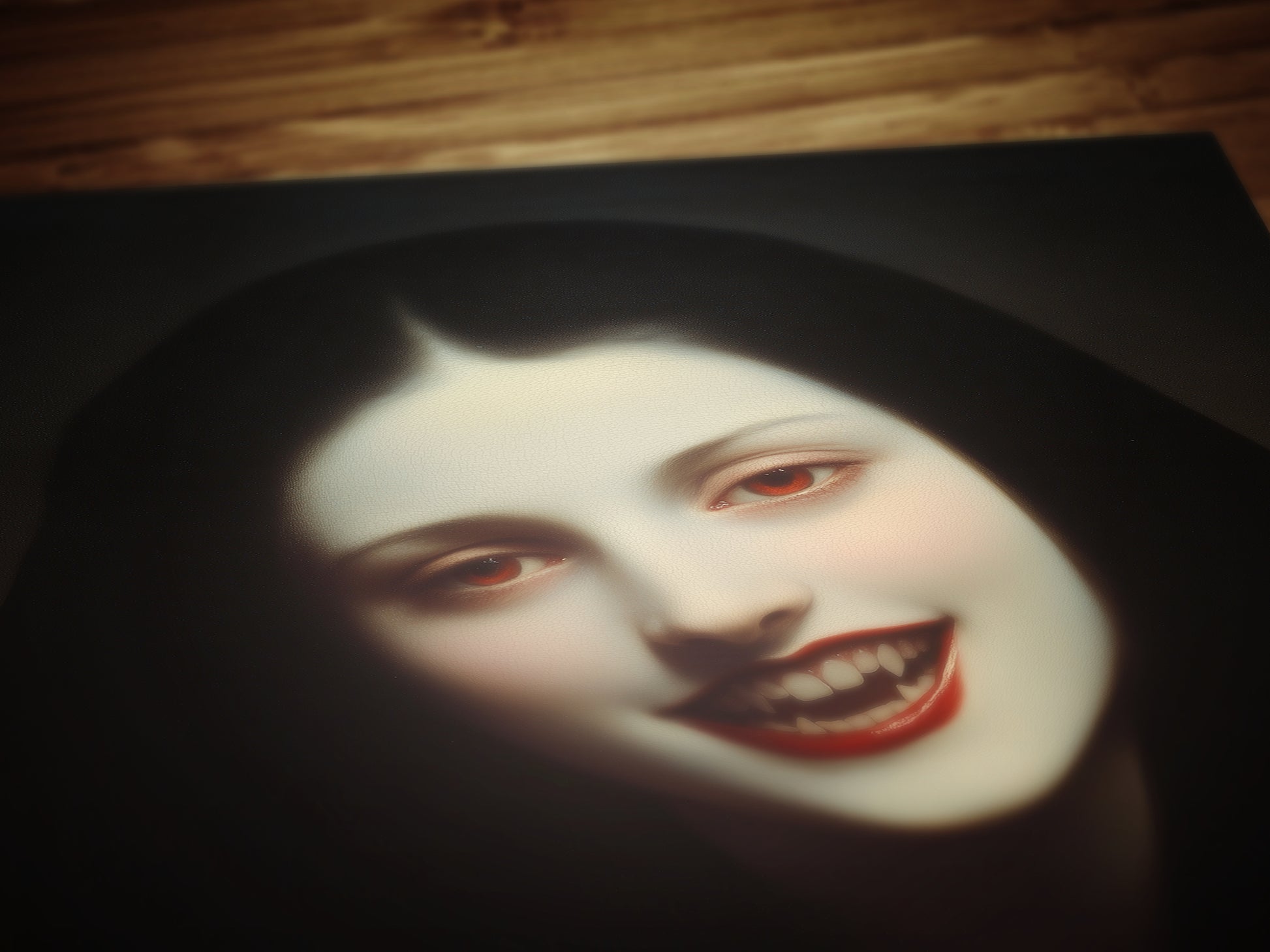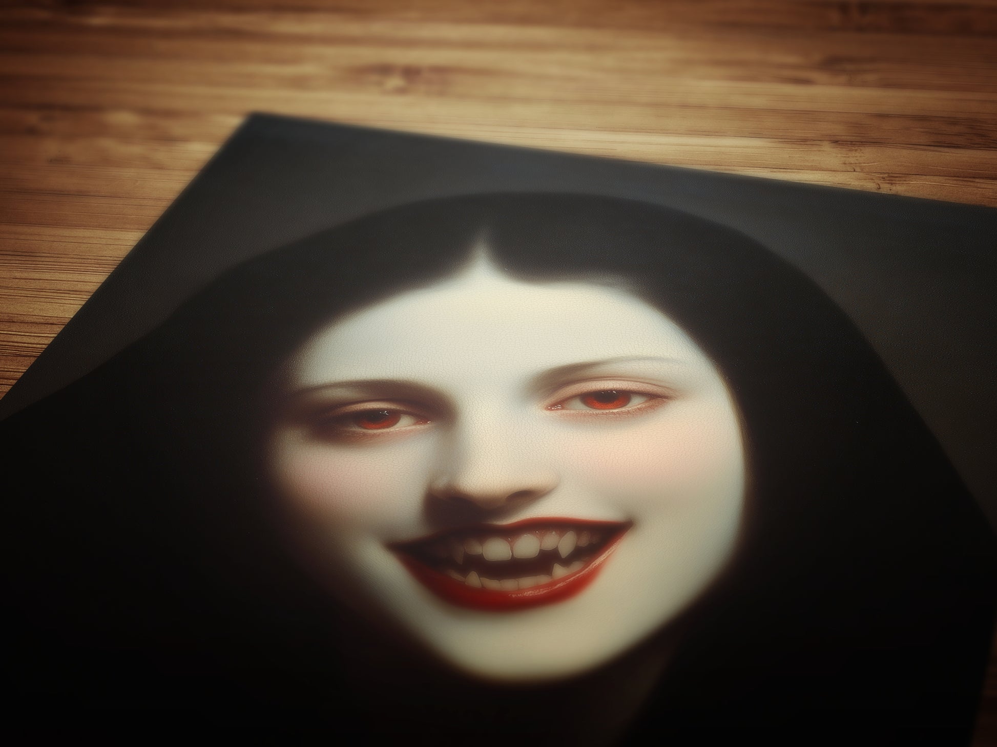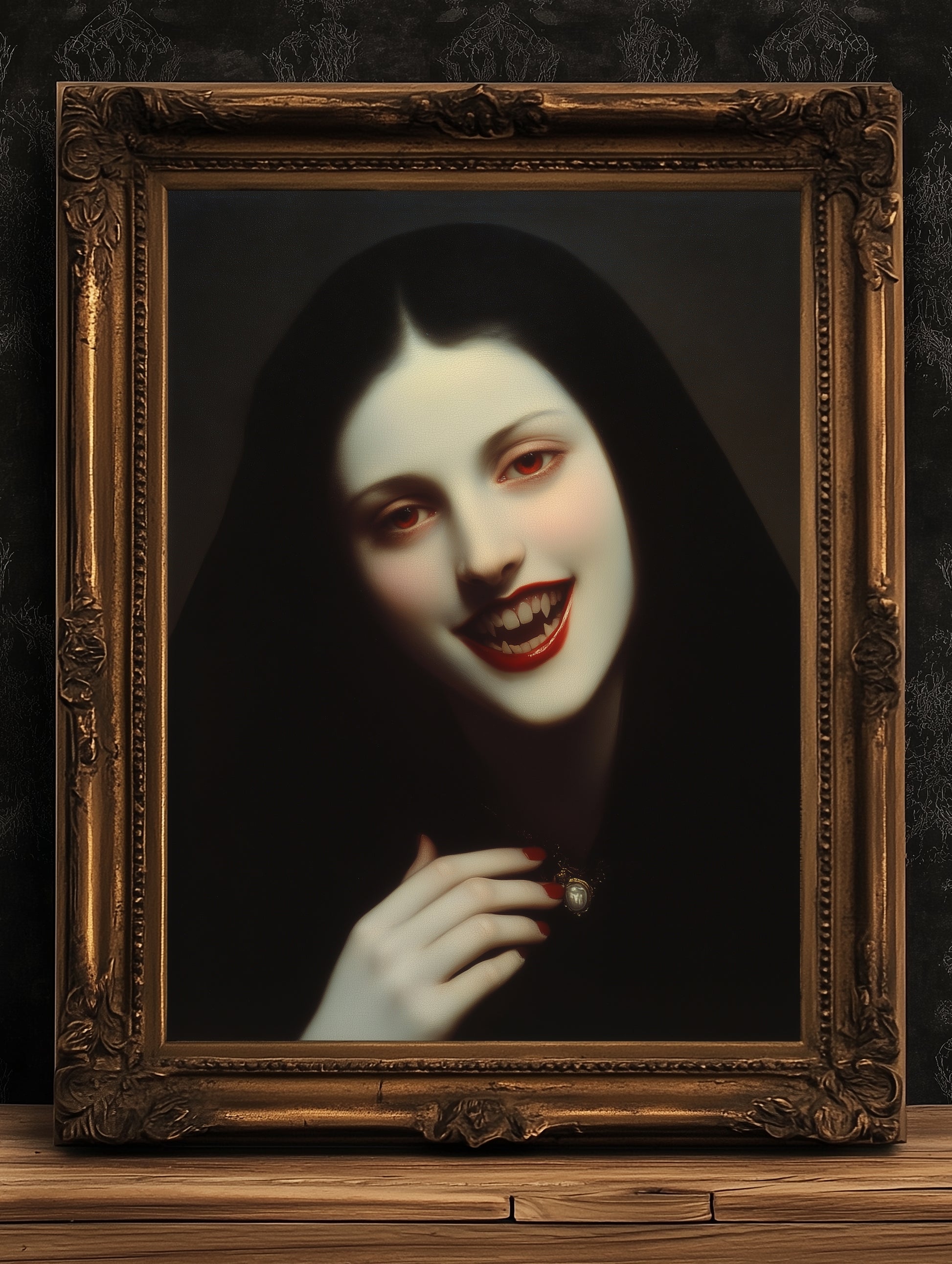 This hauntingly elegant wall art print features a pale, mysterious vampire woman with a chilling smile and blood-red lips, capturing the beauty of melancholic femininity and gothic romance. Perfect for lovers of castlecore, vampire lore, and dark academia decor, it adds an eerie yet enchanting presence to any room.