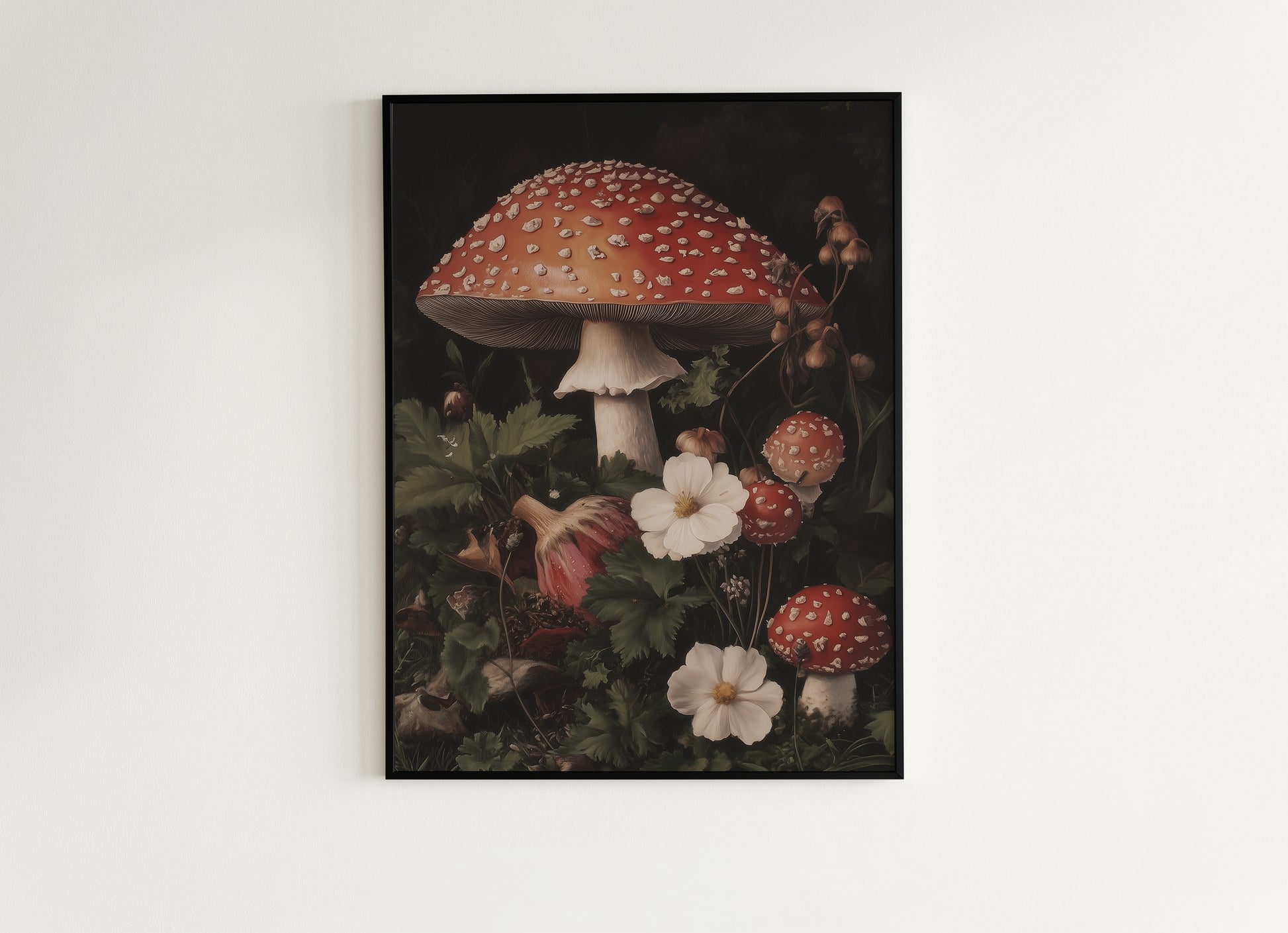 Dark Florals And Mushroom Art Print, Red Toadstools and Blooms, Moody Dark Academia Poster, Whimsigoth Cottagecore Wall Decor Gift for Her