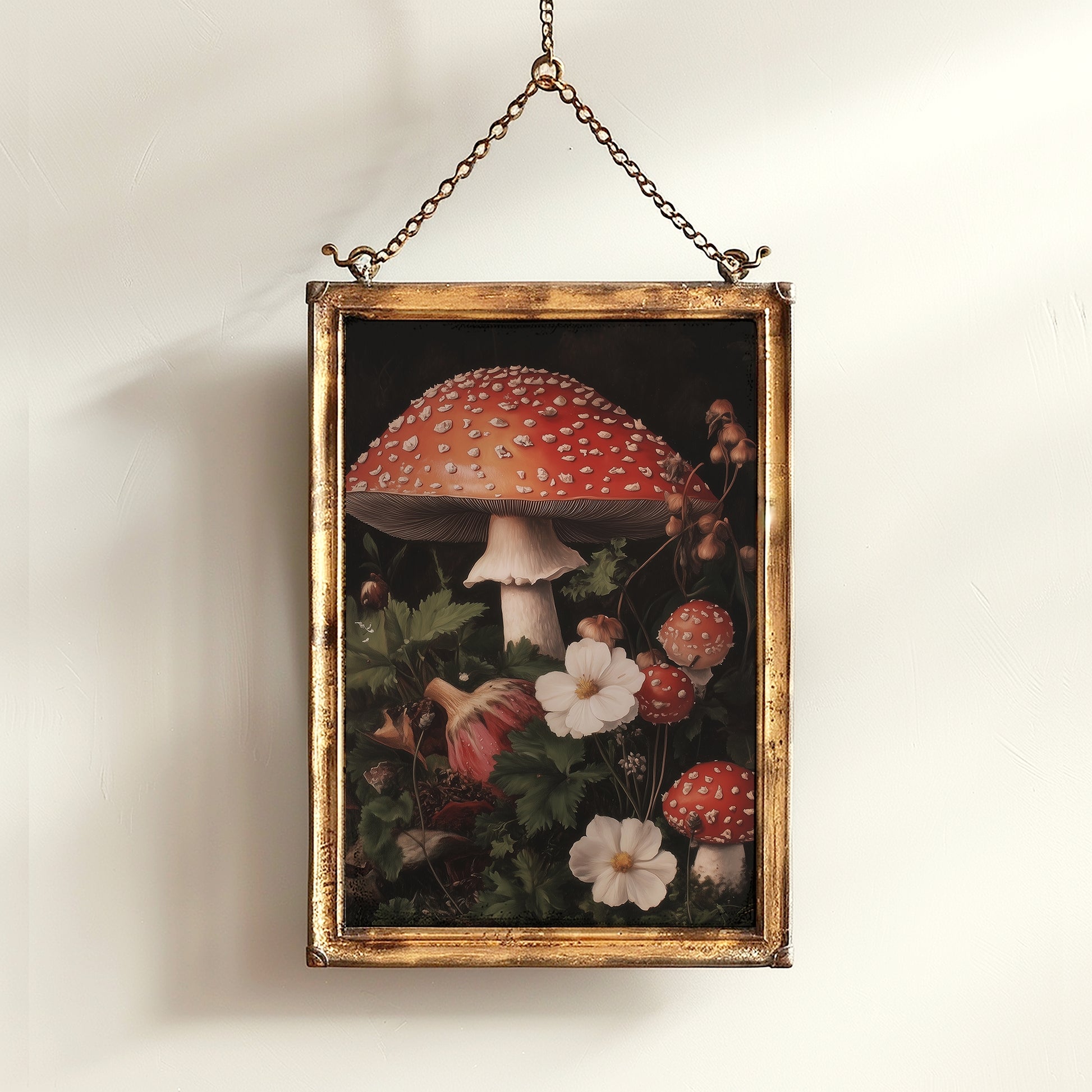 π Surreal Dark Mushroom Art Print with rich red caps, lush greenery, and vintage floral details