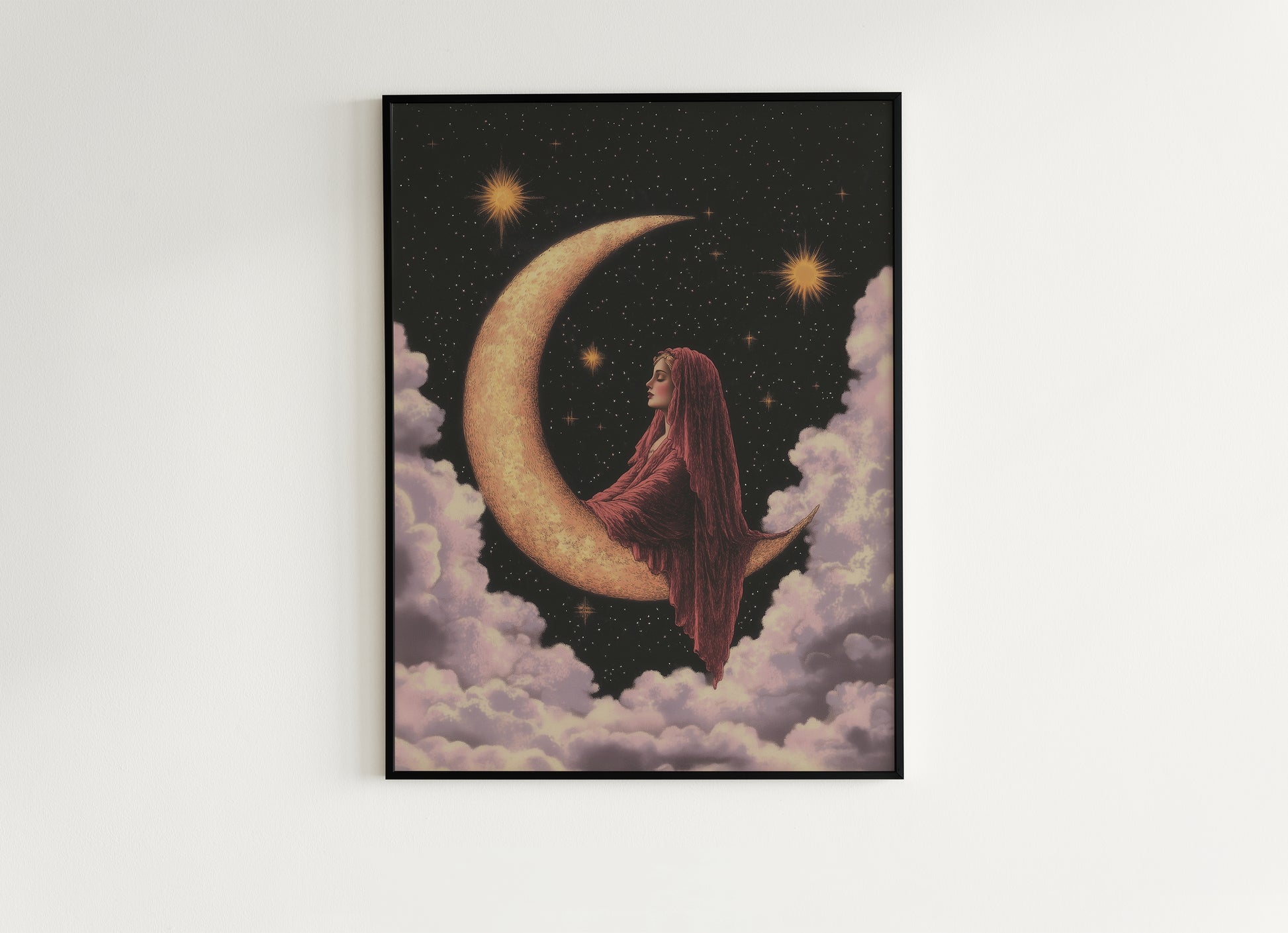 Bring the stars indoors with this enchanting moon painting print πβ¨. Featuring a mystical maiden resting on a crescent moon amid glowing stars and cotton-candy clouds, this celestial wall art blends vintage charm with whimsigoth and fairycore elegance. Perfect as both decor and statement wallpaper-style accent, it's one of our best selling magical art pieces.