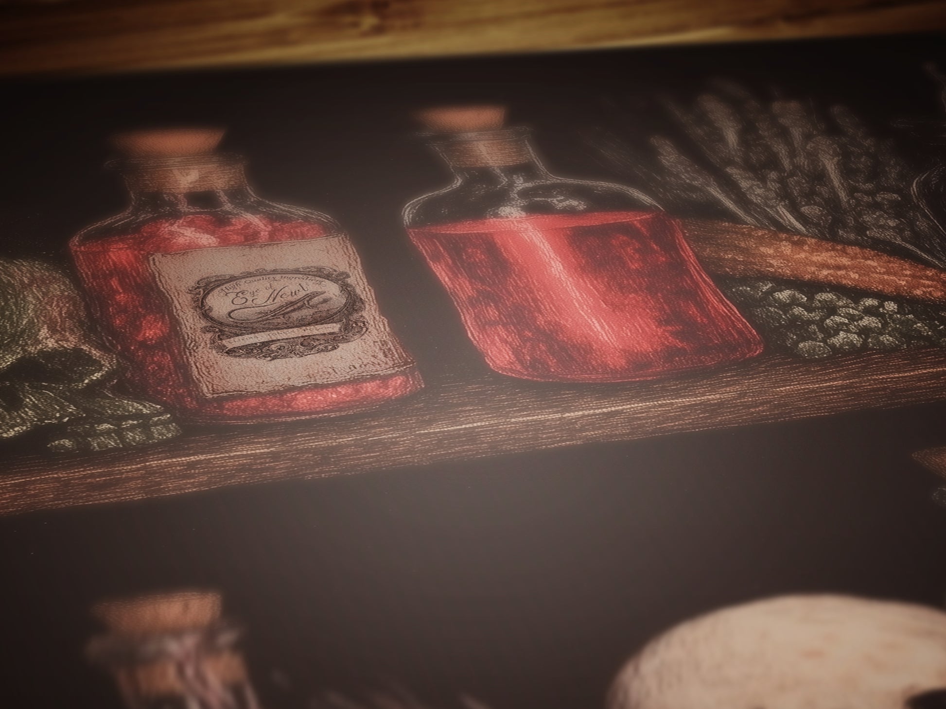 π§΄ Detailed shelves display glowing red potions, labeled bottles, and mystical ingredients