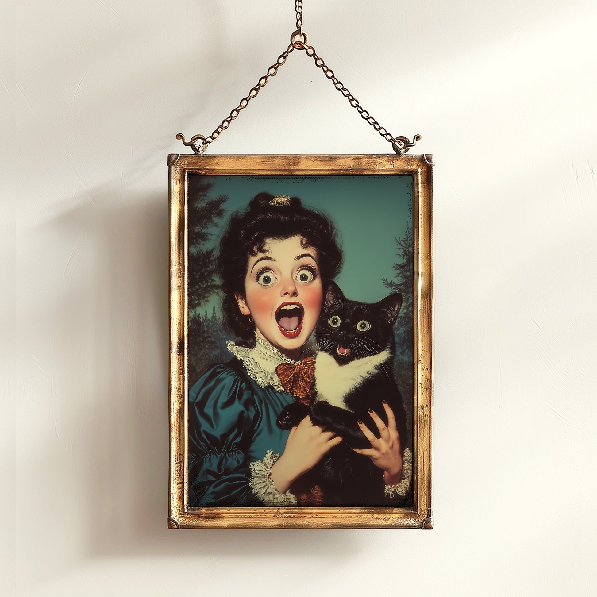 Surprised Woman And Cat, Vintage Humor Altered Painting, Funny Bathroom Toilet Wall Poster Weird Classic Art Gift Shocked Digital Cat Print