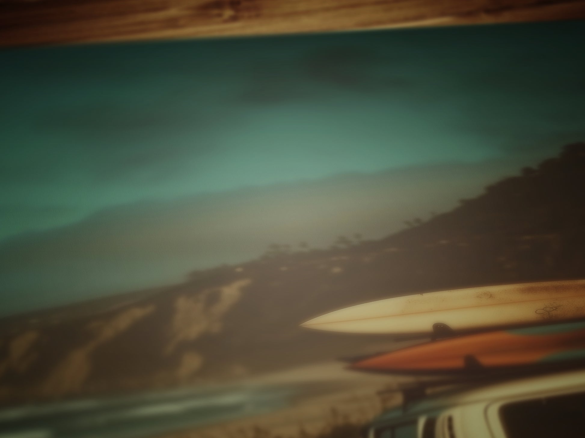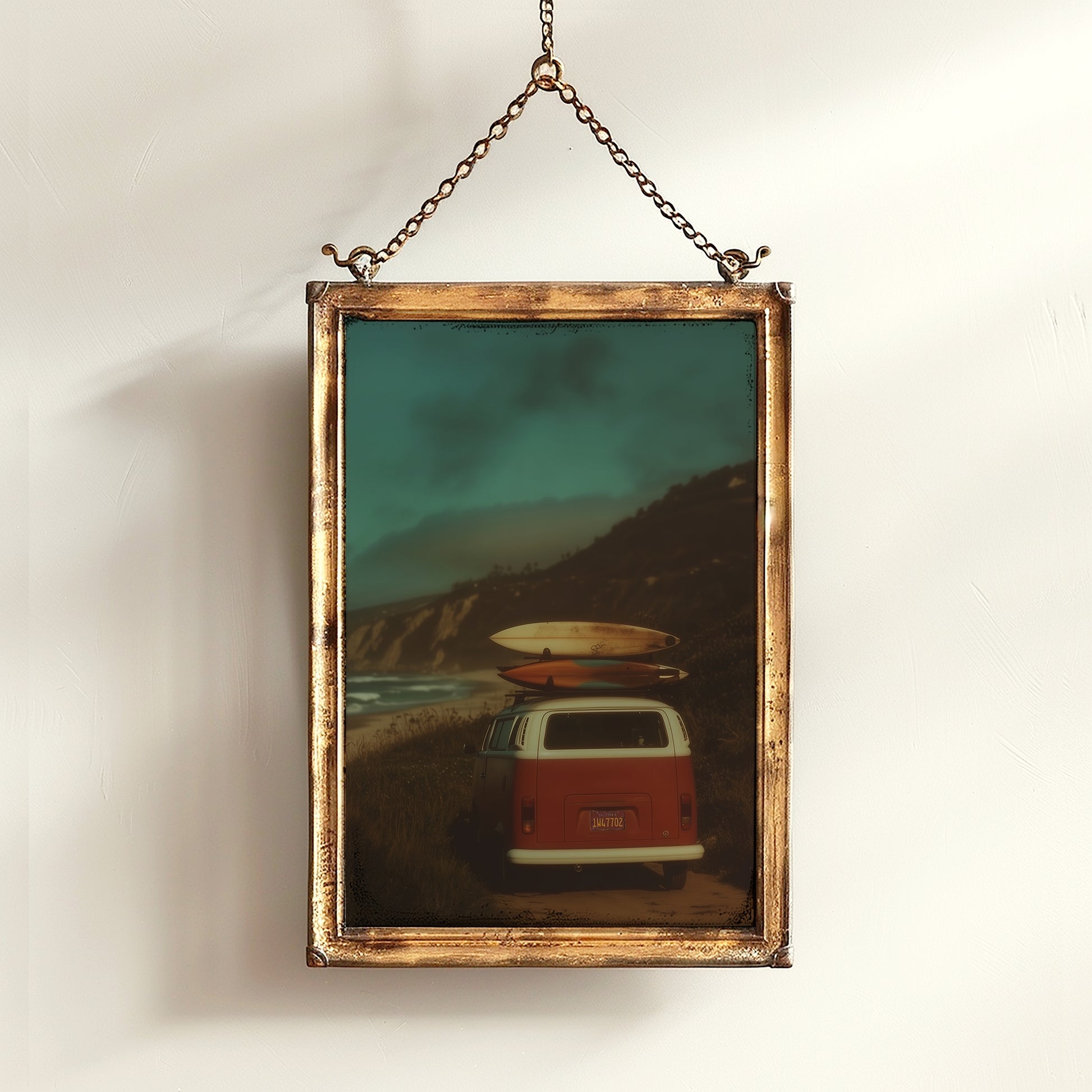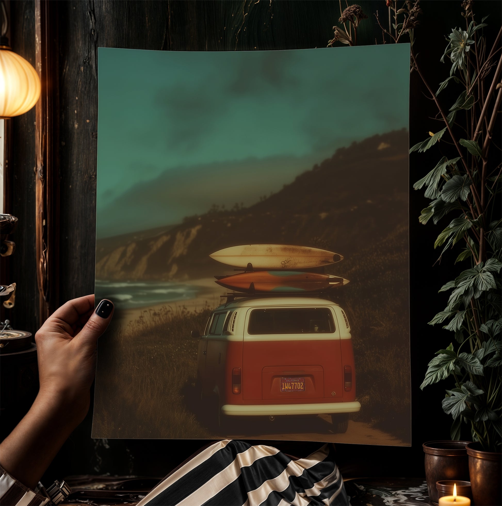 A serene moody beach moment frozen in time this canvas wall art features a vintage surf van parked beneath coastal cliffs, a surfboard ready on top, and a sky filled with calm anticipation π΄πβοΈ. Perfect for those who live to surf or simply dream of ocean air, this piece blends retro charm with peaceful vibes for any wall.