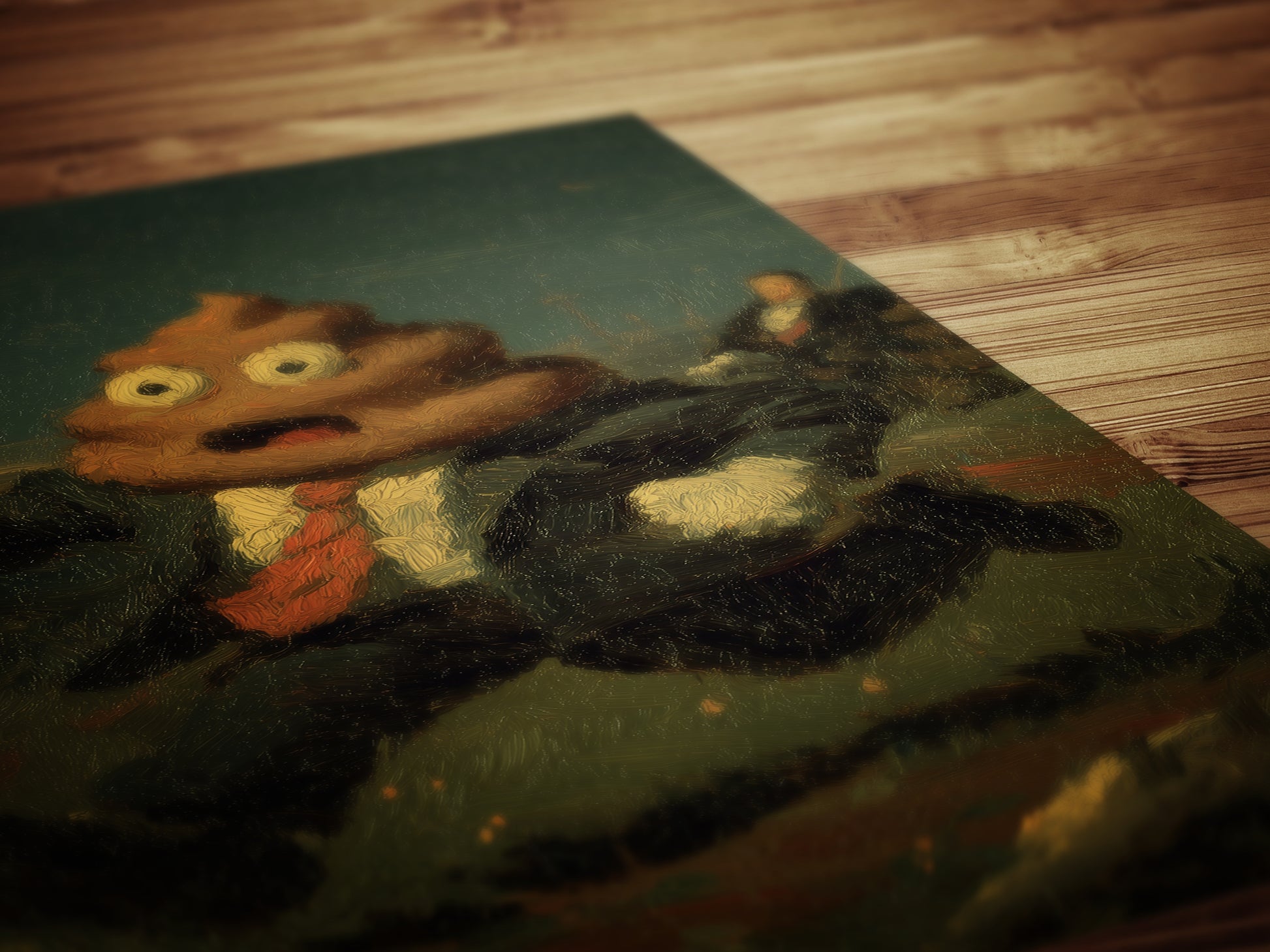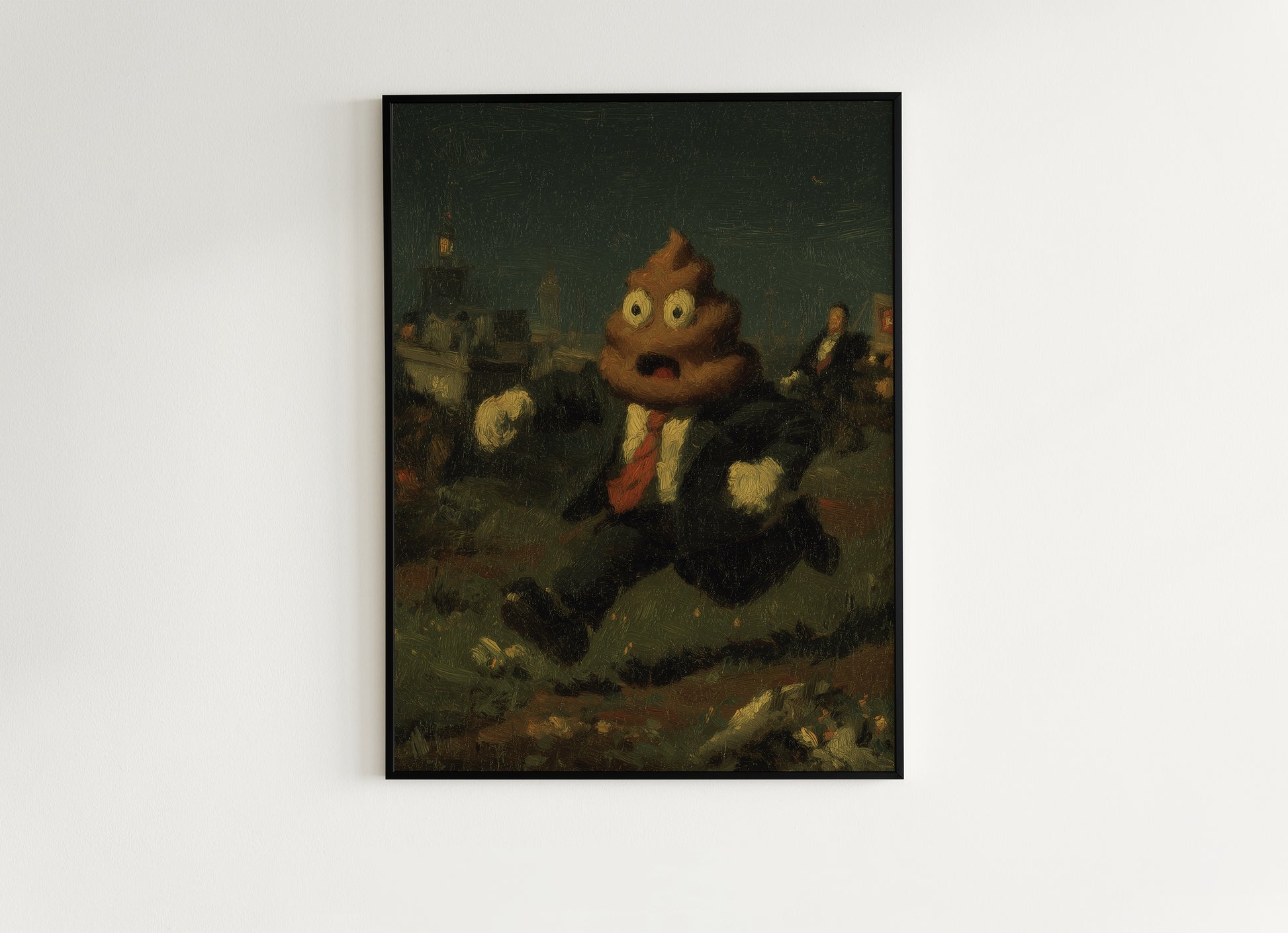 Make your bathroom break unforgettable with this wild and wonderfully weird poop emoji artwork! 💩 Set against a moody oil-painting style backdrop, this poop-headed character in a business suit delivers a hilarious clash of sophistication and absurdity—perfect for lovers of surreal, inappropriate, or weirdcore humor.