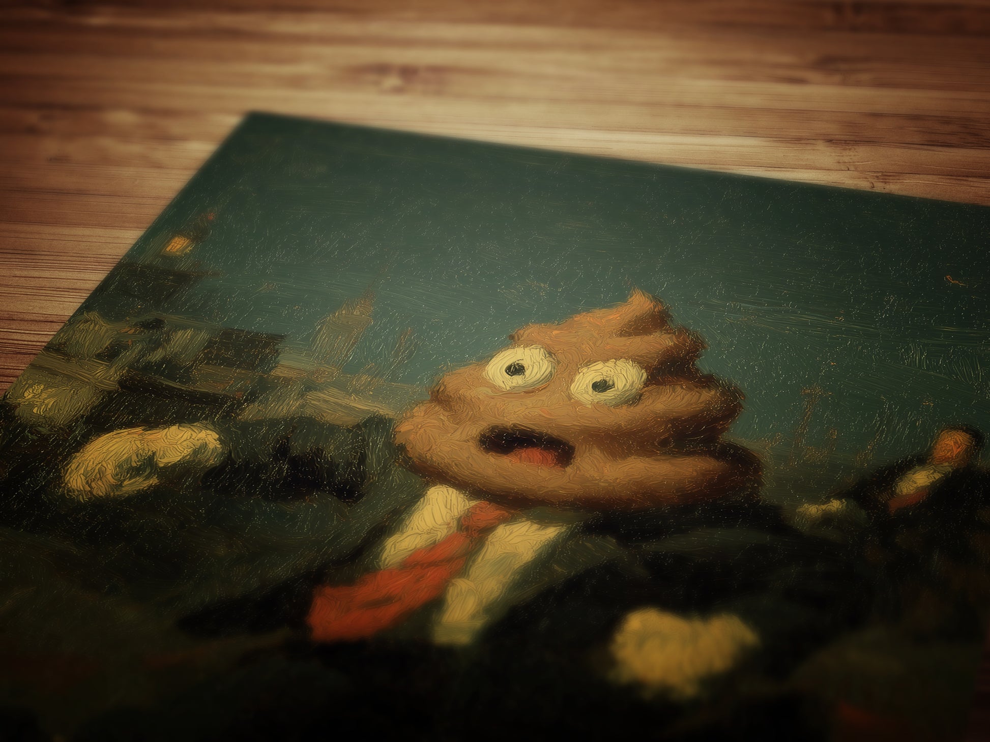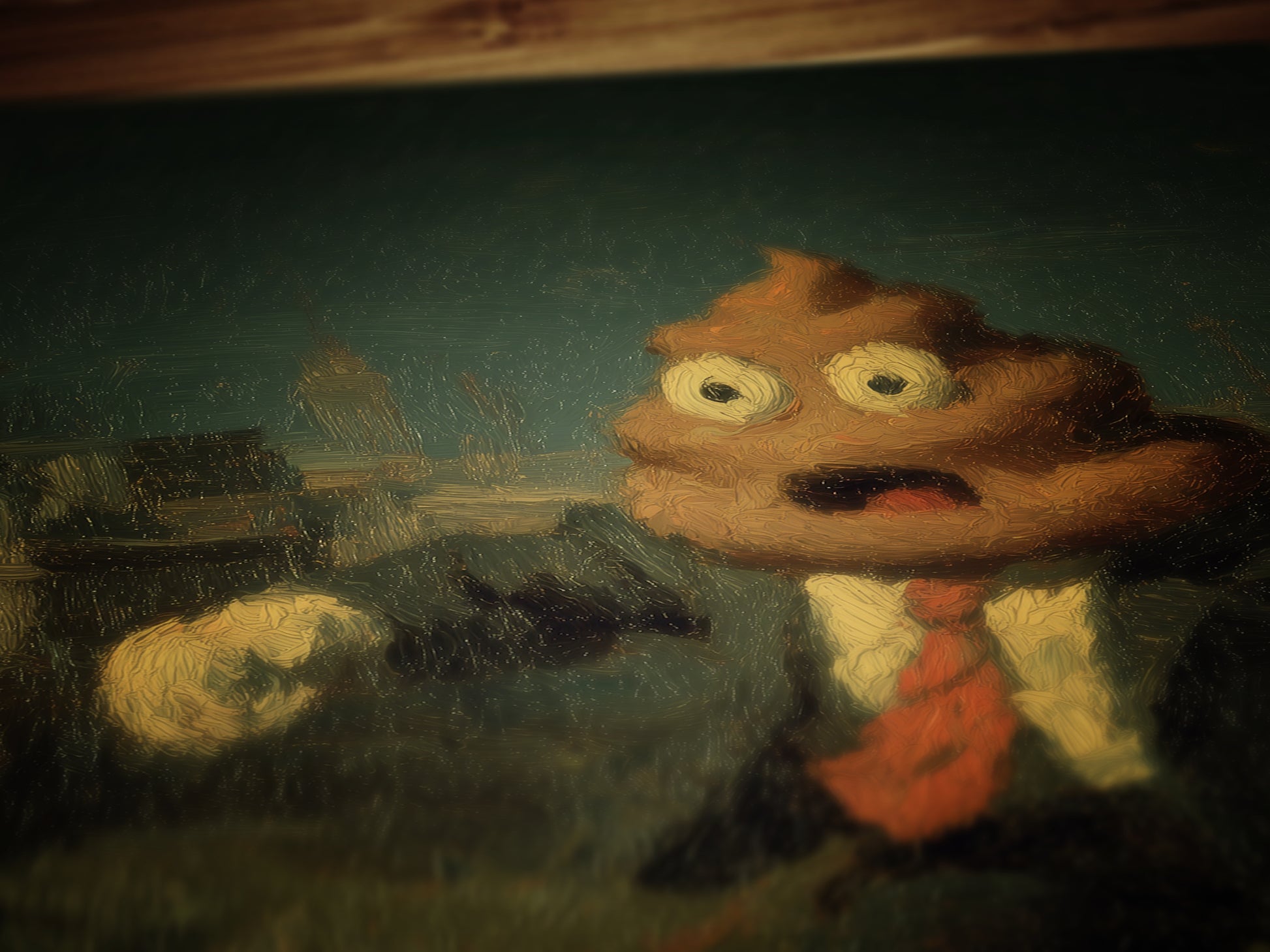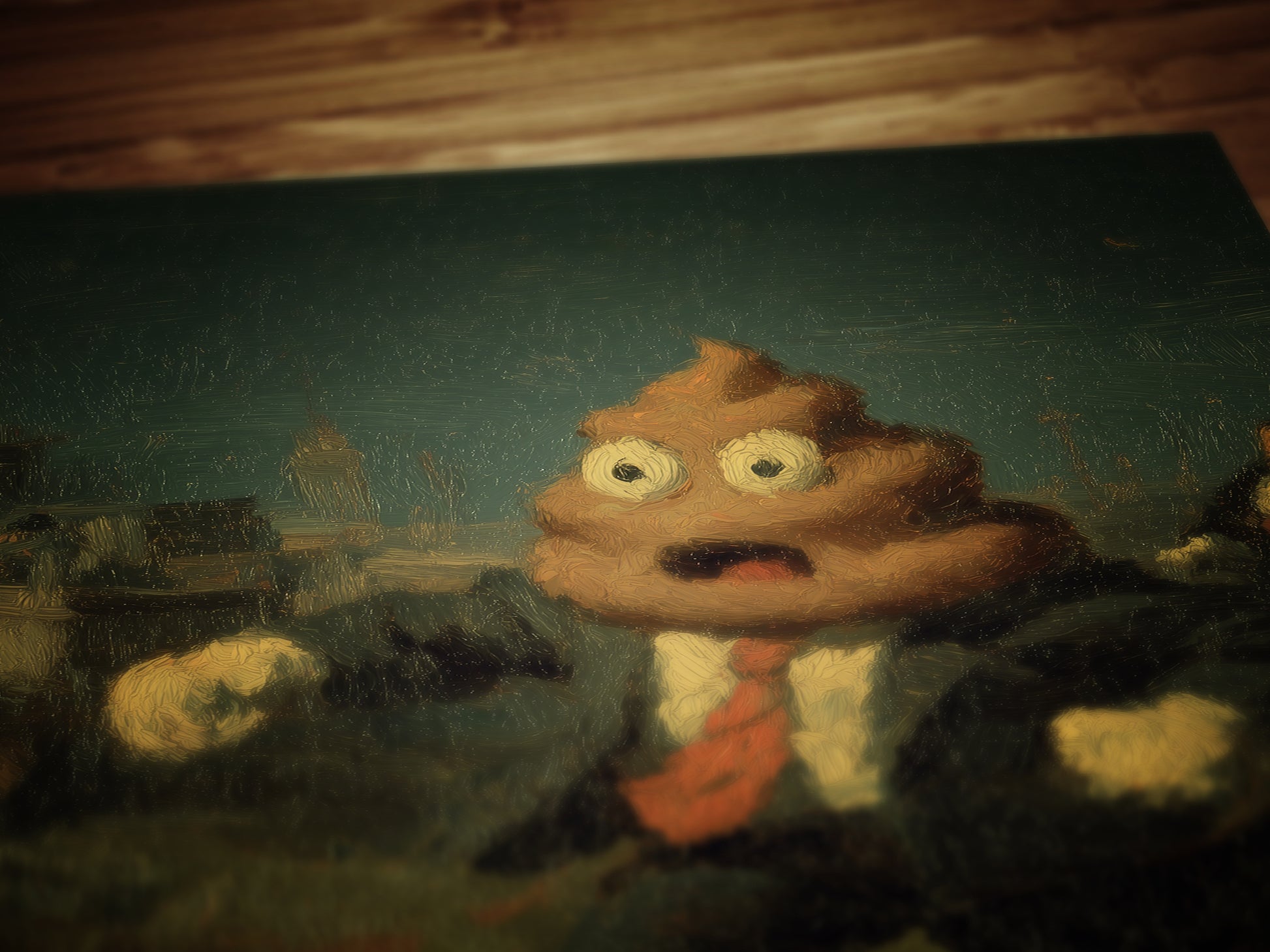 💩 Features a classic poop emoji character in a vintage-style painted scene