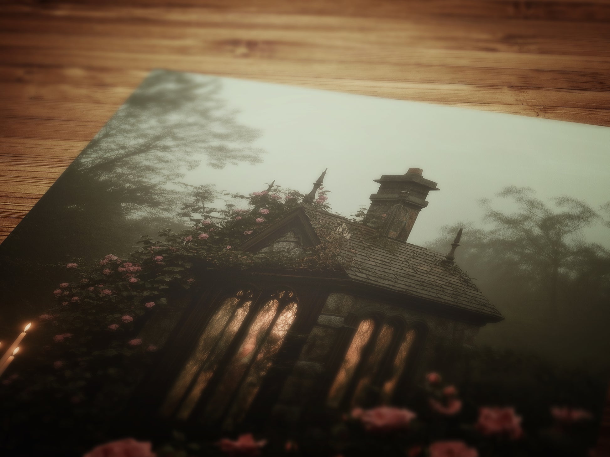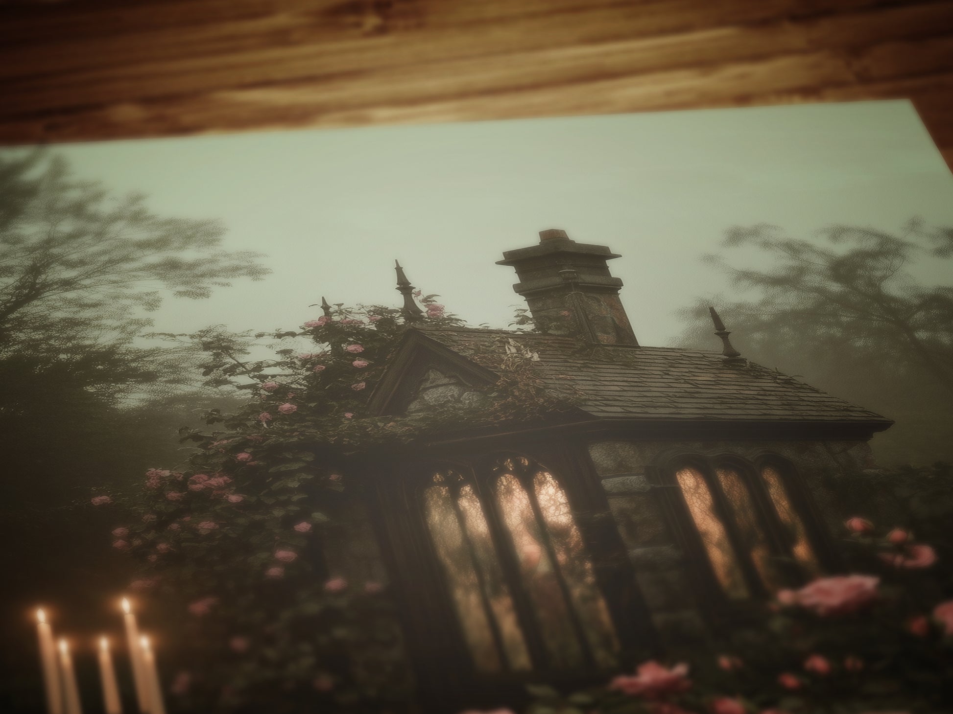 π₯ Features a shadowy botanical floral landscape with roses, candles, and misty woodland