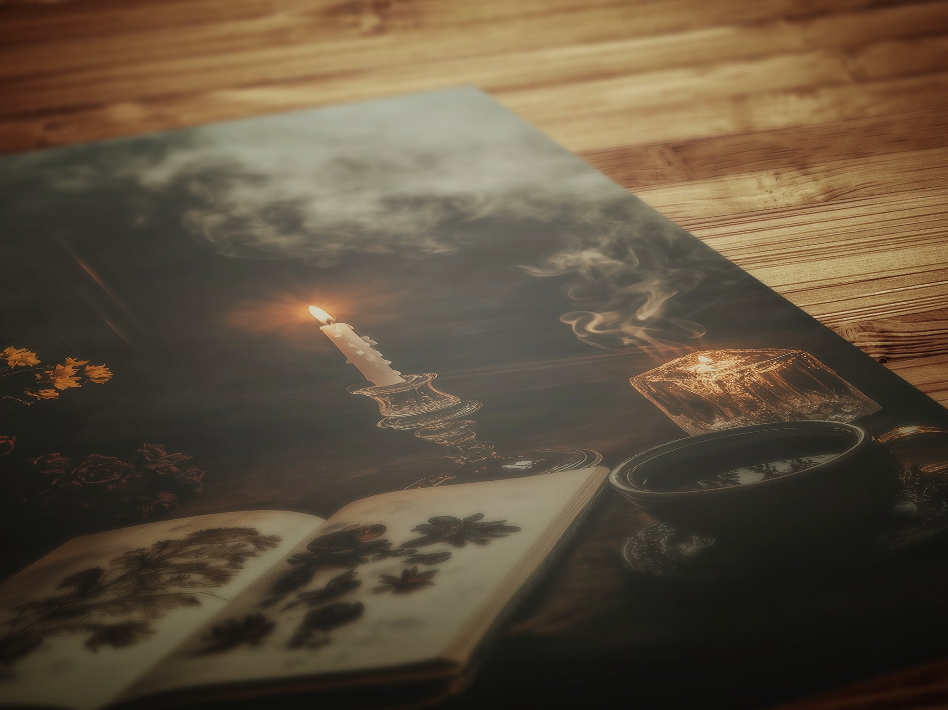 This richly detailed wall art print captures a still life scene filled with gothic atmosphere and cottagecore charm. A flickering candle, herbal tea, dried flowers, and a pressed botanical book evoke quiet study in a moody, romantic setting, perfect for lovers of the occult, dark academia, and old-world style.