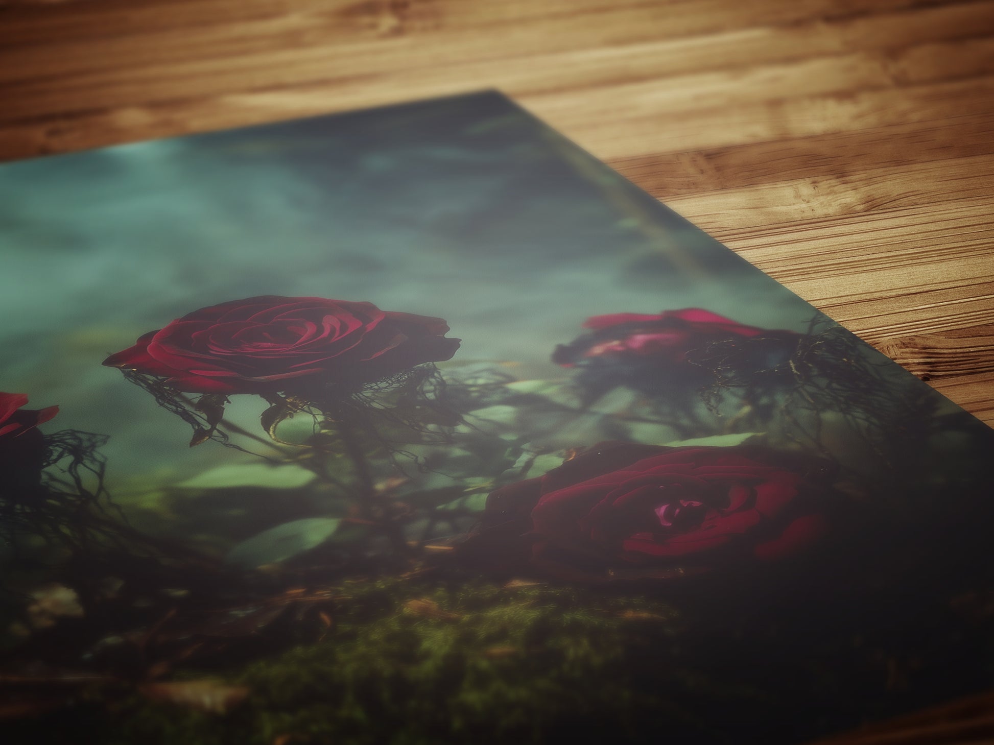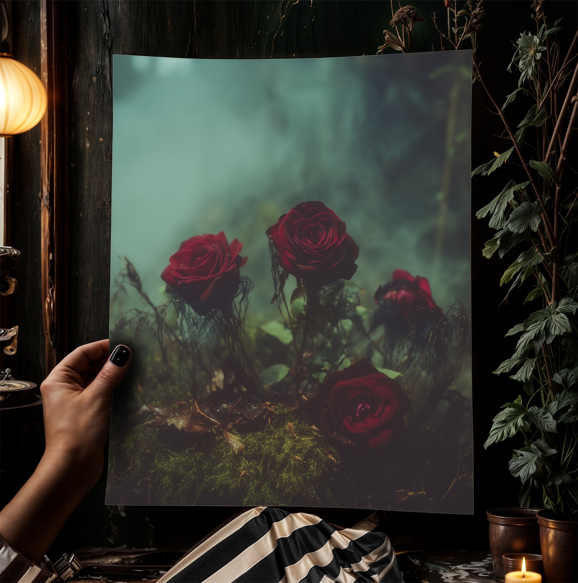 A moody, romantic rose print designed to complement gothic interiors, dark cottagecore spaces, and vintage-inspired rooms. This floral art print features deep red roses blooming against a misty backdrop, capturing the beauty of nature with a haunting, ethereal tone.